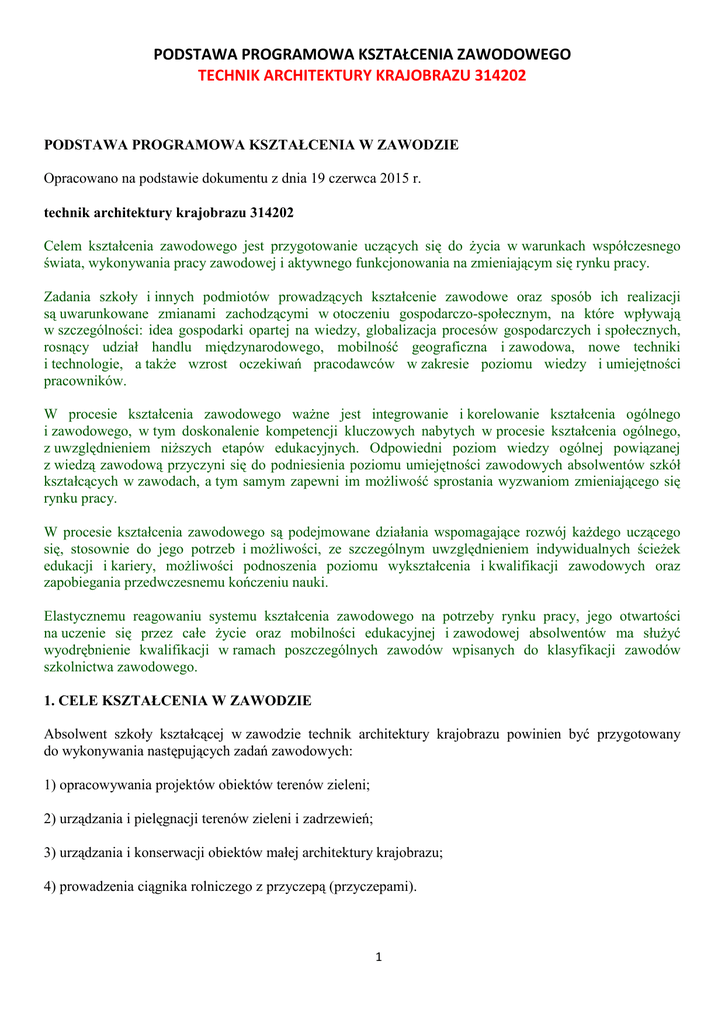 PODSTAWA PROGRAMOWA KSZTAŁCENIA ZAWODOWEGO TECHNIK ARCHITEKTURY KRAJOBRAZU 314202 PODSTAWA PROGRAMOWA KSZTAŁCENIA W ZAWODZIE Opracowano na podstawie dokumentu z dnia 19 czerwca 2015 r. technik architektury krajobrazu 314202 Celem kształcenia zawodowego jest przygotowanie uczących się do życia w warunkach współczesnego świata, wykonywania pracy zawodowej i aktywnego funkcjonowania na zmieniającym się rynku pracy. Zadania szkoły i innych podmiotów prowadzących kształcenie zawodowe oraz sposób ich realizacji są uwarunkowane zmianami zachodzącymi w otoczeniu gospodarczo-społecznym, na które wpływają w szczególności: idea gospodarki opartej na wiedzy, globalizacja procesów gospodarczych i społecznych, rosnący udział handlu międzynarodowego, mobilność geograficzna i zawodowa, nowe techniki i technologie, a także wzrost oczekiwań pracodawców w zakresie poziomu wiedzy i umiejętności pracowników. W procesie kształcenia zawodowego ważne jest integrowanie i korelowanie kształcenia ogólnego i zawodowego, w tym doskonalenie kompetencji kluczowych nabytych w procesie kształcenia ogólnego, z uwzględnieniem niższych etapów edukacyjnych. Odpowiedni poziom wiedzy ogólnej powiązanej z wiedzą zawodową przyczyni się do podniesienia poziomu umiejętności zawodowych absolwentów szkół kształcących w zawodach, a tym samym zapewni im możliwość sprostania wyzwaniom zmieniającego się rynku pracy. W procesie kształcenia zawodowego są podejmowane działania wspomagające rozwój każdego uczącego się, stosownie do jego potrzeb i możliwości, ze szczególnym uwzględnieniem indywidualnych ścieżek edukacji i kariery, możliwości podnoszenia poziomu wykształcenia i kwalifikacji zawodowych oraz zapobiegania przedwczesnemu kończeniu nauki. Elastycznemu reagowaniu systemu kształcenia zawodowego na potrzeby rynku pracy, jego otwartości na uczenie się przez całe życie oraz mobilności edukacyjnej i zawodowej absolwentów ma służyć wyodrębnienie kwalifikacji w ramach poszczególnych zawodów wpisanych do klasyfikacji zawodów szkolnictwa zawodowego. 1. CELE KSZTAŁCENIA W ZAWODZIE Absolwent szkoły kształcącej w zawodzie technik architektury krajobrazu powinien być przygotowany do wykonywania następujących zadań zawodowych: 1) opracowywania projektów obiektów terenów zieleni; 2) urządzania i pielęgnacji terenów zieleni i zadrzewień; 3) urządzania i konserwacji obiektów małej architektury krajobrazu; 4) prowadzenia ciągnika rolniczego z przyczepą (przyczepami). 1 2. EFEKTY KSZTAŁCENIA Do wykonywania wyżej wymienionych zadań zawodowych niezbędne jest osiągnięcie zakładanych efektów kształcenia, na które składają się: 1) efekty kształcenia wspólne dla wszystkich zawodów; (BHP). Bezpieczeństwo i higiena pracy Uczeń: 1) rozróżnia pojęcia związane z bezpieczeństwem i higieną pracy, ochroną przeciwpożarową, ochroną środowiska i ergonomią; 2) rozróżnia zadania i uprawnienia instytucji oraz służb działających w zakresie ochrony pracy i ochrony środowiska w Polsce; 3) określa prawa i obowiązki pracownika oraz pracodawcy w zakresie bezpieczeństwa i higieny pracy; 4) przewiduje zagrożenia dla zdrowia i życia człowieka oraz mienia i środowiska związane z wykonywaniem zadań zawodowych; 5) określa zagrożenia związane z występowaniem szkodliwych czynników w środowisku pracy; 6) określa skutki oddziaływania czynników szkodliwych na organizm człowieka; 7) organizuje stanowisko pracy zgodnie z obowiązującymi wymaganiami ergonomii, przepisami bezpieczeństwa i higieny pracy, ochrony przeciwpożarowej i ochrony środowiska; 8) stosuje środki ochrony indywidualnej i zbiorowej podczas wykonywania zadań zawodowych; 9) przestrzega zasad bezpieczeństwa i higieny pracy oraz stosuje przepisy prawa dotyczące ochrony przeciwpożarowej i ochrony środowiska; 10) udziela pierwszej pomocy poszkodowanym w wypadkach przy pracy oraz w stanach zagrożenia zdrowia i życia. (PDG). Podejmowanie i prowadzenie działalności gospodarczej Uczeń: 1) stosuje pojęcia z obszaru funkcjonowania gospodarki rynkowej; 2) stosuje przepisy prawa pracy, przepisy prawa dotyczące ochrony danych osobowych oraz przepisy prawa podatkowego i prawa autorskiego; 3) stosuje przepisy prawa dotyczące prowadzenia działalności gospodarczej; 4) rozróżnia przedsiębiorstwa i instytucje występujące w branży i powiązania między nimi; 5) analizuje działania prowadzone przez przedsiębiorstwa funkcjonujące w branży; 6) inicjuje wspólne przedsięwzięcia z różnymi przedsiębiorstwami z branży; 2 7) przygotowuje dokumentację niezbędną do uruchomienia i prowadzenia działalności gospodarczej; 8) prowadzi korespondencję związaną z prowadzeniem działalności gospodarczej; 9) obsługuje urządzenia biurowe oraz stosuje programy komputerowe wspomagające prowadzenie działalności gospodarczej; 10) planuje i podejmuje działania marketingowe prowadzonej działalności gospodarczej; 11) optymalizuje koszty i przychody prowadzonej działalności gospodarczej. (JOZ). Język obcy ukierunkowany zawodowo Uczeń: 1) posługuje się zasobem środków językowych (leksykalnych, gramatycznych, ortograficznych oraz fonetycznych), umożliwiających realizację zadań zawodowych; 2) interpretuje wypowiedzi dotyczące wykonywania typowych czynności zawodowych artykułowane powoli i wyraźnie, w standardowej odmianie języka; 3) analizuje i interpretuje krótkie teksty pisemne dotyczące wykonywania typowych czynności zawodowych; 4) formułuje krótkie i zrozumiałe wypowiedzi oraz teksty pisemne umożliwiające komunikowanie się w środowisku pracy; 5) korzysta z obcojęzycznych źródeł informacji. (KPS). Kompetencje personalne i społeczne Uczeń: 1) przestrzega zasad kultury i etyki; 2) jest kreatywny i konsekwentny w realizacji zadań; 3) przewiduje skutki podejmowanych działań; 4) jest otwarty na zmiany; 5) potrafi radzi