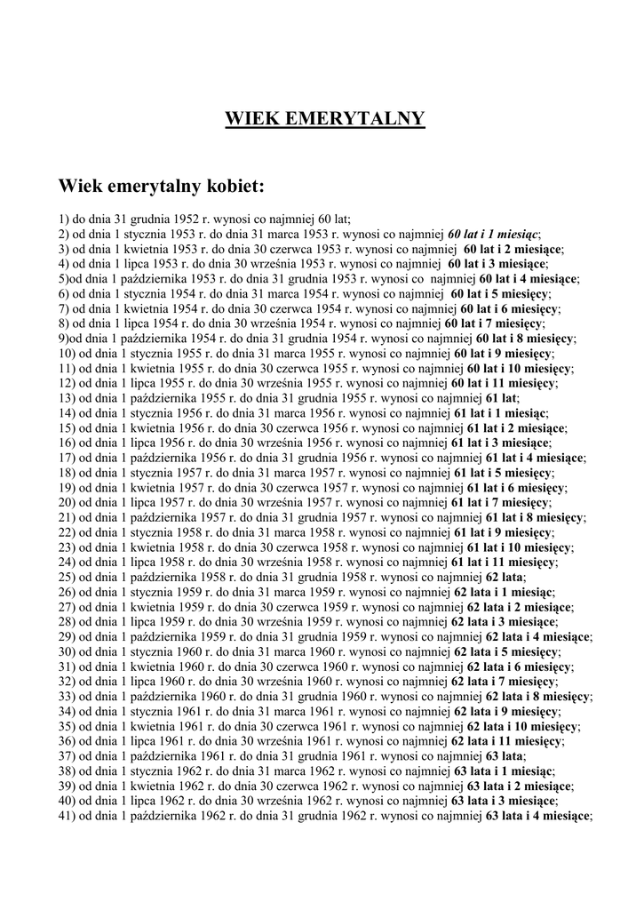 WIEK EMERYTALNY Wiek emerytalny kobiet: 1) do dnia 31 grudnia 1952 r. wynosi co najmniej 60 lat; 2) od dnia 1 stycznia 1953 r. do dnia 31 marca 1953 r. wynosi co najmniej 60 lat i 1 miesiąc; 3) od dnia 1 kwietnia 1953 r. do dnia 30 czerwca 1953 r. wynosi co najmniej 60 lat i 2 miesiące; 4) od dnia 1 lipca 1953 r. do dnia 30 września 1953 r. wynosi co najmniej 60 lat i 3 miesiące; 5)od dnia 1 października 1953 r. do dnia 31 grudnia 1953 r. wynosi co najmniej 60 lat i 4 miesiące; 6) od dnia 1 stycznia 1954 r. do dnia 31 marca 1954 r. wynosi co najmniej 60 lat i 5 miesięcy; 7) od dnia 1 kwietnia 1954 r. do dnia 30 czerwca 1954 r. wynosi co najmniej 60 lat i 6 miesięcy; 8) od dnia 1 lipca 1954 r. do dnia 30 września 1954 r. wynosi co najmniej 60 lat i 7 miesięcy; 9)od dnia 1 października 1954 r. do dnia 31 grudnia 1954 r. wynosi co najmniej 60 lat i 8 miesięcy; 10) od dnia 1 stycznia 1955 r. do dnia 31 marca 1955 r. wynosi co najmniej 60 lat i 9 miesięcy; 11) od dnia 1 kwietnia 1955 r. do dnia 30 czerwca 1955 r. wynosi co najmniej 60 lat i 10 miesięcy; 12) od dnia 1 lipca 1955 r. do dnia 30 września 1955 r. wynosi co najmniej 60 lat i 11 miesięcy; 13) od dnia 1 października 1955 r. do dnia 31 grudnia 1955 r. wynosi co najmniej 61 lat; 14) od dnia 1 stycznia 1956 r. do dnia 31 marca 1956 r. wynosi co najmniej 61 lat i 1 miesiąc; 15) od dnia 1 kwietnia 1956 r. do dnia 30 czerwca 1956 r. wynosi co najmniej 61 lat i 2 miesiące; 16) od dnia 1 lipca 1956 r. do dnia 30 września 1956 r. wynosi co najmniej 61 lat i 3 miesiące; 17) od dnia 1 października 1956 r. do dnia 31 grudnia 1956 r. wynosi co najmniej 61 lat i 4 miesiące; 18) od dnia 1 stycznia 1957 r. do dnia 31 marca 1957 r. wynosi co najmniej 61 lat i 5 miesięcy; 19) od dnia 1 kwietnia 1957 r. do dnia 30 czerwca 1957 r. wynosi co najmniej 61 lat i 6 miesięcy; 20) od dnia 1 lipca 1957 r. do dnia 30 września 1957 r. wynosi co najmniej 61 lat i 7 miesięcy; 21) od dnia 1 października 1957 r. do dnia 31 grudnia 1957 r. wynosi co najmniej 61 lat i 8 miesięcy; 22) od dnia 1 stycznia 1958 r. do dnia 31 marca 1958 r. wynosi co najmniej 61 lat i 9 miesięcy; 23) od dnia 1 kwietnia 1958 r. do dnia 30 czerwca 1958 r. wynosi co najmniej 61 lat i 10 miesięcy; 24) od dnia 1 lipca 1958 r. do dnia 30 września 1958 r. wynosi co najmniej 61 lat i 11 miesięcy; 25) od dnia 1 października 1958 r. do dnia 31 grudnia 1958 r. wynosi co najmniej 62 lata; 26) od dnia 1 stycznia 1959 r. do dnia 31 marca 1959 r. wynosi co najmniej 62 lata i 1 miesiąc; 27) od dnia 1 kwietnia 1959 r. do dnia 30 czerwca 1959 r. wynosi co najmniej 62 lata i 2 miesiące; 28) od dnia 1 lipca 1959 r. do dnia 30 września 1959 r. wynosi co najmniej 62 lata i 3 miesiące; 29) od dnia 1 października 1959 r. do dnia 31 grudnia 1959 r. wynosi co najmniej 62 lata i 4 miesiące; 30) od dnia 1 stycznia 1960 r. do dnia 31 marca 1960 r. wynosi co najmniej 62 lata i 5 miesięcy; 31) od dnia 1 kwietnia 1960 r. do dnia 30 czerwca 1960 r. wynosi co najmniej 62 lata i 6 miesięcy; 32) od dnia 1 lipca 1960 r. do dnia 30 września 1960 r. wynosi co najmniej 62 lata i 7 miesięcy; 33) od dnia 1 października 1960 r. do dnia 31 grudnia 1960 r. wynosi co najmniej 62 lata i 8 miesięcy; 34) od dnia 1 stycznia 1961 r. do dnia 31 marca 1961 r. wynosi co najmniej 62 lata i 9 miesięcy; 35) od dnia 1 kwietnia 1961 r. do dnia 30 czerwca 1961 r. wynosi co najmniej 62 lata i 10 miesięcy; 36) od dnia 1 lipca 1961 r. do dnia 30 września 1961 r. wynosi co najmniej 62 lata i 11 miesięcy; 37) od dnia 1 października 1961 r. do dnia 31 grudnia 1961 r. wynosi co najmniej 63 lata; 38) od dnia 1 stycznia 1962 r. do dnia 31 marca 1962 r. wynosi co najmniej 63 lata i 1 miesiąc; 39) od dnia 1 kwietnia 1962 r. do dnia 30 czerwca 1962 r. wynosi co najmniej 63 lata i 2 miesiące; 40) od dnia 1 lipca 1962 r. do dnia 30 września 1962 r. wynosi co najmniej 63 lata i 3 miesiące; 41) od dnia 1 października 1962 r. do dnia 31 grudnia 1962 r. wynosi co najmniej 63 lata i 4 miesiące; 42) od dnia 1 stycznia 1963 r. do dnia 31 marca 1963 r. wynosi co najmniej 63 lata i 5 miesięcy; 43) od dnia 1 kwietnia 1963 r. do dnia 30 czerwca 1963 r. wynosi co najmniej 63 lata i 6 miesięcy; 44) od dnia 1 lipca 1963 r. do dnia 30 września 1963 r. wynosi co najmniej 63 lata i 7 miesięcy; 45) od dnia 1 października 1963 r. do dnia 31 grudnia 1963 r. wynosi co najmniej 63 lata i 8 miesięcy; 46) od dnia 1 stycznia 1964 r. do dnia 31 marca 1964 r. wynosi co najmniej 63 lata i 9 miesięcy; 47) od dnia 1 kwietnia 1964 r. do dnia 30 czerwca 1964 r. wynosi co najmniej 63 lata i 10 miesięcy; 48) od dnia 1 lipca 1964 r. do dnia 30 września 1964 r. wynosi co najmniej 63 lata i 11 miesięcy; 49) od dnia 1 października 1964 r. do dnia 31 grudnia 1964 r. wynosi co najmniej 64 lata; 50) od dnia 1 stycznia 1965 r. do dnia 31 marca 1965 r. wynosi co najmniej 64 lata i 1 miesiąc; 51) od dnia 1 kwietnia 1965 r. do dnia 30 czerwca 1965 r. wynosi co najmniej 64 lata i 2 miesiące; 52) od dnia 1 lipca 1965 r. do dnia 30 września 1965 r. wynosi co najmniej 64 lata i 3 miesiące; 53) od dnia 1 października 1965 r. do dnia 31 grudnia 1965 r. wynosi co najmniej 64 lata i 4 miesiące; 54) od dnia 1 stycznia 1966 r. do dnia 31 marca 1966 r. wynosi co najmniej 64 lata i 5 miesięcy; 55) od dnia 1 kwietnia 1966 r. do dnia 30 czerwca 1966 r. wynosi co najmniej 64 lata i 6 miesięcy; 56) od dnia 1 lipca 1966 r. do dnia 30 września 1966 r. wynosi co najmniej 64 lata i 7 miesięcy; 57) od dnia 1 października 1966 r. do dnia 31 grudnia 1966 r. wynosi co najmniej 64 lata i 8 miesięcy; 58) od dnia 1 stycznia 1967 r. do dnia 31 marca 1967 r. wynosi co najmniej 64 lata i 9 miesięcy; 59) od dnia 1 kwietnia 1967 r. do dnia 30 czerwca 1967 r. wynosi co najmniej 64 lata i 10 miesięcy; 60) od dnia 1 lipca 1967 r. do dnia 30 września 1967 r. wynosi co najmniej 64 lata i 11 miesięcy; 61) od dnia 1 października 1967 r. do dnia 31 grudnia 1967 r.