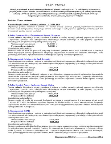 Z E S TAWI E N I E dotacji przyznanych w wyniku otwartego konkursu ofert na realizację w 2017 r. zadań gminy o charakterze pożytku publicznego z zakresu przeciwdziałania uzależnieniom i patologiom społecznym, pomocy społecznej, ochrony i promocji zdrowia, rehabilitacji społecznej i zawodowej osób niepełnosprawnych, promocji i organizacji wolontariatu, przeciwdziałania przemocy w rodzinie Zadanie: Pomoc społeczna Kwota zabezpieczona na realizację zadania – 23.000,00 zł Organizacja pomocy rodzinom i osobom w trudnej sytuacji życiowej, poprzez pozyskiwanie i wydawanie żywności oraz zabezpieczenie niezbędnego sprzętu domowego w celu poprawy egzystencji potrzebujących lub prowadzenie punktu pomocy socjalnej. 1. Polski Czerwony Krzyż Świętokrzyski Zarząd Okręgowy Nazwa zadania: Organizacja pomocy rodzinom i osobom w trudnej sytuacji życiowej, poprzez pozyskiwanie i wydawanie żywności oraz zabezpieczenie niezbędnego sprzętu domowego w celu poprawy egzystencji potrzebujących lub prowadzenie punktu pomocy socjalnej. Wnioskowana kwota dotacji: 16.000,00 zł Przyznana kwota dotacji: 7.000,00 zł Uzasadnienie wyboru oferty: Stowarzyszenie od wielu lat prowadzi powyższą działalność, posiada bardzo duże doświadczenie w realizacji zadań dotyczących pomocy społecznych. Dysponuje odpowiednim wkładem oraz zasobami kadrowymi, które gwarantują prawidłowe wykonanie zadania. Oferta spełnia wymogi określone w przepisach. 2. Stowarzyszenie Świętokrzyski Bank Żywności Organizacja pomocy rodzinom i osobom w trudnej sytuacji życiowej, poprzez pozyskiwanie i wydawanie żywności oraz zabezpieczenie niezbędnego sprzętu domowego w celu poprawy egzystencji potrzebujących lub prowadzenie punktu pomocy socjalnej. Wnioskowana kwota dotacji: 5.000,00 zł Przyznana kwota dotacji: 3.000,00 zł Uzasadnienie wyboru oferty: Stowarzyszenie prowadzi działalność związaną z pozyskiwaniem, magazynowaniem i wydawaniem żywności dla mieszkańców województwa świętokrzyskiego poprzez inne organizacje pozarządowe. Dysponuje odpowiednim lokalem oraz zasobami kadrowymi, które gwarantują prawidłowe wykonanie zadania. Oferta spełnia wymogi określone w przepisach. 3. Polski Komitet Pomocy Społecznej Zarząd Miejski Nazwa zadania: Organizacja pomocy rodzinom i osobom w trudnej sytuacji życiowej, poprzez pozyskiwanie i wydawanie żywności oraz zabezpieczenie niezbędnego sprzętu domowego w celu poprawy egzystencji potrzebujących lub prowadzenie punktu pomocy socjalnej. Wnioskowana kwota dotacji: 10.000,00 zł Przyznana kwota dotacji: 4.000,00 zł Uzasadnienie wyboru oferty: Stowarzyszenie od wielu lat prowadzi działalność związaną z pozyskiwaniem i wydawaniem ubrań, mebli i sprzętu RTV AGD. Dodatkowo organizuje imprezy dla biednych dzieci z terenu naszego miasta. Dysponuje odpowiednim lokalem oraz zasobami kadrowymi, które gwarantują prawidłowe wykonanie zadania. Oferta spełnia wymogi określone w przepisach. 4. Stowarzyszenie ROMI Organizacja pomocy rodzinom i osobom w trudnej sytuacji życiowej, poprzez pozyskiwanie i wydawanie żywności oraz zabezpieczenie niezbędnego sprzętu domowego w celu poprawy egzystencji potrzebujących lub prowadzenie punktu pomocy socjalnej. Wnioskowana kwota dotacji: 23.000,00 zł Przyznana kwota dotacji: 9.000,00 zł Uzasadnienie wyboru oferty: Stowarzyszenie prowadzi działalność związaną z pozyskiwaniem, magazynowaniem, wydawaniem i dostarczaniem do osób niepełnosprawnych żywności. Produkty dla mieszkańców Starachowic odbierane są ze Świętokrzyskiego Banku Żywności w Ostrowcu Świętokrzyskim. . Dysponuje odpowiednim lokalem oraz zasobami kadrowymi, które gwarantują prawidłowe wykonanie zadania. Oferta spełnia wymogi określone w przepisach. Przyznano: 23.000,00 zł Pozostało: 0,00 zł Zadanie: Ochrona i Promocja Zdrowia Kwota zabezpieczona na realizację zadania - 10.000,00 zł Realizacja programów edukacyjnych w zakresie udzielania pierwszej pomocy przedmedycznej, prowadzenie szkoleń dla młodzieży, kursów pierwszej pomocy, prowadzenie akcji promujących zdrowy tryb życia oraz propagujących honorowe krwiodawstwo. 1. Polski Czerwony Krzyż Świętokrzyski Zarząd Okręgowy Nazwa zadania: Realizacja programów edukacyjnych w zakresie udzielania pierwszej pomocy przedmedycznej, prowadzenie szkoleń dla młodzieży, kursów pierwszej pomocy, prowadzenie akcji promujących zdrowy tryb życia oraz propagujących honorowe krwiodawstwo. Wnioskowana kwota dotacji: 10.000,00 zł Przyznana kwota dotacji: 6.000,00 zł Uzasadnienie wyboru oferty: Stowarzyszenie od wielu lat prowadzi powyższą działalność. Dysponuje odpowiednim wkładem, oraz zasobami kadrowymi, które gwarantują prawidłowe wykonanie zadania. Oferta spełnia wymogi określone w przepisach. 2. Stowarzyszenie Bezpieczny Powiat Starachowicki i Związek Harcerstwa Polskiego Chorągiew Kielecka Hufiec Starachowice – oferta wspólna Nazwa zadania: Realizacja programów edukacyjnych w zakresie udzielania pierwszej pomocy przedmedycznej, prowadzenie szkoleń dla młodzieży, kursów pierwszej pomocy, prowadzenie akcji promujących zdrowy tryb życia oraz propagujących honorowe krwiodawstwo. Wnioskowana kwota dotacji: 10.000,00 zł Przyznana kwota dotacji: 4.000,00 zł Uzasadnienie wyboru oferty: Organizacje posiadają doświadczenie w realizacji tego typu zadań, dysponują odpowiednim wkładem oraz zasobami kadrowymi, które gwarantują prawidłowe wykonanie zadania. Oferta spełnia wymogi określone w przepisach. Komisja rozpatrując ofertę stwierdziła, że przedstawiony kosztorys jest zbyt ogólny, co spowodowało przyznanie mniejszej ilości punktów. Przyznano: 10.000,00 zł Pozostało: 0,00 zł Zadanie: Przeciwdziałanie Uzależnieniom i Patologiom Społecznym Wsparcie działalności organizacji pozarządowych realizujących zadania z zakresu profilaktyki i rozwiązywania problemów alkoholowych, pomocy rodzinie dysfunkcyjnej (w ty