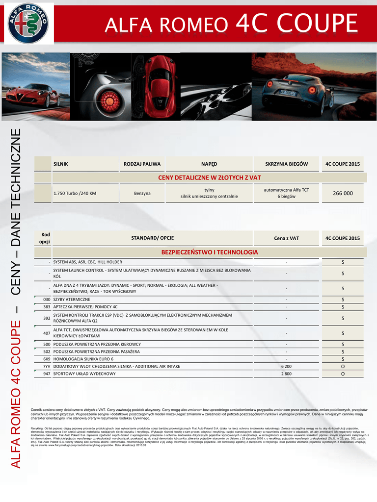 ALFA ROMEO 4C COUPE – CENY – DANE TECHNICZNE ALFA ROMEO SILNIK RODZAJ PALIWA 4C COUPE NAPĘD SKRZYNIA BIEGÓW 4C COUPE 2015 automatyczna Alfa TCT 6 biegów 266 000 Cena z VAT 4C COUPE 2015 - SYSTEM ABS, ASR, CBC, HILL HOLDER - S SYSTEM LAUNCH CONTROL - SYSTEM UŁATWIAJĄCY DYNAMICZNE RUSZANIE Z MIEJSCA BEZ BLOKOWANIA KÓŁ - S - S 030 SZYBY ATERMICZNE - 383 APTECZKA PIERWSZEJ POMOCY 4C - S S CENY DETALICZNE W ZŁOTYCH Z VAT 1.750 Turbo /240 KM Kod opcji tylny silnik umieszczony centralnie Benzyna STANDARD/ OPCJE BEZPIECZEŃSTWO I TECHNOLOGIA - ALFA DNA Z 4 TRYBAMI JAZDY: DYNAMIC - SPORT; NORMAL - EKOLOGIA; ALL WEATHER BEZPIECZEŃSTWO; RACE - TOR WYŚCIGOWY 392 SYSTEM KONTROLI TRAKCJI ESP (VDC) Z SAMOBLOKUJĄCYM ELEKTRONICZNYM MECHANIZMEM RÓŻNICOWYM ALFA Q2 - S 407 ALFA TCT, DWUSPRZĘGŁOWA AUTOMATYCZNA SKRZYNIA BIEGÓW ZE STEROWANIEM W KOLE KIEROWNICY ŁOPATKAMI - S 500 PODUSZKA POWIETRZNA PRZEDNIA KIEROWCY - 502 PODUSZKA POWIETRZNA PRZEDNIA PASAŻERA - S S S O O 6X9 HOMOLOGACJA SILNIKA EURO 6 - 7YV DODATKOWY WLOT CHŁODZENIA SILNIKA - ADDITIONAL AIR INTAKE 6 200 947 SPORTOWY UKŁAD WYDECHOWY 2 800 Cennik zawiera ceny detaliczne w złotych z VAT. Ceny zawierają podatek akcyzowy. Ceny mogą ulec zmianom bez uprzedniego zawiadomienia w przypadku zmian cen przez producenta, zmian podatkowych, przepisów celnych lub innych przyczyn. Wyposażenie seryjne i dodatkowe poszczególnych modeli może ulegać zmianom w zależności od potrzeb poszczególnych rynków i wymogów prawnych. Dane w niniejszym cenniku mają charakter orientacyjny i nie stanowią oferty w rozumieniu Kodeksu Cywilnego. Recykling: Od lat poprzez ciągłą poprawę procesów produkcyjnych oraz wytwarzanie produktów coraz bardziej proekologicznych Fiat Auto Poland S.A. działa na rzecz ochrony środowiska naturalnego. Zwraca szczególną uwagę na to, aby do konstrukcji pojazdów, elementów wyposażenia i ich części używać materiałów nadających się do odzysku i recyklingu. Wykazuje również troskę o sam proces odzysku i recyklingu części stanowiących odpady w rozumieniu przepisów o odpadach, tak aby zmniejszyć ich negatywny wpływ na środowisko naturalne. Fiat Auto Poland S.A. zapewnia zgodność swych działań z wymaganiami przepisów o ochronie środowiska dotyczących pojazdów wycofywanych z eksploatacji, w szczególności w zakresie usuwania wszelkich płynów i innych czynności związanych z ich demontażem. Właściciel pojazdu wycofanego oz eksploatacji ma obowiązek przekazać go do stacji demontażu lub punktu zbierania pojazdów stosownie do Ustawy z 25 stycznia 2005 r. o recyklingu pojazdów wycofanych z eksploatacji (Dz.U. nr 25, poz. 202, z późn. zm.). Fiat Auto Poland S.A. tworzy własną sieć punktów zbiórki i demontażu, rekomendując korzystanie z jej usług. Informacje o recyklingu pojazdów, ich konstrukcji zgodnej z przepisami o recyklingu i lista punktów zbierania pojazdów wycofanych z eksploatacji znajdują się na stronie www.fiat.pl/usługi-posprzedażne/recykling-pojazdów. Data aktualizacji 2015.03 ALFA ROMEO 4C COUPE – CENY – DANE TECHNICZNE ALFA ROMEO Kod opcji 4C COUPE STANDARD/ OPCJE Cena z VAT 4C COUPE 2015 008 CENTRALNY ZAMEK STEROWANY Z PILOTA - 011 REGULACJA KIEROWNICY NA WYSOKOŚĆ I GŁĘBOKOŚĆ - S S 025 KLIMATYZACJA MANUALNA - S 028 SZYBY PRZEDNIE STEROWANE ELEKTRYCZNIE - 041 LUSTERKA ZEWNĘTRZNE STEROWANE ELEKTRYCZNIE - 050 PRĘDKOŚCIOMIERZ W KILOMETRACH - 228 ELEKTRYCZNY SYSTEM BLOKADY DRZWI - 320 KOŁO KIEROWNICY CZARNE OBSZYTE SKÓRĄ REGULOWANE NA WYSOKOŚĆ I GŁĘBOKOŚĆ - 365 CZUJNIK POMIARU CIŚNIENIA W OPONACH - 388 ULTRADŹWIĘKOWY SYSTEM ANTY KRADZIEŻOWY I DRUGI KLUCZ DO STEROWANIA Z PILOTEM - 428 SZYBY STEROWANE ELEKTRYCZNIE + ELEKTRYCZNA BLOKADA DRZWI - 4B0 UCHWYT NA KUBEK - S S S S S S S S S WYŚWIETLACZ TFT 4GF ZAWIERAJĄCY INFORMACJE DOTYCZĄCE TURBODOŁADOWANIA, TEMPERATURY OLEJU I PRZYŚPIESZENIA - S S S S S S S O O O O O O O O O KOMFORT I FUNKCJONALNOŚĆ 4YV DODATKOWY KLUCZYK STEROWANY PILOTEM - 5WL POKROWIEC NA SAMOCHÓD Z LOGIEM ALFA 4C - 5WQ CZARNE WELUROWE DYWANIKI IGŁOWE. (LOGO 4C) - MOCOWANE DO PODŁOGI - 6DD DVD Z INSTRUKCJĄ OBSŁUGI - 823 DODATKOWE GNIAZDO 12V - 924 ZABEZPIECZENIE SAMOCHODU PODCZAS TRANSPORTU PEŁNE - 416 TEMPOMAT - 52B CZUJNIKI PARKOWANIA TYLNE - 665 ZESTAW DLA PALĄCYCH (ZAPALNICZKA + POPIELNICZKA) - 858 INSTRUKCJA W JĘZYKU POLSKIM - 321 SPORTOWE KOŁO KIEROWNICY OBSZYTE SKÓRĄ 2 000 377 ZESTAW SPORTOWEGO ZAWIESZENIA 4 900 626 REGULACJA SIEDZENIA PASAŻERA 1 100 775 AKUMULATOR /BATTERY MAINTENANCE 2 600 7A4 SKÓRZANA OCHRONA NADWOZIA 6 600 Cennik zawiera ceny detaliczne w złotych z VAT. Ceny zawierają podatek akcyzowy. Ceny mogą ulec zmianom bez uprzedniego zawiadomienia w przypadku zmian cen przez producenta, zmian podatkowych, przepisów celnych lub innych przyczyn. Wyposażenie seryjne i dodatkowe poszczególnych modeli może ulegać zmianom w zależności od potrzeb poszczególnych rynków i wymogów prawnych. Dane w niniejszym cenniku mają charakter orientacyjny i nie stanowią oferty w rozumieniu Kodeksu Cywilnego. Recykling: Od lat poprzez ciągłą poprawę procesów produkcyjnych oraz wytwarzanie produktów coraz bardziej proekologicznych Fiat Auto Poland S.A. działa na rzecz ochrony środowiska naturalnego. Zwraca szczególną uwagę na to, aby do konstrukcji pojazdów, elementów wyposażenia i ich części używać materiałów nadających się do odzysku i recyklingu. Wykazuje również troskę o sam proces odzysku i recyklingu części stanowiących odpady w rozumieniu przepisów o odpadach, tak aby zmniejszyć ich negatywny wpływ na środowisko naturalne. Fiat Auto Poland S.A. zapewnia zgodność swych działań z wymaganiami przepisów o ochronie środowiska dotyczących pojazdów wycofywanych z eksploatacji, w szczególności w zakresie usuwania wszelkich płynów i innych czynności związanych z ich demontażem. Właściciel pojazdu wycofanego oz eksploatacji ma obowiąze