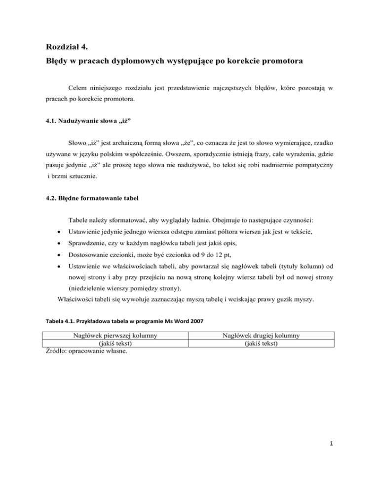 Rozdział 4. Błędy w pracach dyplomowych występujące po korekcie promotora Celem niniejszego rozdziału jest przedstawienie najczęstszych błędów, które pozostają w pracach po korekcie promotora. 4.1. Nadużywanie słowa „iż” Słowo „iż” jest archaiczną formą słowa „że”, co oznacza że jest to słowo wymierające, rzadko używane w języku polskim współcześnie. Owszem, sporadycznie istnieją frazy, całe wyrażenia, gdzie pasuje jedynie „iż” ale proszę tego słowa nie nadużywać, bo tekst się robi nadmiernie pompatyczny i brzmi sztucznie. 4.2. Błędne formatowanie tabel Tabele należy sformatować, aby wyglądały ładnie. Obejmuje to następujące czynności: • Ustawienie jedynie jednego wiersza odstępu zamiast półtora wiersza jak jest w tekście, • Sprawdzenie, czy w każdym nagłówku tabeli jest jakiś opis, • Dostosowanie czcionki, może być czcionka od 9 do 12 pt, • Ustawienie we właściwościach tabeli, aby powtarzał się nagłówek tabeli (tytuły kolumn) od nowej strony i aby przy przejściu na nową stronę kolejny wiersz tabeli był od nowej strony (niedzielenie wierszy pomiędzy strony). Właściwości tabeli się wywołuje zaznaczając myszą tabelę i wciskając prawy guzik myszy. Tabela 4.1. Przykładowa tabela w programie Ms Word 2007 Nagłówek pierwszej kolumny (jakiś tekst) Źródło: opracowanie własne. Nagłówek drugiej kolumny (jakiś tekst) 1 Rysunek 4.1. Przykładowa tabela z wywołanym podręcznym menu właściwości tabeli Źródło: opracowanie własne. Rysunek 4.2. Wygląd menu właściwości tabeli Źródło: opracowanie własne. Z menu pokazanego na rysunku 4.2. proszę wybrać myszką „właściwości tabeli”. Uwaga, istotne jest to, czy zaznaczyli Państwo całą tabelę (cała tabela jest zaznaczona) czy tylko pierwszy wiersz tabeli. Dla całej zaznaczonej tabeli ustawiamy tylko niedzielenie wierszy pomiędzy strony (por rysunek 4.3). 2 Rysunek 4.3. Odhaczanie zgody na dzielenie wierszy pomiędzy strony Źródło: opracowanie własne. Po zaznaczeniu jedynie pierwszego wiersza, zaznaczymy, aby powtarzało go jeżeli tabela będzie przechodziła na nową stronę. Rysunek 4.4. Zaznaczanie powtarzania pierwszego wiersza tabeli w programie MS Word 2007 (proszę zwrócić uwagę, że zaznaczono jedynie pierwszy wiersz tabeli przed wywołanie menu ‘właściwości tabeli’) Źródło: opracowanie własne. 3 W tabeli należy także sprawdzić czcionkę i tabulację. Czcionkę sprawdzamy zaznaczając tabelę i patrząc na czcionkę, jaka się pojawi w okienku Czcionka menu Word 2007. Akapity sprawdzamy patrząc na linijkę. Rysunek 4.5. Sprawdzanie czcionki w tabeli w programie Ms Word 2007 Źródło: opracowanie własne. Rysunek 4.6. Sprawdzanie wielkości odstępów pomiędzy wierszami w tabeli w programie Ms Word 2007 Źródło: opracowanie własne. Na rysunku 4.6 pokazano sposób sprawdzenia odstępów pomiędzy wierszami i odstępów. Czerwona ramka pokazuje zestaw przycisków „Akapit”, w prawym dolnym rogu jest dzyndzelek, po którego wciśnięciu pojawia się menu „Akapit”. Zieloną ramką pokazano gdzie we wspomnianym 4 menu „Akapit” znajdują się przyciski pozwalające ustawić brak dodatkowych odstępów pomiędzy wierszami. Fioletowa ramka pokazuje gdzie ustawia się pojedynczy odstęp pomiędzy wierszami w tabeli. Pomarańczowym kolorem zaznaczono linijkę, która po zaznaczeniu tabeli pokazuje dodatkowe akapity i tabulatory w tabeli. Aby je zlikwidować albo przesunąć, przesuwa się suwaczki na linijce. 4.3. Spacja zaraz po otwarciu nawiasu i przed kropką kończącą zdanie Jeżeli promotor tego wyraźnie nie napisze, Autorzy prac często ignorują konieczność usunięcia spacji zaraz po otwarciu nawiasu. Aby pokazać w czym tkwi problem, najłatwiej pokazać to na przykładzie. Oto zdanie ( stworzone przez autora niniejszego opracowania) w którym występuje spacja zaraz po otwarciu nawiasu oraz spacja przed kropką . A tutaj pokazano (ponownie, zdanie stworzone przez autora opracowania), jak być powinno: żadnej spacji po otwarciu nawiasu oraz bez spacji przed kropką. 4.4. Stosowanie dużej litery do rzeczowników nie oznaczających nazw własnych Jeżeli rzeczownik nie jest nazwą własną, nie należy pisać go z dużej litery. Rzeczowniki takie jak: spółka, emitent, przedsiębiorstwo, zarząd, rada nadzorcza, kierownik, procedura nie są nazwami własnymi i nie należy pisać ich z dużej litery, chyba że kontekst wyraźnie wskazuje że jednak w jakiś sposób stały się nazwą własną (trudno sobie taki kontekst wyobrazić, ale hipotetycznie nie należy wykluczać takiej możliwości). Pisanie wielu rzeczowników z dużej litery można nazwać Amerykanizmem gdyż faktycznie, w USA wiele rzeczowników zwykłych pisze się z dużej litery. 4.5. Wysyłanie niedopracowanego tekstu do promotora Promotor nie jest telepatą i nie umie ani sprawdzić (bo to nie ma sensu) ani ocenić tekstu jeżeli nie jest on dopracowany. Oto wymyślony fragment pracy, które jednak trafiają do promotorów: „Kredyt bankowy jest jednym z produktów bankowych oferowanych zarówno podmiotom gospodarczym, jak i gospodarstwom domowym. (tutaj dopisać coś więcej….). (tutaj tabela o skali kredytów) Kredyt bankowy różni się od pożyczki tym, że …” Państwa zaufanie do promotora jest wspaniałe i miłe, ale wysyłanie takiego tekstu nie ma sensu. Proszenie o to aby mniej więcej na tekst popatrzeć albo ocenić czy kolejność rozdziałów czy 5 podrozdziałów jest prawidłowa też nie ma sensu. Rozdziały i podrozdziały ustala się na etapie pisania planu pracy, więc potem nie ma potrzeby ich konsultować chyba że uległy zmianie – ale wtedy wysyła się i stary i nowy plan pracy i pyta o akceptację zmian, a nie taki niedopracowany „dziurawiec”. 4.6. Odwoływanie się do obiektów graficznych za pomocą słów „powyższy”, „poniższy”, „powyżej”, „poni