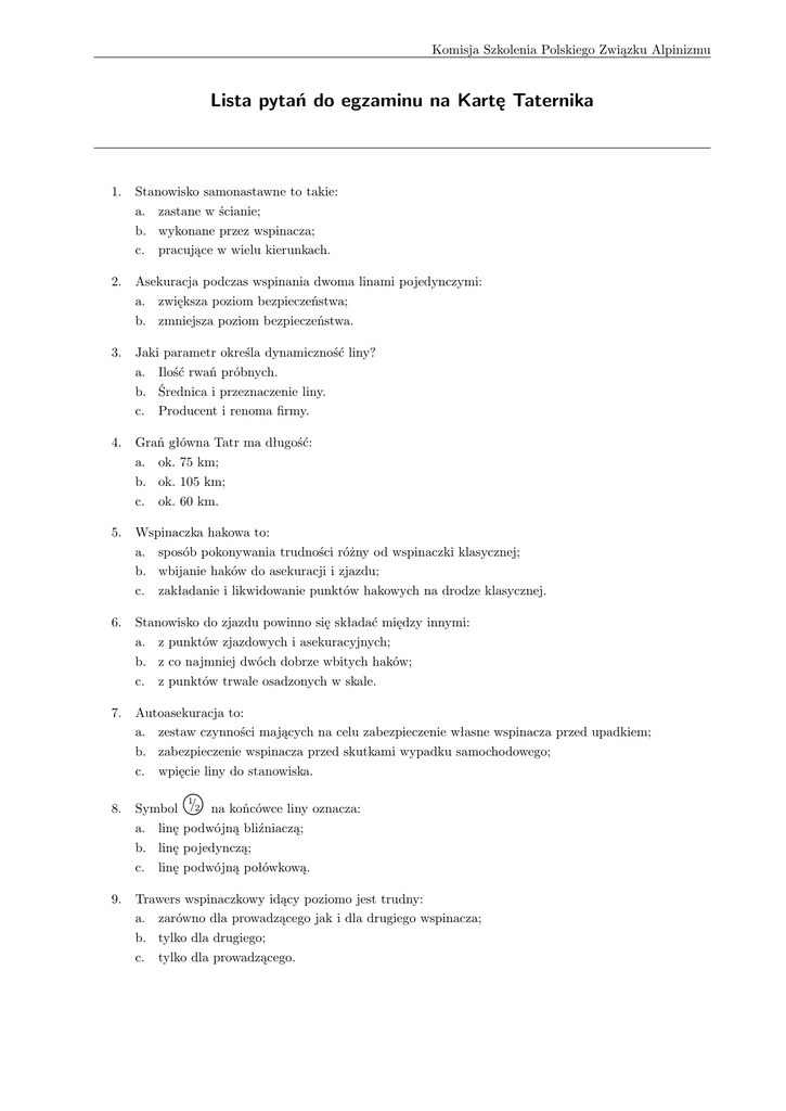 Komisja Szkolenia Polskiego Związku Alpinizmu Lista pytań do egzaminu na Kartę Taternika 1. Stanowisko samonastawne to takie: a. zastane w ścianie; b. wykonane przez wspinacza; c. pracujące w wielu kierunkach. 2. Asekuracja podczas wspinania dwoma linami pojedynczymi: a. zwiększa poziom bezpieczeństwa; b. zmniejsza poziom bezpieczeństwa. 3. Jaki parametr określa dynamiczność liny? a. Ilość rwań próbnych. b. Średnica i przeznaczenie liny. c. Producent i renoma firmy. 4. Grań główna Tatr ma długość: a. ok. 75 km; b. ok. 105 km; c. ok. 60 km. 5. Wspinaczka hakowa to: a. sposób pokonywania trudności różny od wspinaczki klasycznej; b. wbijanie haków do asekuracji i zjazdu; c. zakładanie i likwidowanie punktów hakowych na drodze klasycznej. 6. Stanowisko do zjazdu powinno się składać między innymi: a. z punktów zjazdowych i asekuracyjnych; b. z co najmniej dwóch dobrze wbitych haków; c. z punktów trwale osadzonych w skale. 7. Autoasekuracja to: a. zestaw czynności mających na celu zabezpieczenie własne wspinacza przed upadkiem; b. zabezpieczenie wspinacza przed skutkami wypadku samochodowego; c. wpięcie liny do stanowiska. 8. Symbol a. linę b. linę c. linę 9. 1 /2 na końcówce liny oznacza: podwójną bliźniaczą; pojedynczą; podwójną połówkową. Trawers wspinaczkowy idący poziomo jest trudny: a. zarówno dla prowadzącego jak i dla drugiego wspinacza; b. tylko dla drugiego; c. tylko dla prowadzącego. Lista pytań do egzaminu na Kartę Taternika 10. Po pięciu metrach wspinania założyłeś przelot wspiąłeś się jeszcze pięć metrów i odpadłeś. Wartość WO (współczynnika odpadnięcia) wyniesie: a. 1 b. 2 c. 1,25 11. Drugim co do wysokości szczytem Tatr jest: a. Łomnica; b. Zadni Gerlach; c. Lodowy. 12. Kto dokonał pierwszego polskiego wejścia na Mt. Everest? a. Leszek Cichy i Krzysztof Wielicki b. Wanda Rutkiewicz c. Jerzy Kukuczka 13. Diretissima to: a. droga środkiem ściany; b. droga prowadząca na wierzchołek; c. droga przecinająca spiętrzenie trudności. 14. Schodzenie drogą wspinaczkową jest trudne dla: a. zarówno dla prowadzącego jak i dla drugiego wspinacza; b. tylko dla drugiego; c. tylko dla prowadzącego. 15. Czy trudne lub grożące lotem miejsce lepiej jest pokonywać a. na początku wyciągu wspinaczkowego; b. pod koniec wyciągu wspinaczkowego? 16. Czy w terenie kruchym lepiej jest stosować: a. kostki; b. haki? 17. W jaki sposób uwolnisz się od ciężaru wiszącego partnera na linie aby ocenić sytuację powstała po odpadnięciu? a. Wykonując kluczkę i wpinając linę asekuracyjną do stanowiska na sztywno. b. Wykonując węzeł samozaciskowy z pętli osobistej na linie asekuracyjnej i wpinając pętle osobistą półwyblinką zabezpieczoną węzłem flagowym do stanowiska. c. Blokując przyrząd asekuracyjny węzłem flagowym. 18. Czy przy wyciąganiu partnera przy pomocy metody U długość liny pozostającej do użytku przez ratownika ma znaczenie? a. Tak. b. Nie. 19. Który ze znanych Ci rodzajów lin wspinaczkowych nie nadaje się do wspinaczki w górach? a. Dynamiczna. b. Statyczna. 20. Linę wspinaczkową najlepiej jest przechowywać: a. w plecaku, w stanie zwiniętym; b. w pokoju, powieszoną na ścianie; c. w szafie, w stanie luźnym. strona 2 Lista pytań do egzaminu na Kartę Taternika 21. Wybierasz się na zachodnią ścianę Łomnicy, masz do wyboru kilka lin. Wybierz najbardziej odpowiednią: a. lina połówkowa o długości 80 m; b. lina pojedyncza o długości 50 m; c. lina połówkowa - dwa odcinki po 50 m. 22. Jak powinien a. Aby kask b. Aby kask c. Aby kask być wyregulowany i zapięty system mocowania kasku? przesuwał się do przodu i do tyłu nieznacznie. nie przesuwał się do tyłu i przodu. powodował lekki ucisk na głowie. 23. Jak należy regulować uprząż biodrową? a. Po ubraniu odzieży wierzchniej należy dopasować pas biodrowy. b. Ubrać i dopasować uprząż a następnie uzupełnić ubiór zewnętrzny. 24. Jak optymalnie dowiązać linę do uprzęży biodrowej? a. Węzłem ósemkowym. b. Węzłem ósemkowym zabezpieczonym. c. Kluczką zaciągającą. 25. Kiedy należy używać uprzęży biodrowej i pasa piersiowego? a. Podczas wspinania ciężkim plecakiem powyżej 10 kg. b. Podczas wspinania się na drugiego. c. Podczas wspinania się po linach poręczowych. 26. Wysoki przyrząd zjazdowy to termin oznaczający: a. wpięcie przyrządu zjazdowego powyżej węzła zaciskowego; b. wpięcie przyrządu zjazdowego do uprzęży za pośrednictwem pętli/taśmy; c. wpięcie przyrządu zjazdowego poniżej węzła zaciskowego. 27. Co a. b. c. to jest siła graniczna? Siła wytwarzająca się w linie, działająca na ciało wspinacza. Siła która zrywa linę. Siła podczas której testuje się linę. 28. Do a. b. c. wykonania prostej uprzęży improwizowanej potrzeba: tylko liny; taśm i karabinków; liny i karabinków. 29. Masz do dyspozycji hak typu łyżka i do wyboru dwie identycznie wglądające szczeliny. Wybierz lepszą: a. szczelina pozioma; b. szczelina pionowa. 30. Jaki typ haka najbardziej nadaje się do szerszych szczelin pionowych? a. Tzw. V-kształtny. b. Tzw. knife. 31. Czy można podklinować hak hakiem? a. W żadnym wypadku. b. Tak. strona 3 Lista pytań do egzaminu na Kartę Taternika 32. Prawidłowe wybijanie haka twardego polega na: a. obruszaniu go w szczelinie uderzając energicznie w jego skrajne położenia; b. energicznym krótkim uderzaniu w zmiennych kierunkach. 33. Jakie skutki dla jakości osadzenia haka wbitego wcześniej może mieć wbicie drugiego haka w tę samą szczelinę? a. Nie ma to znaczenia dla jakości osadzenia pierwszego z haków. b. Może osłabić jakość pierwszego z osadzonych haków. 34. Czy można wykorzystać hak, który „nie wszedł” po ucho? a. Nie, w żadnym wypadku. b. Tak, po podjęciu dodatkowych czynności . 35. Co oznacza termin „skrócenie haka”? a. Założenie na wystającym trzonie haka taśmy lub pętli 