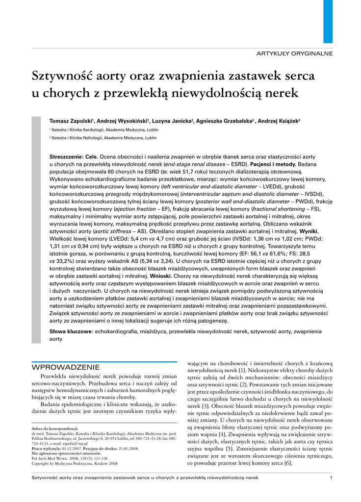 ARTYKUŁY ORYGINALNE Sztywność aorty oraz zwapnienia zastawek serca u chorych z przewlekłą niewydolnością nerek Tomasz Zapolski1, Andrzej Wysokiński1, Lucyna Janicka2, Agnieszka Grzebalska2 , Andrzej Książek2 1 Katedra i Klinika Kardiologii, Akademia Medyczna, Lublin 2 Katedra i Klinika Nefrologii, Akademia Medyczna, Lublin Streszczenie: Cele. Ocena obecności i nasilenia zwapnień w obrębie tkanek serca oraz elastyczności aorty u chorych na przewlekłą niewydolność nerek (end-stage renal disease – ESRD). Pacjenci i metody. Badana populacja obejmowała 60 chorych na ESRD (śr. wiek 51,7 roku) leczonych dializoterapią otrzewnową. Wykonywano echokardiograficzne badanie przezklatkowe, mierząc: wymiar końcowoskurczowy lewej komory, wymiar końcoworozkurczowy lewej komory (left ventricular end-diastolic diameter – LVEDd), grubość końcoworozkurczową przegrody międzykomorowej (interventricular septum end-diastolic diameter – IVSDd), grubość końcoworozkurczową tylnej ściany lewej komory (posterior wall end-diastolic diameter – PWDd), frakcję wyrzutową lewej komory (ejection fraction – EF), frakcję skracania lewej komory (fractional shortening – FS), maksymalny i minimalny wymiar aorty zstępującej, pole powierzchni zastawki aortalnej i mitralnej, okres wyrzucania lewej komory, maksymalną prędkość przepływu przez zastawkę aortalną. Obliczano wskaźnik sztywności aorty (aortic stiffness – AS). Określano stopień zwapnienia zastawki aortalnej i mitralnej. Wyniki. Wielkość lewej komory (LVEDd: 5,4 cm vs 4,7 cm) oraz grubość jej ścian (IVSDd: 1,36 cm vs 1,02 cm; PWDd: 1,31 cm vs 0,94 cm) były większe u chorych na ESRD niż u chorych z grupy kontrolnej. Towarzyszyła temu istotnie gorsza, w porównaniu z grupą kontrolną, kurczliwość lewej komory (EF: 56,1 vs 61,6%; FS: 28,5 vs 33,2%) oraz wyższy wskaźnik AS (5,34 vs 3,24). U chorych na ESRD istotnie częściej niż u chorych z grupy kontrolnej stwierdzano także obecność blaszek miażdżycowych, uwapnionych form blaszek oraz zwapnień w obrębie zastawki aortalnej i mitralnej. Wnioski. Chorzy na niewydolność nerek charakteryzują się większą sztywnością aorty oraz częstszym występowaniem blaszek miażdżycowych w aorcie oraz zwapnień w sercu i dużych naczyniach. U chorych na niewydolność nerek istnieje związek pomiędzy podwyższoną sztywnością aorty a uszkodzeniem płatków zastawki aortalnej i zwapnieniami blaszek miażdżycowych w aorcie; nie ma natomiast związku sztywności aorty ze zwapnieniami zastawki mitralnej oraz zwapnieniami pozazastawkowymi. Związek sztywności aorty ze zwapnieniami w aorcie i zwapnieniami płatków aorty oraz brak związku sztywności aorty ze zwapnieniami o innej lokalizacji sugeruje ich różną patogenezę. Słowa kluczowe: echokardiografia, miażdżyca, przewlekła niewydolność nerek, sztywność aorty, zwapnienia aorty WPROWADZENIE Przewlekła niewydolność nerek powoduje rozwój zmian sercowo-naczyniowych. Przebudowa serca i naczyń zależy od następstw hemodynamicznych i zaburzeń humoralnych pogłębiających się w miarę czasu trwania choroby. Badania epidemiologiczne i kliniczne wskazują, że uszkodzenie dużych tętnic jest istotnym czynnikiem ryzyka wpłyAdres do korespondencji: dr med. Tomasz Zapolski, Katedra i Klinika Kardiologii, Akademia Medyczna im. prof. Feliksa Skubiszewskiego, ul. Jaczewskiego 8, 20-954 Lublin, tel: 081-724-43-28; fax: 081724-41-51, e-mail: [email protected] Praca wpłynęła: 01.12.2007. Przyjęta do druku: 21.01.2008. Nie zgłoszono sprzeczności interesów. Pol Arch Med Wewn. 2008; 118 (3): 111-118 Copyright by Medycyna Praktyczna, Kraków 2008 wającym na chorobowość i śmiertelność chorych z krańcową niewydolnością nerek [1]. Niekorzystne efekty choroby dużych tętnic zależą od dwóch mechanizmów: obecności miażdżycy oraz sztywności tętnic [2]. Powstawanie tych zmian inicjowane jest przez upośledzenie czynności śródbłonka naczyniowego, do czego szczególnie łatwo dochodzi u chorych na niewydolność nerek [3]. Obecność blaszek miażdżycowych powoduje zwężenie tętnic odpowiedzialnych za niedokrwienie bądź zawał poniżej zmiany. U chorych na niewydolność nerek obserwowane są zwapnienia błony elastycznej tętnic oraz podwyższony poziom wapnia [4]. Zwapnienia wpływają na zwiększenie sztywności dużych, elastycznych tętnic, takich jak aorta czy tętnica szyjna wspólna [5]. Zmniejszenie elastyczności ściany tętnic związane jest ze wzrostem skurczowego ciśnienia tętniczego, co powoduje przerost lewej komory serca [6]. Sztywność aorty oraz zwapnienia zastawek serca u chorych z przewlekłą niewydolnością nerek 1 ARTYKUŁY ORYGINALNE Tabela 1. Charakterystyka kliniczna badanej grupy 16,6% 30% Parametr 6,7% 6,7% 16,7% 23,3% nefropatia cukrzycowa układowe zapalenie naczyń nefropatia nadciśnieniowa amyloidoza kłębuszkowe zapalenie nerek inne Chorzy p bez niewydolności nerek, n = 30 z niewydolnością nerek, n = 60 wiek (lata) 51,1 (±7,8) 51,7 (±7,1) NS płeć – meżczyźni (%) 40,0 40,0 NS cukrzyca (%) 30,0 33,3 NS nadciśnienie (%) 86,7 91,6 NS palenie tytoniu (%) 33,3 35,0 NS hiperlipidemia (%) 56,7 60,0 NS NS – nieznamienne statystycznie Ryc. 1. Przyczyny niewydolności nerek w badanej grupie Zwapnienia w obrębie tkanek serca są częstym zjawiskiem u chorych ze skrajną niewydolnością nerek [7]. Zwapnienia zastawek serca stanowią ważny negatywny czynnik ryzyka śmiertelności z przyczyn sercowo-naczyniowych u chorych z długookresową dializą pozaotrzewnową [8]. Coraz więcej danych wskazuje, że zwapnienia zastawek serca, szczególne zastawki aortalnej, mogą być markerem miażdżycy tętnic, w tym także tętnic wieńcowych [9]. Patofizjologia zwapnień naczyń i tkanek serca, choć nie w pełni wyjaśniona, jest z pewnością wieloczynnikowa. Podstawowe znaczenie mają zaburzenia metabolizmu, charakteryzujące się niep