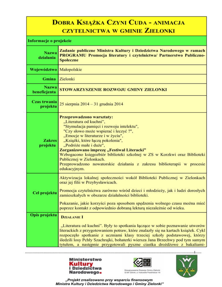 DOBRA KSIĄŻKA CZYNI CUDA - ANIMACJA CZYTELNICTWA W GMINIE ZIELONKI Informacje o projekcie Zadanie publiczne Ministra Kultury i Dziedzictwa Narodowego w ramach Nazwa PROGRAMU Promocja literatury i czytelnictwa/ Partnerstwo Publicznodziałania Społeczne Województwo Małopolskie Gmina Zielonki Nazwa STOWARZYSZENIE ROZWOJU GMINY ZIELONKI beneficjenta Czas trwania 25 sierpnia 2014 – 31 grudnia 2014 projektu Przeprowadzono warsztaty: „Literatura od kuchni”, "Stymulacja pamięci i rozwoju intelektu", "Czy słowo może wspierać i leczyć ?", „Emocje w literaturze i w życiu", Zakres „Książki, które łączą pokolenia", projektu „Podróże małe i duże", Zorganizowano imprezę „Festiwal Literacki” Wzbogacono księgozbiór biblioteki szkolnej w ZS w Korzkwi oraz Biblioteki Publicznej w Zielonkach. Przeprowadzono nowatorskie działania z zakresu biblioterapii w procesie edukacyjnym. Aktywizacja lokalnej społeczności wokół Biblioteki Publicznej w Zielonkach oraz jej filii w Przybysławicach. Cel projektu Promocja czytelnictwa zarówno wśród dzieci i młodzieży, jak i ludzi dorosłych zamieszkałych w obszarze działalności biblioteki. Pokazanie, jakie korzyści poza sposobem spędzenia wolnego czasu można mieć poprzez kontakt z odpowiednio dobraną lekturą niezależnie od wieku. Opis projektu DZIAŁANIE I „Literatura od kuchni”. Były to spotkania łączące w sobie poznawanie utworów literackich z przygotowaniem potraw, które znalazły się na kartach książek. Cykl rozpoczęło spotkanie z uczniami klasy trzeciej szkoły podstawowej, którzy śledzili losy Pchły Szachrajki, bohaterki wiersza Jana Brzechwy pod tym samym tytułem, a następnie przygotowali pyszne ciastka drożdżowe z bakaliami1 ---------------------------------------------------------------------------------------------------------------------------------------------- „Projekt zrealizowano przy wsparciu finansowym Ministra Kultury i Dziedzictwa Narodowego i Gminy Zielonki” papatacze. Wykonali projekty strojów dla tytułowej elegantki. Na kolejnym spotkaniu klasa trzecia poznała Tove Jansson, autorkę cyklu o Muminkach oraz wysłuchała fragmentów „Doliny Muminków w listopadzie”, jedynej części, w której nie pojawiają się Muminki, bardzo nostalgicznej i smutnej. Podczas gdy zapiekanka Muminka piekła się w piekarniku, uczniowie tworzyli własne teksty na temat „Dokąd wyjechały Muminki?” oraz wykonali piękne ilustracje. Kolejne warsztaty były skierowane do uczniów gimnazjum. Razem z klasą 1 b poszukiwaliśmy straconego czasu, analizując własne aktywności, piekliśmy słynne magdalenki Marcela Prousta, które smakowały przepysznie, przy okazji poznając ciekawą postać autora siedmiotomowej powieści. Klasa 1 a mogła zaznajomić się z kultową niegdyś serią przygód Pana Samochodzika Zbigniewa Nienackiego, obejrzeć fragment filmu „Pan Samochodzik i templariusze” ze Stanisławem Mikulskim w roli głównego bohatera, pana Tomasza, poszukiwacza skarbów. Chłopcy przyrządzili „Kurczaka a ’la Pan Samochodzik”, którego degustacja odbyła się na przerwie. Uczniowie klasy 2 a po obejrzeniu słynnego filmu „Śniadanie u Tiffany’ego” z niezapomnianą rolą Audrey Hepburn, przygotowali wspaniałe śniadanie, wspólnie spożyte z apetytem. Efektem warsztatów były również napisane charakterystyki głównej bohaterki, Holly Golightly, wysoko ocenione przez nauczyciela języka polskiego. Zorganizowano również spotkanie z dietetykiem na temat zdrowego odżywiania się. DZIAŁANIE II "Metody stymulacji pamięci i rozwoju intelektu” skierowane było do uczniów gimnazjum, klasy szóstej szkoły podstawowej oraz dorosłych. Program stymulacji pamięci i rozwoju intelektu realizowany w Zespole Szkół w Korzkwi oraz Bibliotece Publicznej w Przybysławicach opierał się na założeniu tzw. biofilii, przez którą Erich Fromm rozumiał miłość (radość) życia i działania, przedkładanie w stosunkach międzyludzkich empatii, otwartości, asertywności, kreatywności nad biernym oczekiwaniem, pesymizmem, niepewnością czy egoizmem, w myśl jego teorii, to człowiek, który kocha życie, jest pełen ciepła, zaraża optymizmem, jest otwarty na nowe doświadczenia. Poznając siebie staje się bardziej tolerancyjny dla swoich i cudzych wad. Jednocześnie wierzy w możliwości swojego umysłu, ćwiczy pamięć, starając się poszukiwać swoich zdolności i pasji. Podczas warsztatów realizowano m.in. takie tematy i zagadnienia jak: ćwiczenia pamięci operacyjnej (codziennej) poprzez skojarzenia, zapamiętywanie poprzez uaktywnienie wszystkich zmysłów, usprawnianie myślenia i zapamiętywania globalnego, metody wzmacniania koncentracji i spostrzegawczości, "Dieta mózgu". DZIAŁANIE III "Czy słowo może wspierać i leczyć?" To cykl zajęć biblioterapeutycznych dla uczniów klasy piątej szkoły podstawowej, gimnazjum, a także dla dorosłych w filii biblioteki w Przybysławicach, które poprowadziła pani dr Wanda MatrasMastalerz, pracownik Uniwersytetu Pedagogicznego w Krakowie. „Czytanie jako podstawowy element procesu biblioterapeutycznego może prowadzić do istotnych zmian w psychicznym i społecznym dojrzewaniu każdego młodego 2 ---------------------------------------------------------------------------------------------------------------------------------------------- „Projekt zrealizowano przy wsparciu finansowym Ministra Kultury i Dziedzictwa Narodowego i Gminy Zielonki” człowieka. Przyczynia się ono do wzbogacenia wyobraźni, kształtuje postawy, rozszerza słownictwo i wiedzę. Może stać się inspiracją do różnych form aktywności, np. dyskusji, dramy, recytacji, opowiadania, działalności plastycznej i muzycznej. Kształtowanie potrzeby i nawyku czytania jest warunkiem rozwoju krytycznego myślenia u dziecka, rozwija jego wrażliwość i empatię. Ponadto, odpowiednio dobrane teksty mogą zredukować negatywne od