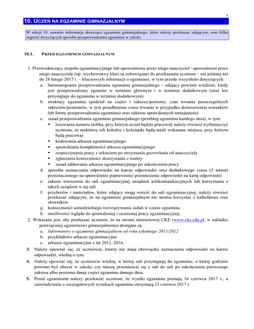 1 10. UCZEŃ NA EGZAMINIE GIMNAZJALNYM W sekcji 10. zawarto informacje dotyczące egzaminu gimnazjalnego, które należy przekazać zdającym, oraz kilka sugestii dotyczących sposobu przeprowadzania egzaminu w szkole. 10.1. PRZED EGZAMINEM GIMNAZJALNYM 1. Przewodniczący zespołu egzaminacyjnego lub upoważniony przez niego nauczyciel / upoważnieni przez niego nauczyciele (np. wychowawcy klas) są zobowiązani do przekazania uczniom – nie później niż do 28 lutego 2017 r. – kluczowych informacji o egzaminie, w tym przede wszystkim dotyczących: a. harmonogramu przeprowadzania egzaminu gimnazjalnego – zdający powinni wiedzieć, kiedy jest przeprowadzany egzamin w terminie głównym i w terminie dodatkowym (oraz kto przystępuje do egzaminu w terminie dodatkowym) b. struktury egzaminu (podział na części i zakresy/poziomy; czas trwania poszczególnych zakresów/poziomów, w tym przedłużenie czasu trwania w przypadku dostosowania warunków lub formy przeprowadzania egzaminu) oraz zakresu sprawdzanych umiejętności c. zasad przeprowadzania egzaminu gimnazjalnego (przebieg egzaminu każdego dnia), w tym: losowania numeru stolika, przy którym uczeń będzie pracował; należy również wytłumaczyć uczniom, że niektórzy ich koledzy i koleżanki będą mieli wskazane miejsce, przy którym będą pracować kodowania arkusza egzaminacyjnego sprawdzania kompletności arkusza egzaminacyjnego rozpoczynania pracy z arkuszem po otrzymaniu pozwolenia od nauczyciela zgłaszania konieczności skorzystania z toalety zasad oddawania arkusza egzaminacyjnego po zakończeniu pracy d. sposobu zaznaczania odpowiedzi na karcie odpowiedzi oraz dodatkowego czasu (5 minut) przeznaczonego na sprawdzenie poprawności przeniesienia odpowiedzi na kartę odpowiedzi e. zakazu wnoszenia do sali egzaminacyjnej urządzeń telekomunikacyjnych lub korzystania z takich urządzeń w tej sali f. przyborów i materiałów, które zdający mogą wnieść do sali egzaminacyjnej; należy również przekazać zdającym, że na egzaminie gimnazjalnym nie można korzystać z kalkulatora oraz słowników g. konieczności samodzielnego rozwiązywania zadań w czasie egzaminu h. możliwości wglądu do sprawdzonej i ocenionej pracy egzaminacyjnej. 2. Wskazane jest, aby przekazać uczniom, że na stronie internetowej CKE (www.cke.edu.pl, w zakładce poświęconej egzaminowi gimnazjalnemu) dostępne są: a. Informatory o egzaminie gimnazjalnym od roku szkolnego 2011/2012 b. przykładowe arkusze egzaminacyjne c. arkusze egzaminacyjne z lat 2012–2016. 3. Należy upewnić się, że uczniowie, którzy nie mają obowiązku zaznaczania odpowiedzi na karcie odpowiedzi, wiedzą o tym. 4. Należy upewnić się, że uczniowie wiedzą, w której sali przystępują do egzaminu; o której godzinie powinni być obecni w szkole; czy muszą przemieścić się z sali do sali po zakończeniu pierwszego zakresu albo poziomu danej części egzaminu danego dnia. 5. Przed egzaminem należy przekazać uczniom, że wyniki egzaminu poznają 16 czerwca 2017 r., a zaświadczenia o szczegółowych wynikach egzaminu otrzymają 23 czerwca 2017 r. 10.2. W TRAKCIE EGZAMINU GIMNAZJALNEGO 1. Przed wpuszczeniem zdających do sali egzaminacyjnej należy: a. powtórzyć informację o zakazie wnoszenia do sali egzaminacyjnej urządzeń telekomunikacyjnych b. upewnić się, że każdy zdający posiada niezbędne przybory i materiały, w tym przede wszystkim pióro lub długopis z czarnym tuszem/atramentem c. przypomnieć zdającym, aby butelki z wodą stawiali na podłodze, przy nodze stolika, aby nie zniszczyć materiałów egzaminacyjnych. 2. Należy przypomnieć zdającym, że w trakcie egzaminu gimnazjalnego nauczyciele nie udzielają wyjaśnień dotyczących zadań egzaminacyjnych. 3. Przed rozpoczęciem pracy z arkuszem należy przypomnieć uczniom o tym, że: a. na 10 minut przed zakończeniem czasu przeznaczonego na pracę z arkuszem egzaminacyjnym nauczyciel przypomni im o przeniesieniu odpowiedzi na kartę odpowiedzi b. po zakończeniu pracy z arkuszem będą mieć dodatkowe 5 minut na sprawdzenie poprawności przeniesienia odpowiedzi na kartę odpowiedzi. 4. Jeżeli w trakcie egzaminu gimnazjalnego wystąpi konieczność unieważnienia danego zakresu albo poziomu odpowiedniej części egzaminu z przyczyn określonych w pkt 5.4., procedurę należy przeprowadzić w sposób możliwie dyskretny, nieprowadzący do piętnowania zachowania ucznia. Informację o unieważnieniu należy niezwłocznie przekazać rodzicom (prawnym opiekunom) niepełnoletniego ucznia, wraz ze szczegółowym wyjaśnieniem przyczyn i dalszego sposobu postępowania. 10.3. PO EGZAMINIE GIMNAZJALNYM 1. W przypadku unieważnienia egzaminu z przyczyn określonych w pkt 7.1.3. szkoła jest zobowiązana udzielić zdającemu i jego rodzicom pełnego wsparcia na kolejnych etapach przeprowadzanej procedury. 2. Zdającym należy również przypomnieć o możliwości wglądu do sprawdzonej i ocenionej pracy egzaminacyjnej.