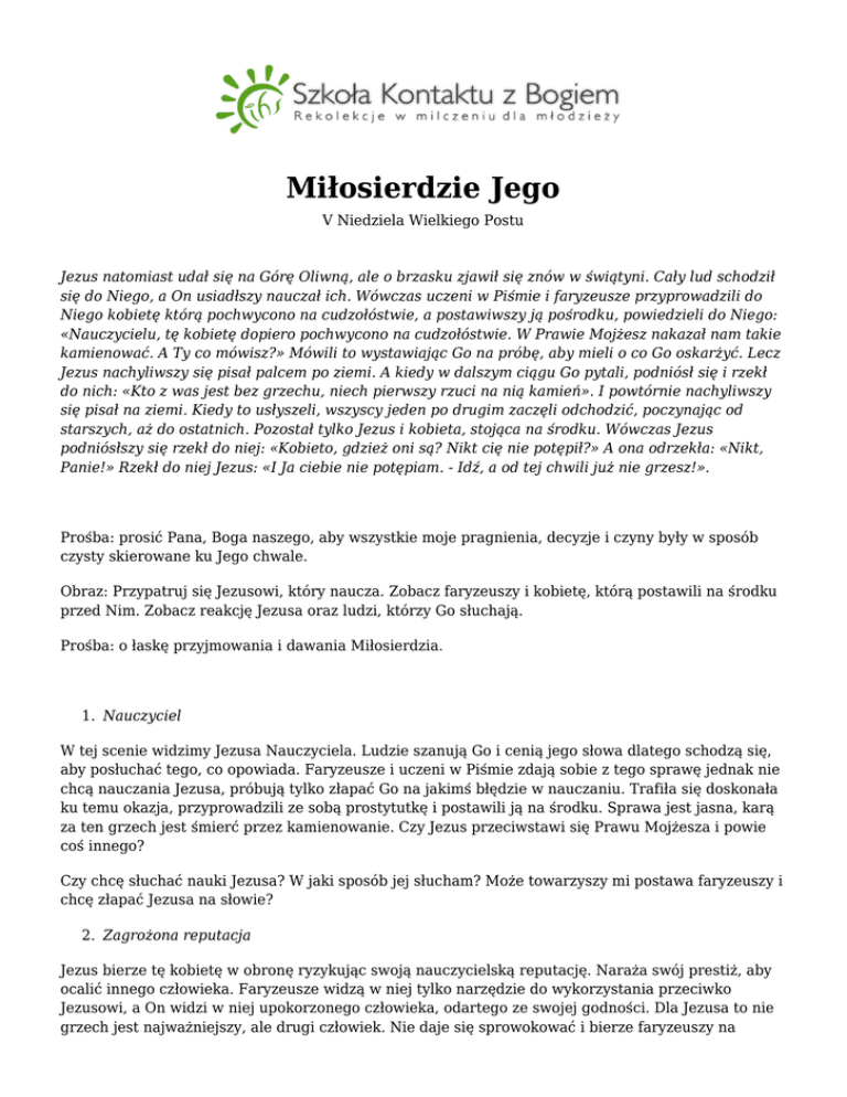 Miłosierdzie Jego V Niedziela Wielkiego Postu Jezus natomiast udał się na Górę Oliwną, ale o brzasku zjawił się znów w świątyni. Cały lud schodził się do Niego, a On usiadłszy nauczał ich. Wówczas uczeni w Piśmie i faryzeusze przyprowadzili do Niego kobietę którą pochwycono na cudzołóstwie, a postawiwszy ją pośrodku, powiedzieli do Niego: «Nauczycielu, tę kobietę dopiero pochwycono na cudzołóstwie. W Prawie Mojżesz nakazał nam takie kamienować. A Ty co mówisz?» Mówili to wystawiając Go na próbę, aby mieli o co Go oskarżyć. Lecz Jezus nachyliwszy się pisał palcem po ziemi. A kiedy w dalszym ciągu Go pytali, podniósł się i rzekł do nich: «Kto z was jest bez grzechu, niech pierwszy rzuci na nią kamień». I powtórnie nachyliwszy się pisał na ziemi. Kiedy to usłyszeli, wszyscy jeden po drugim zaczęli odchodzić, poczynając od starszych, aż do ostatnich. Pozostał tylko Jezus i kobieta, stojąca na środku. Wówczas Jezus podniósłszy się rzekł do niej: «Kobieto, gdzież oni są? Nikt cię nie potępił?» A ona odrzekła: «Nikt, Panie!» Rzekł do niej Jezus: «I Ja ciebie nie potępiam. - Idź, a od tej chwili już nie grzesz!». Prośba: prosić Pana, Boga naszego, aby wszystkie moje pragnienia, decyzje i czyny były w sposób czysty skierowane ku Jego chwale. Obraz: Przypatruj się Jezusowi, który naucza. Zobacz faryzeuszy i kobietę, którą postawili na środku przed Nim. Zobacz reakcję Jezusa oraz ludzi, którzy Go słuchają. Prośba: o łaskę przyjmowania i dawania Miłosierdzia. 1. Nauczyciel W tej scenie widzimy Jezusa Nauczyciela. Ludzie szanują Go i cenią jego słowa dlatego schodzą się, aby posłuchać tego, co opowiada. Faryzeusze i uczeni w Piśmie zdają sobie z tego sprawę jednak nie chcą nauczania Jezusa, próbują tylko złapać Go na jakimś błędzie w nauczaniu. Trafiła się doskonała ku temu okazja, przyprowadzili ze sobą prostytutkę i postawili ją na środku. Sprawa jest jasna, karą za ten grzech jest śmierć przez kamienowanie. Czy Jezus przeciwstawi się Prawu Mojżesza i powie coś innego? Czy chcę słuchać nauki Jezusa? W jaki sposób jej słucham? Może towarzyszy mi postawa faryzeuszy i chcę złapać Jezusa na słowie? 2. Zagrożona reputacja Jezus bierze tę kobietę w obronę ryzykując swoją nauczycielską reputację. Naraża swój prestiż, aby ocalić innego człowieka. Faryzeusze widzą w niej tylko narzędzie do wykorzystania przeciwko Jezusowi, a On widzi w niej upokorzonego człowieka, odartego ze swojej godności. Dla Jezusa to nie grzech jest najważniejszy, ale drugi człowiek. Nie daje się sprowokować i bierze faryzeuszy na przeczekanie, aż w końcu mówi: «Kto z was jest bez grzechu, niech pierwszy rzuci na nią kamień» Jak patrzę na drugiego człowieka? Co w nim widzę na pierwszy rzut oka, jego grzeszne postępowanie czy jego ludzką godność? Przypomnij sobie sytuację, w której zaryzykowałeś swoją dobrą reputację, aby stanąć w czyjejś obronie. Co wtedy czułeś? 3. Miłosierdzie Jezus nie potępia tej kobiety, Bóg nie potępia nikogo...ani mnie, ani Ciebie. A przecież każdy z nas ma grzechy. Tutaj pokazuje się Jego czułość i miłosierdzie. On nie tylko ratuje życie grzesznika przed śmiercią, przed ukamienowaniem, ale daje jej nową szansę; mówi: «I Ja ciebie nie potępiam. - Idź, a od tej chwili już nie grzesz!» czyli żyj przykazaniami. Przypatruj się Jezusowi i tej kobiecie, kiedy zostali sami. Posłuchaj ich dialogu i wsłuchaj się w słowa Jezusa, tak jakby były skierowane do Ciebie. Przyjmij Jego Miłosierdzie i proś abyś mógł Je dawać innym. Rozmowa końcowa: Porozmawiaj z Jezusem o twojej modlitwie, opowiedz Mu o tym co najbardziej Cię poruszyło. Modlitwa: Ojcze Nasz