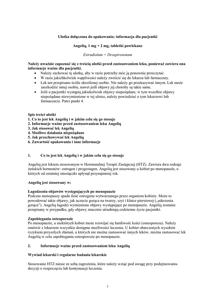 Ulotka dołączona do opakowania: informacja dla pacjentki Angeliq, 1 mg + 2 mg, tabletki powlekane Estradiolum + Drospirenonum Należy uważnie zapoznać się z treścią ulotki przed zastosowaniem leku, ponieważ zawiera ona informacje ważne dla pacjentki. • Należy zachować tę ulotkę, aby w razie potrzeby móc ją ponownie przeczytać. • W razie jakichkolwiek wątpliwości należy zwrócić się do lekarza lub farmaceuty. • Lek ten przepisano ściśle określonej osobie. Nie należy go przekazywać innym. Lek może zaszkodzić innej osobie, nawet jeśli objawy jej choroby są takie same. • Jeśli u pacjentki wystąpią jakiekolwiek objawy niepożądane, w tym wszelkie objawy niepożądane niewymienione w tej ulotce, należy powiedzieć o tym lekarzowi lub farmaceucie. Patrz punkt 4. Spis treści ulotki 1. Co to jest lek Angeliq i w jakim celu się go stosuje 2. Informacje ważne przed zastosowaniem leku Angeliq 3. Jak stosować lek Angeliq 4. Możliwe działania niepożądane 5. Jak przechowywać lek Angeliq 6. Zawartość opakowania i inne informacje 1. Co to jest lek Angeliq i w jakim celu się go stosuje Angeliq jest lekiem stosowanym w Hormonalnej Terapii Zastępczej (HTZ). Zawiera dwa rodzaje żeńskich hormonów: estrogen i progestagen. Angeliq jest stosowany u kobiet po menopauzie, u których od ostatniej miesiączki upłynął przynajmniej rok. Angeliq jest stosowany w: Łagodzeniu objawów występujących po menopauzie Podczas menopauzy spada ilość estrogenu wytwarzanego przez organizm kobiety. Może to powodować takie objawy, jak uczucie gorąca na twarzy, szyi i klatce piersiowej („uderzenia gorąca”). Angeliq łagodzi wymienione objawy występujące po menopauzie. Angeliq zostanie przepisany w przypadku, gdy objawy znacznie utrudniają codzienne życie pacjentki. Zapobieganiu osteoporozie Po menopauzie, u niektórych kobiet może rozwijać się łamliwość kości (osteoporoza). Należy omówić z lekarzem wszystkie dostępne możliwości leczenia. U kobiet obarczonych wysokim ryzykiem przyszłych złamań, u których nie można zastosować innych leków, można zastosować lek Angeliq w celu zapobiegania osteoporozie po menopauzie. 2. Informacje ważne przed zastosowaniem leku Angeliq Wywiad lekarski i regularne badania lekarskie Stosowanie HTZ niesie ze sobą zagrożenia, które należy wziąć pod uwagę przy podejmowaniu decyzji o rozpoczęciu lub kontynuacji leczenia. 1 Doświadczenie w zakresie leczenia kobiet z przedwczesną menopauzą (z powodu niewydolności jajników lub przeprowadzonej operacji) jest ograniczone. U kobiet z przedwczesną menopauzą, zagrożenia wynikające ze stosowania HTZ mogą być inne. W takim przypadku należy skonsultować się z lekarzem. Przed rozpoczęciem stosowania (lub przed ponownym zastosowaniem) HTZ lekarz przeprowadzi wywiad lekarski dotyczący pacjentki i jej rodziny. Lekarz może zdecydować o konieczności przeprowadzenia badania lekarskiego. Lekarz może zbadać piersi i (lub), jeśli to konieczne, przeprowadzić badanie ginekologiczne. Po rozpoczęciu przyjmowania leku Angeliq pacjentka powinna poddawać się regularnym badaniom lekarskim (przynajmniej jeden raz w roku). W trakcie tych wizyt należy omówić z lekarzem korzyści i ryzyko związane z kontynuacją stosowania leku Angeliq. Należy regularnie badać piersi, zgodnie z zaleceniami lekarza. Nie stosować leku Angeliq: jeśli jakikolwiek z niżej wymienionych stanów dotyczy pacjentki. Jeśli pacjentka ma wątpliwości czy którykolwiek z podanych stanów jej dotyczy, przed zastosowaniem leku Angeliq powinna poradzić się lekarza. Nie stosować leku Angeliq: • jeśli u pacjentki występuje uczulenie (nadwrażliwość) na estrogeny, progestageny lub którykolwiek z pozostałych składników leku Angeliq (wymienionych w punkcie 6). • jeśli u pacjentki występuje lub występował w przeszłości rak piersi lub jeśli jego występowanie podejrzewa się u pacjentki • jeśli u pacjentki występuje nowotwór wykazujący wrażliwość na estrogeny np. rak błony śluzowej trzonu macicy (endometrium) lub jeśli jego występowanie podejrzewa się u pacjentki • jeśli u pacjentki występuje krwawienie z dróg rodnych, którego przyczyn nie wyjaśniono • jeśli u pacjentki występuje nadmierny rozrost błony śluzowej trzonu macicy (hiperplazja endometrium) • jeśli u pacjentki występuje lub występował w przeszłości zakrzep w żyle (zakrzepica żył głębokich) na przykład w nogach (zakrzepica żył głębokich) lub w płucach (zator tętnicy płucnej) • jeśli u pacjentki występuje znana skłonność do zakrzepów (taka jak niedobór białka C, białka S lub antytrombiny) • jeśli u pacjentki występuje lub występowała w niedalekiej przeszłości choroba wywołana przez zakrzepy w tętnicy, jak na przykład: zawał serca, udar mózgu lub dławica piersiowa • jeśli u pacjentki występuje lub występowała w przeszłości choroba wątroby i parametry czynności wątroby nie powróciły do normy • jeśli u pacjentki występuje rzadka, przekazywana przez kolejne pokolenia (wrodzona) choroba barwnika krwi zwana „porfirią” • jeśli u pacjentki występuje ciężka choroba nerek lub ostra niewydolność nerek Jeśli w czasie przyjmowania leku Angeliq wystąpi jakikolwiek z wyżej wymienionych objawów, należy natychmiast przerwać stosowanie leku i zwrócić się do lekarza. Ostrzeżenia i środki ostrożności Przed rozpoczęciem stosowania Angeliq należy omówić to z lekarzem lub farmaceutą. Jeśli u pacjentki kiedykolwiek wystąpił którykolwiek z opisanych stanów klinicznych, przed rozpoczęciem leczenia należy poinformować o tym lekarza, ponieważ stany te mogą nawracać lub zaostrzać się podczas leczenia lekiem Angeliq. W takich przypadkach należy częściej zgłaszać się do lekarza na wizyty kontrolne: 2 • • • • • • • • • • • • • • • mięśniaki wewnątrz macicy wzrost fragme