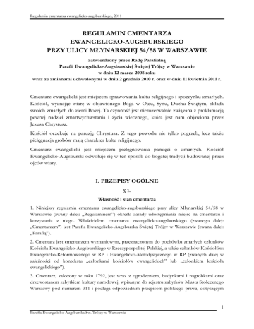 Regulamin cmentarza ewangelicko-augsburskiego, 2011 REGULAMIN CMENTARZA EWANGELICKO-AUGSBURSKIEGO PRZY ULICY MŁYNARSKIEJ 54/58 W WARSZAWIE zatwierdzony przez Radę Parafialną Parafii Ewangelicko-Augsburskiej Świętej Trójcy w Warszawie w dniu 12 marca 2008 roku wraz ze zmianami uchwalonymi w dniu 2 grudnia 2010 r. oraz w dniu 11 kwietnia 2011 r. Cmentarz ewangelicki jest miejscem sprawowania kultu religijnego i spoczynku zmarłych. Kościół, wyznając wiarę w objawionego Boga w Ojcu, Synu, Duchu Świętym, składa swoich zmarłych do ziemi Bożej. Ta czynność jest nierozerwalnie związana z proklamacją pewnej nadziei zmartwychwstania i życia wiecznego, która jest nam objawiona przez Jezusa Chrystusa. Kościół oczekuje na paruzję Chrystusa. Z tego powodu nie tylko pogrzeb, lecz także pielęgnacja grobów mają charakter kultu religijnego. Cmentarz ewangelicki jest miejscem pielęgnowania pamięci o zmarłych. Kościół Ewangelicko-Augsburski odwołuje się w ten sposób do bogatej tradycji budowanej przez ojców wiary. I. PRZEPISY OGÓLNE § 1. Własność i stan cmentarza 1. Niniejszy regulamin cmentarza ewangelicko-augsburskiego przy ulicy Młynarskiej 54/58 w Warszawie (zwany dalej: „Regulaminem”) określa zasady udostępniania miejsc na cmentarzu i korzystania z niego. Właścicielem cmentarza ewangelicko-augsburskiego (zwanego dalej: „Cmentarzem”) jest Parafia Ewangelicko-Augsburska Świętej Trójcy w Warszawie (zwana dalej: „Parafią”). 2. Cmentarz jest cmentarzem wyznaniowym, przeznaczonym do pochówku zmarłych członków Kościoła Ewangelicko-Augsburskiego w Rzeczypospolitej Polskiej, a także członków Kościołów: Ewangelicko-Reformowanego w RP i Ewangelicko-Metodystycznego w RP (zwanych dalej w zależności od kontekstu „członkami kościołów ewangelickich” lub „członkiem kościoła ewangelickiego”). 3. Cmentarz, założony w roku 1792, jest wraz z ogrodzeniem, budynkami i nagrobkami oraz drzewostanem zabytkiem kultury narodowej, wpisanym do rejestru zabytków Miasta Stołecznego Warszawy pod numerem 311 i podlega odpowiednim przepisom polskiego prawa, dotyczącym 1 Parafia Ewangelicko-Augsburska Św. Trójcy w Warszawie Regulamin cmentarza ewangelicko-augsburskiego, 2011 ochrony dóbr kultury i zabytków oraz przepisom dotyczącym Kościoła EwangelickoAugsburskiego w RP i wydanym na ich podstawie przepisom Prawa Kościelnego. 4. Na Parafii spoczywa obowiązek utrzymania ewangelickiego charakteru Cmentarza oraz zabezpieczenia jego materialnej substancji. Środki na ten cel Parafia uzyskuje z opłat cmentarnych oraz innych źródeł. 5. Cmentarz jest podzielony na część „historyczną” – obejmującą obszar od alei 1 do 28 oraz od 47 do 58 i na część „nową” obejmującą obszar od alei 29 do 46A, od 58A do 68 oraz aleję U, a także kolumbarium i Ogród Pamięci. Mapa Cmentarza z granicami części historycznej i nowej stanowi załącznik nr 2 do Regulaminu. 6. Następującym wyrażeniom używanym w Regulaminie nadaje się poniższe znaczenie: A. Kwatera ogólna – część Cmentarza (kwatera „O” i „R”) niepodzielona alejami i zawierająca groby ziemne, na które nie są wydawane konsensy. Kwatera ogólna została zaznaczona na mapie Cmentarza stanowiącej załącznik nr 2 do Regulaminu. B. Pokładne – opłata za posłużenie się grobem do pogrzebu urnowego lub trumnowego w związku z brakiem uprawnień wynikających z posiadania konsensu na dożywotnie prawo użytkowania grobu, odnawialne prawo użytkowania grobu na lat 20, dożywotnie prawo opieki nad grobem z prawem do pochowania lub odnawialne prawo opieki nad grobem na lat 20 z prawem do pochowania. C. Użytkownik grobu – osoba posiadająca konsens na dożywotnie prawo użytkowania grobu lub odnawialne prawo użytkowania grobu na lat 20. D. Opiekun grobu – osoba posiadająca konsens na dożywotnie prawo opieki nad grobem z prawem do pochowania, odnawialne prawo opieki nad grobem na lat 20 z prawem do pochowania lub prawo opieki nad grobem na lat 20 bez prawa do pochowania. E. Uprawnieni: a) małżonek członka kościoła ewangelickiego, jeżeli jest innego wyznania lub bezwyznaniowy, b) wdowa lub wdowiec po członku kościoła ewangelickiego, c) dziecko do lat 18 członka kościoła ewangelickiego, d) podopieczny członka kościoła ewangelickiego. F. Opłata pierwotna – opłata wnoszona w związku z pogrzebem w grobie nowym (nowo utworzonym) w kwaterze ogólnej lub w Ogrodzie Pamięci. § 2. Zarząd i pracownicy cmentarza 1. Cmentarz jest wyodrębnioną jednostką Parafii. 2. Zarząd Cmentarza stanowi Intendent, który w imieniu Parafii zarządza Cmentarzem. Do jego zadań należy organizowanie pochówków i innych czynności grzebalnych, prowadzenie ewidencji, 2 Parafia Ewangelicko-Augsburska Św. Trójcy w Warszawie Regulamin cmentarza ewangelicko-augsburskiego, 2011 nadzór nad utrzymywaniem zieleni, nadzór nad udostępnieniem Cmentarza, kontrolowanie prac o charakterze budowlanym, zapewnienie nienaruszalności substancji zabytkowej, czuwanie nad zachowaniem wyznaniowego charakteru Cmentarza. 3. Rada Parafialna Parafii może przekazać część swoich kompetencji Zarządowi Cmentarza, określając ich zakres i okres, na jaki zostają przekazane. 4. Zarząd Cmentarza w terminie do 15 lutego każdego roku przedstawia Radzie Parafialnej pisemne sprawozdanie dotyczące funkcjonowania Cmentarza w roku poprzednim. 5. Przy wykonywaniu prac i czynności na Cmentarzu Zarząd Cmentarza oraz pracownicy kierują się obowiązującymi przepisami prawa powszechnego, przepisami Prawa Kościelnego oraz niniejszym Regulaminem. 6. Parafia ani Zarząd Cmentarza nie odpowiadają za szkody wyrządzone na nagrobkach, pomnikach lub grobowcach przez drzewa lub krzewy, czynniki atmosferyczne, za kradzieże kwiatów oraz za kradzieże elementów lub całych nagrobków, pomników lub grobowców. 7. Pracownicy Cmentarza, którzy biorą udział w pogrzebie lub bezpośre