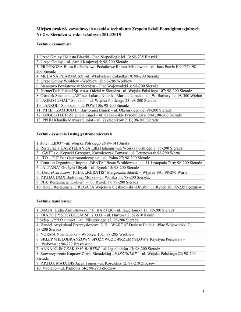 Miejsca praktyk zawodowych uczniów technikum Zespołu Szkół Ponadgimnazjalnych Nr 2 w Sieradzu w roku szkolnym 2014/2015 Technik ekonomista 1.Urząd Gminy i Miasta Błaszki –Plac Niepodległości 13; 98-235 Błaszki 2. Urząd Gminy – ul. Armii Krajowej 5; 98-200 Sieradz 3. PROGNOZA Biuro Rachunkowo-Podatkowe Renata Miśkiewicz – ul. Jana Pawła II 90/57; 98200 Sieradz 4. MEDANA PHARMA SA –ul. Władysława Łokietka 10; 98-200 Sieradz 5. Urząd Gminy Wróblew –Wróblew 15; 98-285 Wróblew 6. Starostwo Powiatowe w Sieradzu – Plac Wojewódzki 3; 98-200 Sieradz 7. PartnerTech Poland Sp. z o.o. Odział w Sieradzu –ul. Wojska Polskiego 107; 98-200 Sieradz 8. Ośrodek Szkolenia „AS” s.c. Łukasz Nitarski, Mariola Utracka –ul. W. Barbary 4c; 98-300 Wieluń 9. „AGRO JUMAL” Sp. z o.o. –ul. Wojska Polskiego 23; 98-200 Sieradz 10. „ANROL” Sp. z o.o. – ul. POW 106; 98-200 Sieradz 11. P.H.B. „ZAMBUD II” Bartłomiej Biniek – ul. Oksińskiego 62; 98-200 Sieradz 12. ENGEL-TECH Zbigniew Engel – ul. Krakowskie Przedmieście 80A; 98-200 Sieradz 13. PPHU Klaudia Mariusz Simiot – ul. Zakładników 21B; 98-200 Sieradz Technik żywienia i usług gastronomicznych 1.Hotel „LIDO” –ul. Wojska Polskiego 26 84-141 Jurata 2. Restauracja KASZTELANKA Lilla Halamus –ul. Wojska Polskiego 5; 98-200 Sieradz 3. „G&T” s.c. Kopacki Grzegorz, Kaźmierczak Tomasz –ul. Terenowa 6; 98-290 Warta 4. „TO – TU” Bar Gastronomiczny s.c. –ul. Polna 27; 98-200 Sieradz 5. Centrum Organizacji Imprez „BEATA” Beata Wróblewska –ul. 11 Listopada 7/16; 98-200 Sieradz 6. „ALTANA’ Grażyna Ubych – ul. Rynek 15; 98-200 Sieradz 7.„Dworek za lasem” P.H.U. „KERATIS” Małgorzata Sitarek – Włyń nr 9A, 98-290 Warta 8. P.P.H.U. BMX Bartłomiej Molka – ul. Wolska 11; 98-200 Sieradz, 9. PHU Restauracja „Cukier" – ul. Rynek 17; 98-200 Sieradz 10. Hotel, Restauracja „FREGATA Wojciech Cieślikowski –Drużbin ul. Rynek 20; 99-235 Pęczniew Technik handlowiec 1.„MAJA” Lidia Zamysłowska P.H. BARTEK – ul. Jagiellońska 13; 98-200 Sieradz 2. FRAPO DYSTRYBUCJA SP. Z O.O. – ul. Hurtowa 2; 62-510 Konin 3.Sklep „POLO market” –ul. Piłsudskiego 12; 98-200 Sieradz 4. Handel Artykułami Przemysłowymi D.H. „WARTA” Dariusz Hajduk –Plac Wojewódzki 7; 98-200 Sieradz 5. NORMA Nina Obałka – Wróblew 10C; 98-285 Wróblew 6. SKLEP WIELOBRANŻOWY SPOŻYWCZO-PRZEMYSŁOWY Krystyna Posiewała – ul. Parkowa 1; 98-277 Brąszewice 7. ANNA KLIMCZAK D.H. BARTEK –ul. Jagiellońska 13; 98-200 Sieradz 8. Stowarzyszenie Kupców Ziemi Sieradzkiej „NASZ SKLEP” –ul. Wojska Polskiego 23; 98-200 Sieradz 9. P.P.H.U. MAJA BIS Jacek Tomes –ul. Kościelna 12; 98-270 Złoczew 10. Vobiano – ul. Parkowa 14c; 98-270 Złoczew 1 Technik usług fryzjerskich 1.TRIJO Salon Fryzjerski Izabela Skrzypińska –ul. Jana Pawła II15; 98-200 Sieradz 2. Salon Fryzjerski „SŁODKIE FIOŁKI” Lucja Owczarek – ul. Sieradzka 2a; 98-275 Brzeźnio 3. Zakład Fryzjerski „ULA” Urszula Płoska – ul. Armii Krajowej; 98-200 Sieradz 4.Zakład Fryzjerski Ewa Tedys – ul. Taczanowskiego 6/4; 98-200 Sieradz 5. Salon Urody ANGELA Witold Wodzinowski – ul. Jagiellońska 28/1; 98-200 Sieradz 6. „KAZUMI” Beauty salon Małgorzata Urbaniak –ul. Łokietka 3c; 98-200 Sieradz 7. Salon Fryzjerski „Szalone Nożyczki” Anna Smolińska –ul. Leszka Czarnego 1a; 98-200 Sieradz 8. Zakład Fryzjerski Małgorzata Szymonik –ul. Piastowska 4/2; 98-200 Sieradz 9. Salon Fryzjersko-Kosmetyczny Barbara Pluta –ul. Sulwińskiego 36; 98-235 Błaszki 10. Salon Fryzjerski „Styl” Agnieszka Adamiak –ul. Armii Krajowej 30; 98-200 Sieradz 11. Salon Fryzjerski „MARIOLA” Szurdyga Mariola –ul. 3 Maja 8; 98-290 Warta 12. Salon Fryzjerski „MARLEN”FHU Marlena Szewczyk –Chlewo 20; 98-215 Goszczanów 13. Zakład Fryzjerski „ANETA” Wojciech Iskra –Czajków 28; 63-524 Czajków 14.Salon Fryzjerski „MAGDA” Magdalena Kałużna – ul. Aleja Grunwaldzka 17B; 98-200 Sieradz 15. SALON FRYZJERSKI DAMSKO-MĘSKI Iwona Jakubczyk – ul. Broniewskiego 5/4; 98-200 Sieradz Technik hotelarstwa 1.Sportwerk Hotel – Biskupice Podgórne – ul. Polna 6-8; 55-040 Kobierzyce k. Wrocławia 2. Hotel „Jasek” – ul. Sułowska 39; 51-180 Wrocław 3. HOTEL KLIMCZAK– ul. Wojska Polskiego 99; 98-200 Sieradz 4.Lido – Jurata ul. Wojska Polskiego 26; 84-141 Jurata 5.Villa Hoff – Trzęsacz ul. Słoneczna 3; 72-344 Trzęsacz, 6. Centrum Szkoleniowo – Rekreacyjne „Hotel Karolinka” –ul. Linowa 3b; 58-540 Karpacz 7. Ośrodek Wczasowy LEŚNY DWÓR –ul. Teligi 2; 72-351 Pogorzelica 8.Hotel Uzdrowiskowy St. George – Kudowa Zdrój – ul. Kościuszki 180; 57-550 Kudowa Zdrój 9.Restauracja Piękna 56 – Warszawa –ul. Piękna 56; 00-672 Warszawa 10.JF Hotel Duet – ul. Maszewska 19; 72-100 Goleniów 11.Hotel Diament Plaza– Gliwice ul. Zwycięstwa 30; 44-100 Gliwice 12.B&B Hotel Toruń – ul. Szumana 8; 87-100 Toruń 13.Hotel Perła – Oleśnica – ul. Sinapiusa 12; 56-400 Oleśnica 14.Hotel Royal – Poznań – ul. Św. Marcin 71; 61-808 Poznań Technik organizacji reklamy 1.Urząd Miasta w Sieradzu –Plac Wojewódzki 1; 98-200 Sieradz 2. Sieradzkie Centrum Kultury –ul. Dominikańska 19; 98-200 Sieradz 3. Łódzkie Towarzystwo Fotograficzne –ul. Piotrkowska 102; 90-004 Łódź 4. Agencja Reklamowa „PUNKT” –ul. Warcka 8; 98-200 Sieradz 5. PROF-ART Agencja Reklamowo-Wydawnicza Elżbieta Andryszczak, Ryszard Sierociński –ul. Polna 6; 98-200 Sieradz 6. Oddział Łódzki Filmoteki Narodowej Archiwum Filmowego 3 „Łąkowa” –ul. Łąkowa 29; 90-554 Łódź 2 Technik logistyk 1.Ekoenergetyka Polska Sp. z o.o. –ul. Chopina 19a; 65-031 Zielona Góra 2. „FEBER” Sp. z o.o. Zakład Produkcji Pojazdów – ul. Mickiewicza 4; 98-200 Sieradz 3. Miejskie Przedsiębiorstwo Komunikacji Sp. z o.o. –ul. Jana Pawła II 63; 98-200 Sieradz 4. PartnerTech Poland Sp. z o.o. Odział w 