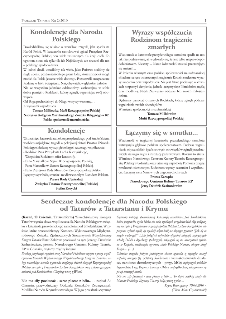 Przegląd Tatarski Nr 2/2010 Kondolencje dla Narodu Polskiego Dowiedzieliśmy się właśnie o straszliwej tragedii, jaka spadła na Naród Polski. W katastrofie samolotowej zginął Prezydent Rzeczypospolitej Polskiej oraz wiele zasłużonych dla kraju osób. To ogromna strata nie tylko dla ich Najbliższych, ale również dla nas – polskiego społeczeństwa. W jednej chwili utraciliśmy tak wielu. Jako Państwo staliśmy się nagle ubożsi, pozbawieni całego grona ludzi, którzy przecież mogli zrobić dla Polski jeszcze wiele dobrego. Pozostawili zrozpaczone Rodziny w bólu i cierpieniu. Nas, obywateli, w głębokiej żałobie. Nie ze wszystkim jednakże odchodzimy: zachowajmy w sobie dobrą pamięć o Rodakach, którzy zginęli, wypełniając swój obowiązek. Od Boga pochodzimy i do Niego wszyscy wracamy… Z wyrazami współczucia Tomasz Miśkiewicz, Mufti Rzeczypospolitej Polskiej Najwyższe Kolegium Muzułmańskiego Związku Religijnego w RP Polska społeczność muzułmańska Kondolencje Wstrząśnięci katastrofą samolotu prezydenckiego pod Smoleńskiem, w obliczu największej tragedii w pokojowej historii Państwa i Narodu Polskiego składamy wyrazy głębokiego i szczerego współczucia: - Rodzinie Pana Prezydenta Lecha Kaczyńskiego, - Wszystkim Rodzinom ofiar katastrofy, - Panu Marszałkowi Sejmu Rzeczypospolitej Polskiej, - Panu Marszałkowi Senatu Rzeczypospolitej Polskiej, - Panu Prezesowi Rady Ministrów Rzeczypospolitej Polskiej. Łączymy się w bólu, smutku i modlitwie z całym Narodem Polskim. Prezes Rady Centralnej Związku Tatarów Rzeczypospolitej Polskiej Stefan Korycki Wyrazy współczucia Rodzinom tragicznie zmarłych Wiadomość o katastrofie prezydenckiego samolotu spadła na nas tak niespodziewanie, aż wydawało się, że jest tylko nieprawdopodobieństwem. Niestety… Naraz świat wokół nas tak przerażająco się zmienił… W imieniu własnym oraz polskiej społeczności muzułmańskiej składam na ręce osieroconych tragicznie Rodzin serdeczne wyrazy szacunku oraz współczucia. Nie jest łatwo pocieszyć w chwilach rozpaczy i cierpienia, jednak łączymy się z Nimi dobrą myślą oraz modlitwą. Niech Najwyższy obdarzy Ich swoim miłosierdziem. Będziemy pamiętać o naszych Rodakach, którzy zginęli podczas wypełniania swoich obowiązków. W imieniu społeczności muzułmańskiej Tomasz Miśkiewicz Mufti Rzeczypospolitej Polskiej Łączymy się w smutku… Wiadomość o tragicznej katastrofie prezydenckiego samolotu wstrząsnęła głęboko polskim społeczeństwem. Podczas wypełniania obywatelskich i państwowych obowiązków zginęli przedstawiciele naszego rządu i instytucji państwowych. Bolesna to strata. W imieniu Narodowego Centrum Kultury Tatarów Rzeczypospolitej Polskiej w Gdańsku oraz tatarskiej wspólnoty Pomorza pragnę przekazać osieroconym Rodzinom wyrazy szacunku i współczucia. Łączymy się z Nimi w tych tragicznych chwilach. Prezes Zarządu Narodowego Centrum Kultury Tatarów RP Jerzy Dżirdżis Szahuniewicz Serdeczne kondolencje dla Narodu Polskiego od Tatarów z Tatarstanu i Krymu (Kazań, 10 kwietnia, Tatar-inform) Wszechświatowy Kongres Tatarów wyraża słowa współczucia dla Narodu Polskiego w związku z katastrofą prezydenckiego samolotu pod Smoleńskiem. W piśmie, które przewodniczący Komitetu Wykonawczego Międzynarodowego Związku Zjednoczonych Stowarzyszeń Wszechświatowy Kongres Tatarów Rinat Zakirow przekazał na ręce Jerzego Dżirdżisa Szahuniewicza, prezesa Narodowego Centrum Kultury Tatarów RP w Gdańsku, czytamy między innymi: Prosimy przekazać rządowi oraz Narodowi Polskiemu szczere wyrazy współczucia od Komitetu Wykonawczego Wszechświatowego Kongresu Tatarów i całego tatarskiego narodu z powodu tragicznej śmierci delegacji Rzeczypospolitej Polskiej na czele z Prezydentem Lechem Kaczyńskim oraz z towarzyszącymi osobami pod Smoleńskiem. Cierpimy wraz z Wami. Nie ma siły pocieszać - serce płacze z bólu… - napisał Ali Chamzin, przewodniczący Oddziału Kontaktów Zewnętrznych Medżlisu Narodu Krymskotatarskiego. W jego przesłaniu czytamy: Ogromny wstrząs, spowodowany katastrofą samolotową pod Smoleńskiem, która pozbawiła życia blisko sto osób, wybitnych przedstawicieli elity politycznej na czele z Prezydentem Rzeczypospolitej Polskiej Lechem Kaczyńskim, nie pozwala zebrać myśli, by znaleźć odpowiedź na dręczące pytanie: “Jak się to mogło wydarzyć?” Lista poległych członków oficjalnej delegacji, najwyższych władz Polski i działaczy społecznych, udających się na uroczystości żałobne w Katyniu, uwidacznia ogromną stratę Polskiego Narodu, niczym drugi Katyń… (…) Okrutna tragedia jednym podstępnym ciosem wydarła z szeregów naszej wspólnej drużyny (tj. polskiej Solidarności i krymskotatarskich działaczy narodowo-demokratycznych - przyp. MCz) najlepszych polskich bojowników. I my, Krymscy Tatarzy i Polacy, nieprędko teraz otrząśniemy się po tej strasznej stracie. Nie ma siły pocieszać - serce płacze z bólu… To dzień wielkiej straty dla Narodu Polskiego. Krymscy Tatarzy boleją wraz z nim… Krym, Bachczysaraj, 10.04.2010 r. (Tłum. Musa Czachorowski) wydarzenia i informacje Musa Czachorowski X Dzień Islamu w Kościele katolickim – w Katowicach… Hasłem tegorocznego, X Dnia Islamu w Kościele katolickim w Polsce było Chrześcijanie i muzułmanie wspólnie w walce z ubóstwem. Wprawdzie jego oficjalny termin to 26 stycznia, ale już w przeddzień, 25.01. br. odbyło się w Katowicach uroczyste spotkanie z tej okazji. Inicjatywę wspólnych działań w imię wiary podjęli tam bracia franciszkanie z Wyższego Seminarium Duchownego. Organizatorzy w osobach księdza Tadeusza Czekańskiego i ojca Witosława J. Sztyka OFM zaprosili do wspólnej rozmowy duchownych katolickich, przedstawicieli społeczności muzułmańskiej oraz mieszkańców miasta. W auli Domu Parafialnego w Katowicach Panewnikach zebrało się okoł