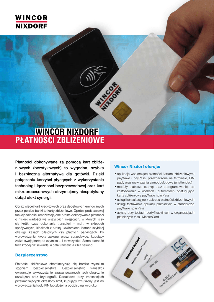 PŁATNOŚCI ZBLIŻENIOWE Płatności dokonywane za pomocą kart zbliżeniowych (bezstykowych) to wygodna, szybka i bezpieczna alternatywa dla gotówki. Dzięki połączeniu korzyści płynących z wykorzystania technologii łączności bezprzewodowej oraz kart mikroprocesorowych otrzymujemy niespotykany dotąd efekt synergii. Coraz więcej kart kredytowych oraz debetowych emitowanych przez polskie banki to karty zbliżeniowe. Oprócz podstawowej funkcjonalności umożliwiają one proste dokonywanie płatności o niskiej wartości we wszystkich miejscach, w których liczy się krótki czas dokonania transakcji – m.in. w sklepach spożywczych, kioskach z prasą, kawiarniach, barach szybkiej obsługi, kasach biletowych czy płatnych parkingach. Po wprowadzeniu kwoty zakupu przez sprzedawcę, kupujący zbliża swoją kartę do czytnika ... i to wszystko! Sama płatność trwa krócej niż sekundę, a cała transakcja kilka sekund. Bezpieczeństwo Płatności zbliżeniowe charakteryzują się bardzo wysokim stopniem bezpieczeństwa. Bezpieczeństwo transakcji gwarantuje wykorzystanie zaawansowanych technologicznie rozwiązań oraz kryptografii. Dodatkowo przy transakcjach przekraczających określony limit, kupujący zmuszony jest do wprowadzenia kodu PIN lub złożenia podpisu na wydruku. Wincor Nixdorf oferuje: • aplikacje wspierające płatności kartami zbliżeniowymi payWave i payPass, przeznaczone na terminale, PIN pady oraz rozwiązania samoobsługowe (unattended) • moduły płatnicze (sprzęt oraz oprogramowanie) do zastosowania w kioskach i automatach, obsługujące karty zbliżeniowe payWave i payPass • usługi konsultacyjne z zakresu płatności zbliżeniowych • usługi testowania aplikacji płatniczych w standardzie payWave i payPass • asystę przy testach certyfikacyjnych w organizacjach płatniczych Visa i MasterCard Usługa testowania aplikacji płatniczych Wincor Nixdorf przeprowadza profesjonalne testy aplikacji płatniczych we wszystkich fazach tworzenia oprogramowania oraz świadczy usługi testowania oraz asysty certyfikacyjnej dla Klientów. Dzięki szerokiej wiedzy i dużemu doświadczeniu w dziedzinie systemów płatniczych możliwe są testy zarówno aplikacji autorskich, jak i dowolnych aplikacji zewnętrznych. Wincor Nixdorf do testowania wykorzystuje profesjonalne narzędzia i nowoczesną metodykę pozwalające na dokładne testowanie aplikacji płatniczych, także w standardzie payWave oraz payPass. Podczas procesu używane są narzędzia certyfikowane przez organizacje płatnicze. Aplikacje dla terminali płatniczych i PIN padów Wincor Nixdorf oferuje szeroką gamę aplikacji dla terminali płatniczych. Znajdują się wśród nich zarówno rozwiązania kartowe dla kart z paskiem magnetycznym, kart stykowych mikroprocesorowych (w tym EMV) i kart zbliżeniowych. Dodatkowo Wincor Nixdorf dostarcza aplikacje z rozszerzoną funkcjonalnością: • płatności rachunków (bill payment), • doładowania telefonów (prepaid), • programy lojalnościowe (loyalty), • karty podarunkowe (gift cards), • elektroniczna portmonetka. Wszystkie aplikacje płatnicze są zgodne z obowiązującymi standardami bezpieczeństwa (PCI – Payment Card Industry) oraz EMV. Dla potrzeb weryfikacji PIN online stosowane są różne schematy zarządzania kluczami kryptograficznymi (APACS40, Master/Session, DUKPT) zgodnie z 3-DES. Centrum serwisowe Wincor Nixdorf świadczy także usługę ładowania kluczy kryptograficznych do urządzeń w pomieszczeniu certyfikowanym przez organizacje płatnicze. Publikacja firmy Wincor Nixdorf Sp. z o.o. Wydrukowano w Polsce, kwiecień 2010 r. ul. Popularna 82 • 02-226 Warszawa Tel.: (+48) 22 572 42 00 / 01 • Fax: (+48) 22 572 42 09 www.wincor-nixdorf.com/pl [email protected] ©Wincor Nixdorf Sp. z o.o. Wszelkie prawa, w tym prawa wynikające z uzyskania patentu lub zarejestrowania modelu albo projektu rozwiązania, są zastrzeżone. Realizacja dostaw w miarę dostępności. Zastrzega się możliwość wprowadzania zmian technicznych w produkcie. Wszystkie nazwy sprzętu i oprogramowania wykorzystane w niniejszym tekście są nazwami marek lub znakami towarowymi należącymi do odpowiednich podmiotów. Rozwiązania samoobsługowe Artema Modular jest wszechstronnym rozwiązaniem, które umożliwia szybkie dokonywanie płatności bezgotówkowych za pomocą kart we wszystkich rodzajach urządzeń samoobsługowych i nienadzorowanych punktach sprzedaży. Urządzenie to oparte jest na platformie płatniczej Artema, dzięki czemu spełnia wszystkie wymogi bezpieczeństwa obowiązujące przy płatnościach kartami. Artema Modular umożliwia dokonywanie płatności kartami stykowymi oraz zbliżeniowymi i jest całkowicie zgodne z wymaganiami EMV Level 1 i 2. Artema Modular umożliwia dokonywanie płatności kartami z zabezpieczeniem transakcji za pomocą kodu PIN lub bez niego. Rozwiązanie dzięki integracji z czytnikiem zbliżeniowym umożliwia przeprowadzanie wszystkich typów transakcji Visa i MasterCard, m.in. payWave i payPass.
