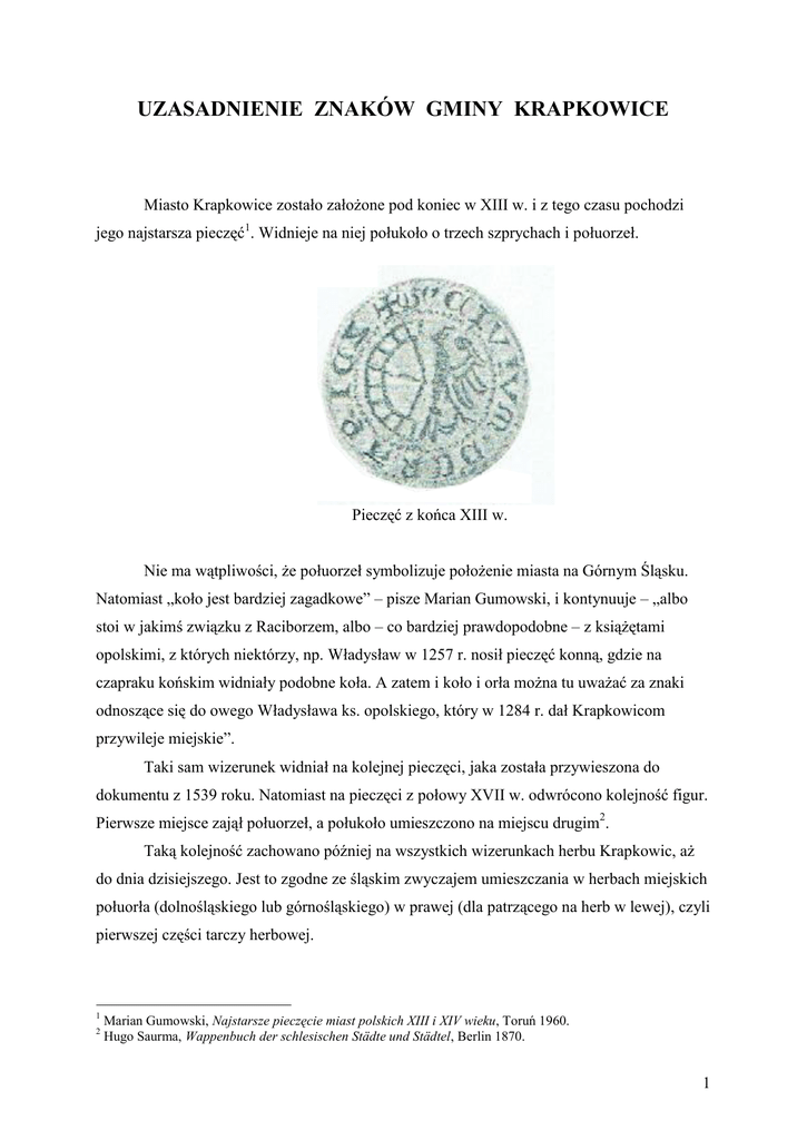 UZASADNIENIE ZNAKÓW GMINY KRAPKOWICE Miasto Krapkowice zostało założone pod koniec w XIII w. i z tego czasu pochodzi jego najstarsza pieczęć1. Widnieje na niej połukoło o trzech szprychach i połuorzeł. Pieczęć z końca XIII w. Nie ma wątpliwości, że połuorzeł symbolizuje położenie miasta na Górnym Śląsku. Natomiast „koło jest bardziej zagadkowe” – pisze Marian Gumowski, i kontynuuje – „albo stoi w jakimś związku z Raciborzem, albo – co bardziej prawdopodobne – z książętami opolskimi, z których niektórzy, np. Władysław w 1257 r. nosił pieczęć konną, gdzie na czapraku końskim widniały podobne koła. A zatem i koło i orła można tu uważać za znaki odnoszące się do owego Władysława ks. opolskiego, który w 1284 r. dał Krapkowicom przywileje miejskie”. Taki sam wizerunek widniał na kolejnej pieczęci, jaka została przywieszona do dokumentu z 1539 roku. Natomiast na pieczęci z połowy XVII w. odwrócono kolejność figur. Pierwsze miejsce zajął połuorzeł, a połukoło umieszczono na miejscu drugim2. Taką kolejność zachowano później na wszystkich wizerunkach herbu Krapkowic, aż do dnia dzisiejszego. Jest to zgodne ze śląskim zwyczajem umieszczania w herbach miejskich połuorła (dolnośląskiego lub górnośląskiego) w prawej (dla patrzącego na herb w lewej), czyli pierwszej części tarczy herbowej. 1 2 Marian Gumowski, Najstarsze pieczęcie miast polskich XIII i XIV wieku, Toruń 1960. Hugo Saurma, Wappenbuch der schlesischen Städte und Städtel, Berlin 1870. 1 Figury na pieczęciach nie były od siebie oddzielone linią, a więc należy je umieścić na tarczy herbowej bez dzielenia jej linią pionową na dwie części. Niestety na pieczęci sprawionej przez władze miasta w 1800 r. tarczę tak podzielono. Hugo Saurma pisze, że pierwsze pole było czerwone, a drugie błękitne. O czerwonym polu pisze też Otto Hupp3, ale na jego rysunku pole to jest żółte, a połuorzeł czarny. Rysunek O. Huppa Na wszystkich znanych barwnych wizerunkach herbu Krapkowic połukoło jest srebrne (białe) w polu błękitnym. Na ogół jest to koło wozowe, ale na pierwszej pieczęci z pewnością nie ma z wozowym nic wspólnego. Jest to prawdopodobnie koło wodne i tak je przedstawiono w książce „Miasta polskie w Tysiącleciu”. Rysunek herbu Krapkowic w książce M. Gumowskiego „Herby miast polskich”. 3 Rysunek herbu Krapkowic w książce „Miasta polskie w Tysiącleciu”. Otto Hupp, Königreich Preussen, Wappen der Städte, Flecken und Dörfer, Frankfurt am Main 1896 und 1898. 2 Obecnie używany wizerunek herbu Krapkowic ma prawidłową kolejność godeł, lecz w najmniejszym stopniu nie odpowiada regułom sztuki heraldycznej. Orzeł jest niekształtny, błędna jest czarna barwa jego pazurów i języka, nieuzasadniona jest przepaska sierpowa. Koło jest za małe, a jego szprychy mają udziwniony kształt i nie łączą piasty z kołem. Urzędowy wzór obecnie używanego herbu Krapkowic. Tworząc nowe opracowanie graficzne herbu uznano za właściwe umieszczenie obu godeł w polu błękitnym, bez podziału tarczy herbowej. Godła te są – jak na pierwszej pieczęci – nieco odsunięte od siebie. Na tej pieczęci wzorowano również kształt połukoła. Zgodnie ze śląską tradycją heraldyczną, na pierwszym miejscu został umieszczony opolski (górnośląski) połuorzeł. Flaga o barwach herbu, czyli dwóch pasach poziomych, górny żółty, dolny niebieski, była używana co najmniej od lat 60. XX wieku. Świadczy o tym list, jaki Powiatowy Ośrodek Wychowania Fizycznego i Sportu wystosował 20 03 1969 r. do Komitetu Organizacyjnego IV Ogólnopolskich Letnich Igrzysk Młodzieży Szkolnej w Warszawie. Do tego listu4 dołączono wzory flagi i herbu Krapkowic. Jednakże flagę taką ma już kilka miast w Polsce i dlatego postanowiono zaprojektować weksylia o tych samych barwach, lecz z herbem miasta. Na pieczęci umieszczone zostało samo godło (bez tarczy herbowej). 4 W archiwum Instytutu Heraldyczno-Weksylologicznego, teczka Krapkowice. 3 4