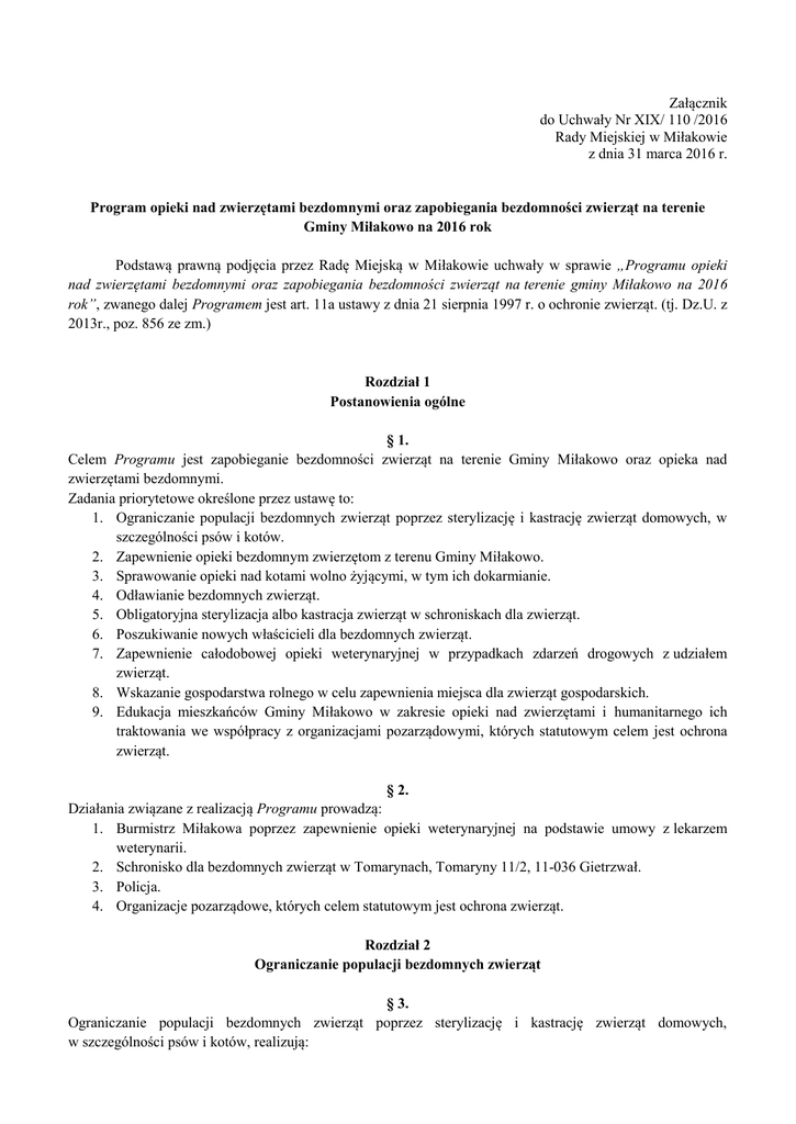 Załącznik do Uchwały Nr XIX/ 110 /2016 Rady Miejskiej w Miłakowie z dnia 31 marca 2016 r. Program opieki nad zwierzętami bezdomnymi oraz zapobiegania bezdomności zwierząt na terenie Gminy Miłakowo na 2016 rok Podstawą prawną podjęcia przez Radę Miejską w Miłakowie uchwały w sprawie „Programu opieki nad zwierzętami bezdomnymi oraz zapobiegania bezdomności zwierząt na terenie gminy Miłakowo na 2016 rok”, zwanego dalej Programem jest art. 11a ustawy z dnia 21 sierpnia 1997 r. o ochronie zwierząt. (tj. Dz.U. z 2013r., poz. 856 ze zm.) Rozdział 1 Postanowienia ogólne § 1. Celem Programu jest zapobieganie bezdomności zwierząt na terenie Gminy Miłakowo oraz opieka nad zwierzętami bezdomnymi. Zadania priorytetowe określone przez ustawę to: 1. Ograniczanie populacji bezdomnych zwierząt poprzez sterylizację i kastrację zwierząt domowych, w szczególności psów i kotów. 2. Zapewnienie opieki bezdomnym zwierzętom z terenu Gminy Miłakowo. 3. Sprawowanie opieki nad kotami wolno żyjącymi, w tym ich dokarmianie. 4. Odławianie bezdomnych zwierząt. 5. Obligatoryjna sterylizacja albo kastracja zwierząt w schroniskach dla zwierząt. 6. Poszukiwanie nowych właścicieli dla bezdomnych zwierząt. 7. Zapewnienie całodobowej opieki weterynaryjnej w przypadkach zdarzeń drogowych z udziałem zwierząt. 8. Wskazanie gospodarstwa rolnego w celu zapewnienia miejsca dla zwierząt gospodarskich. 9. Edukacja mieszkańców Gminy Miłakowo w zakresie opieki nad zwierzętami i humanitarnego ich traktowania we współpracy z organizacjami pozarządowymi, których statutowym celem jest ochrona zwierząt. § 2. Działania związane z realizacją Programu prowadzą: 1. Burmistrz Miłakowa poprzez zapewnienie opieki weterynaryjnej na podstawie umowy z lekarzem weterynarii. 2. Schronisko dla bezdomnych zwierząt w Tomarynach, Tomaryny 11/2, 11-036 Gietrzwał. 3. Policja. 4. Organizacje pozarządowe, których celem statutowym jest ochrona zwierząt. Rozdział 2 Ograniczanie populacji bezdomnych zwierząt § 3. Ograniczanie populacji bezdomnych zwierząt poprzez sterylizację i kastrację zwierząt domowych, w szczególności psów i kotów, realizują: 1. schronisko poprzez obligatoryjne przeprowadzanie zabiegów sterylizacji i kastracji zwierząt przyjętych do Schroniska, z wyjątkiem zwierząt u których istnieją przeciwwskazania do wykonania tych zabiegów, z uwagi na stan zdrowia i/lub wiek; 2. Gmina Miłakowo poprzez prowadzenie akcji zachęcającej właścicieli psów i kotów do wykonywania zabiegów sterylizacji i kastracji na poniższych zasadach: a) zapewnienia właścicielom psów i kotów dofinansowania w wysokości 50 % kosztów sterylizacji samic i kastracji samców, w ilości maksymalnie 1 szt. zwierząt rocznie. Dofinansowanie kosztów sterylizacji i kastracji psów i kotów przysługuje osobom zamieszkującym na terenie Gminy Miłakowo, które elektronicznie oznakowały psa lub kota (poprzez wszczepienie znaczków elektronicznych) i poddały szczepieniu przeciwko wściekliźnie. b) Gmina zawiera umowę z gabinetem weterynaryjnym na dokonywanie zabiegów sterylizacji i kastracji dofinansowywanych przez Gminę. c) Właściciel zwierzęcia w celu wykonania zabiegu sterylizacji lub kastracji wypełnia oświadczenie, w którym potwierdzone zostanie spełnienie warunków dofinansowania, o których mowa w § 3 ust. 2, a także wyraża zgodę na przetwarzanie jego danych osobowych dla potrzeb wynikających z realizacji zapobiegania bezdomności zwierząt na terenie Gminy Miłakowo, a następnie zgłasza się do zakładu leczniczego, o którym mowa w ppkt b. d) Właściciel zwierzęcia dokonuje zapłaty 50% kosztów zabiegu według ceny usługi ustalonej w umowie, o której mowa w ppkt a, gmina dokonuje zapłaty pozostałej części kosztów zabiegu. Gmina Miłakowo dokonuje zapłaty za wykonane usługi bezpośrednio na konto zakładu leczniczego dla zwierząt, zgodnie z warunkami zawartej umowy, na podstawie dokumentów zawierających: fakturę/rachunek wystawiony przez zakład leczniczy dla zwierząt oraz oświadczenie wypełnione przez właściciela zwierzęcia. e) Koszty refundacji powyższych zabiegów gmina będzie realizowała do wyczerpania limitu finansowego przeznaczonego na ten cel. . Rozdział 3 Opieka nad zwierzętami § 4. Zapewnienie opieki bezdomnym zwierzętom z terenu Gminy Miłakowo realizują: 1. Gmina Miłakowo poprzez wyłapywanie i zapewnienie usług lekarsko-weterynaryjnych na bezpańskich zwierzętach poprzez zawarcie umowy z zakładem leczniczym dla zwierząt w zakresie opieki weterynaryjnej udzielanej zwierzętom bezdomnym z terenu gminy Miłakowo. 2. Schronisko poprzez przyjmowanie zwierząt bezdomnych. W przypadku braku miejsca w schronisku dla zwierząt, bezdomne zwierzęta powinny być umieszczane w innych schroniskach na podstawie umowy gminy z jednostkami je prowadzącymi. 3. Gospodarstwo rolne poprzez zapewnienie miejsca dla zwierząt gospodarskich. § 5. Sprawowanie opieki nad kotami wolno żyjącymi, w tym ich dokarmianie realizują: 1. Burmistrz Miłakowa poprzez: a) zakup i wydawanie karmy społecznym opiekunom (karmicielom) kotów wolno żyjących, na podstawie zgłoszenia mieszkańców, b) podejmowanie interwencji w sprawach kotów wolno żyjących przy udziale organizacji pozarządowych lub/i przedstawiciela Urzędu Miejskiego w Miłakowie. § 6. Poszukiwanie nowych właścicieli dla bezdomnych zwierząt realizują: 1. Burmistrz Miłakowa sprawujący opiekę nad bezdomnymi zwierzętami poprzez zawarcie umowy z zakładem leczniczym dla zwierząt w zakresie opieki weterynaryjnej, udzielanej zwierzętom bezdomnym z terenu gminy Miłakowo oraz prowadzenie działań zmierzających do pozyskania nowych właścicieli, m. in. umieszczanie ogłoszeń o adopcji zwierząt na stronie internetowej Urzędu Miejskiego w Miłakowie. 2. Schronisko poprzez organizowanie dni otwartych w schronisku, prowadzenie strony internetowej, oddawania do adopcj