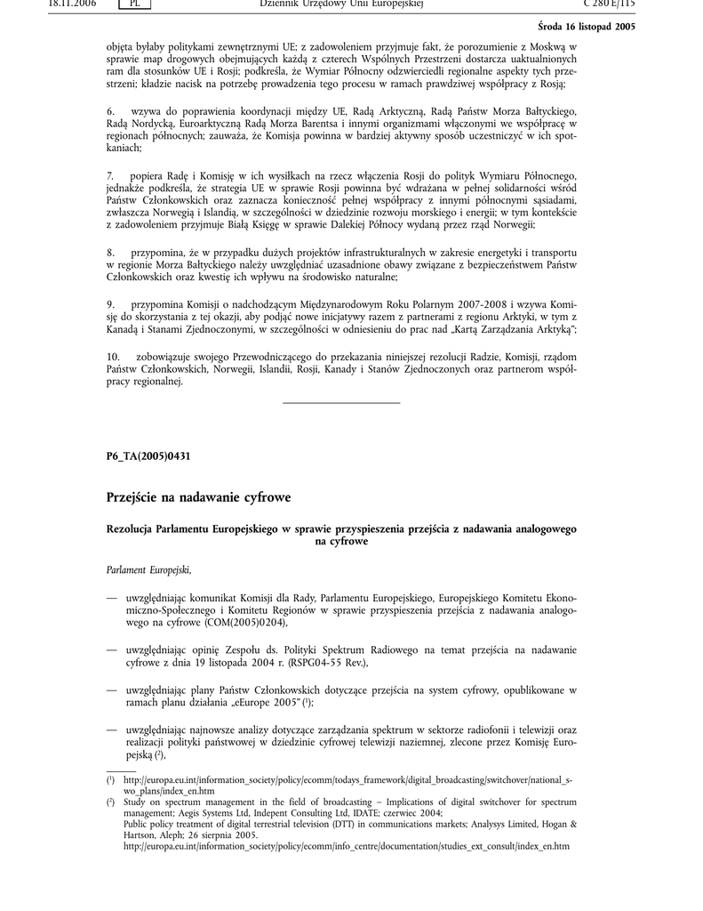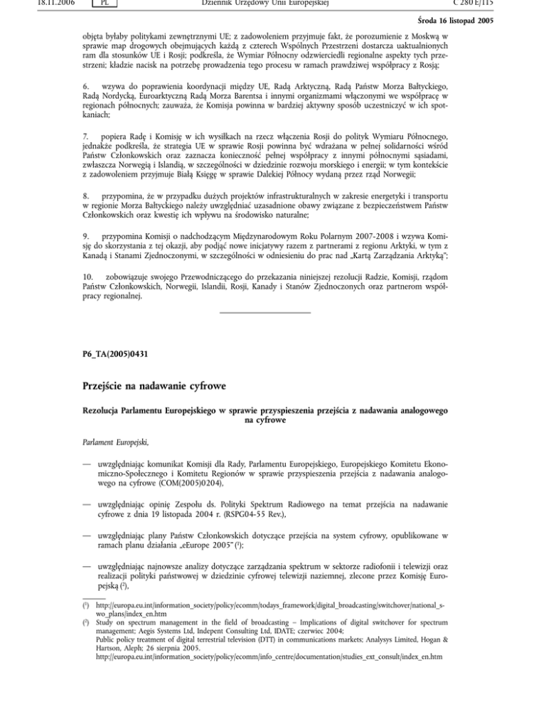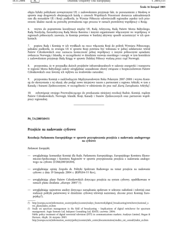18.11.2006 PL Dziennik Urzędowy Unii Europejskiej C 280 E/115 Środa 16 listopad 2005 objęta byłaby politykami zewnętrznymi UE; z zadowoleniem przyjmuje fakt, że porozumienie z Moskwą w sprawie map drogowych obejmujących każdą z czterech Wspólnych Przestrzeni dostarcza uaktualnionych ram dla stosunków UE i Rosji; podkreśla, że Wymiar Północny odzwierciedli regionalne aspekty tych przestrzeni; kładzie nacisk na potrzebę prowadzenia tego procesu w ramach prawdziwej współpracy z Rosją; 6. wzywa do poprawienia koordynacji między UE, Radą Arktyczną, Radą Państw Morza Bałtyckiego, Radą Nordycką, Euroarktyczną Radą Morza Barentsa i innymi organizmami włączonymi we współpracę w regionach północnych; zauważa, że Komisja powinna w bardziej aktywny sposób uczestniczyć w ich spotkaniach; 7. popiera Radę i Komisję w ich wysiłkach na rzecz włączenia Rosji do polityk Wymiaru Północnego, jednakże podkreśla, że strategia UE w sprawie Rosji powinna być wdrażana w pełnej solidarności wśród Państw Członkowskich oraz zaznacza konieczność pełnej współpracy z innymi północnymi sąsiadami, zwłaszcza Norwegią i Islandią, w szczególności w dziedzinie rozwoju morskiego i energii; w tym kontekście z zadowoleniem przyjmuje Białą Księgę w sprawie Dalekiej Północy wydaną przez rząd Norwegii; 8. przypomina, że w przypadku dużych projektów infrastrukturalnych w zakresie energetyki i transportu w regionie Morza Bałtyckiego należy uwzględniać uzasadnione obawy związane z bezpieczeństwem Państw Członkowskich oraz kwestię ich wpływu na środowisko naturalne; 9. przypomina Komisji o nadchodzącym Międzynarodowym Roku Polarnym 2007-2008 i wzywa Komisję do skorzystania z tej okazji, aby podjąć nowe inicjatywy razem z partnerami z regionu Arktyki, w tym z Kanadą i Stanami Zjednoczonymi, w szczególności w odniesieniu do prac nad „Kartą Zarządzania Arktyką”; 10. zobowiązuje swojego Przewodniczącego do przekazania niniejszej rezolucji Radzie, Komisji, rządom Państw Członkowskich, Norwegii, Islandii, Rosji, Kanady i Stanów Zjednoczonych oraz partnerom współpracy regionalnej. P6_TA(2005)0431 Przejście na nadawanie cyfrowe Rezolucja Parlamentu Europejskiego w sprawie przyspieszenia przejścia z nadawania analogowego na cyfrowe Parlament Europejski, — uwzględniając komunikat Komisji dla Rady, Parlamentu Europejskiego, Europejskiego Komitetu Ekonomiczno-Społecznego i Komitetu Regionów w sprawie przyspieszenia przejścia z nadawania analogowego na cyfrowe (COM(2005)0204), — uwzględniając opinię Zespołu ds. Polityki Spektrum Radiowego na temat przejścia na nadawanie cyfrowe z dnia 19 listopada 2004 r. (RSPG04-55 Rev.), — uwzględniając plany Państw Członkowskich dotyczące przejścia na system cyfrowy, opublikowane w ramach planu działania „eEurope 2005” (1); — uwzględniając najnowsze analizy dotyczące zarządzania spektrum w sektorze radiofonii i telewizji oraz realizacji polityki państwowej w dziedzinie cyfrowej telewizji naziemnej, zlecone przez Komisję Europejską (2), (1) http://europa.eu.int/information_society/policy/ecomm/todays_framework/digital_broadcasting/switchover/national_swo_plans/index_en.htm (2) Study on spectrum management in the field of broadcasting – Implications of digital switchover for spectrum management; Aegis Systems Ltd, Indepent Consulting Ltd, IDATE; czerwiec 2004; Public policy treatment of digital terrestrial television (DTT) in communications markets; Analysys Limited, Hogan & Hartson, Aleph; 26 sierpnia 2005. http://europa.eu.int/information_society/policy/ecomm/info_centre/documentation/studies_ext_consult/index_en.htm C 280 E/116 Dziennik Urzędowy Unii Europejskiej PL Środa 16 listopad 2005 — uwzględniając dyrektywę 2002/21/WE Parlamentu Europejskiego i Rady z dnia 7 marca 2002 r. w sprawie wspólnych ram regulacyjnych sieci i usług łączności elektronicznej (dyrektywa ramowa) (1), — uwzględniając swoją rezolucję z dnia 26 września 2002 r. w sprawie planu działania UE dotyczącego pomyślnego wprowadzenia telewizji cyfrowej w Europie (2), — uwzględniając art. 108 ust. 5 i art. 103 ust. 2 Regulaminu, A. mając na uwadze, że przejście z nadawania analogowego na cyfrowe przyniesie korzyści na wszystkich poziomach, umożliwiając oferowanie nowych i ulepszonych usług nadawczych, pozwalając na zwolnienie setek megaherców głównego spektrum, które mogłyby zostać ponownie przyznane do wykorzystania w różnych celach, oraz wzmacniając konkurencję rynkową i innowacyjność; B. mając na uwadze, że USA planują zakończenie naziemnego nadawania analogowego do 1 stycznia 2009 r., Korea Południowa zapowiedziała wyłączenie naziemnego nadawania analogowego z końcem 2010 r., a Japonia – do 2011 r.; mając na uwadze, że niezwykle istotne jest, by Unia Europejska nie pozostawała w tyle za swymi głównymi konkurentami; C. mając na uwadze, że Komisja proponuje początek 2012 r. jako termin wyłączenia nadajników analogowych we wszystkich Państwach Członkowskich, lecz niektóre Państwa Członkowskie nie ogłosiły jeszcze swoich planów przejścia na system cyfrowy; D. mając na uwadze, że proces przejścia na system cyfrowy powinien być kształtowany przez siły rynkowe, zarazem jednak niezbędna jest koordynacja nadawców, pożądana jest też jasna polityczna strategia koordynacji nadawców; E. mając na uwadze, że dyrektywa ramowa zawiera zasadę neutralności technologicznej, nie wyklucza jednak stosowania odpowiednich środków wspierających niektóre szczególne usługi, gdy jest to uzasadnione; F. mając na uwadze, że zbliżająca się Regionalna Konferencja Radiokomunikacyjna 2006 (RRC06) ma zrewidować Regionalne Porozumienie dla Europejskiego Obszaru Nadawczego podpisane w Sztokholmie w 1961 r. z myślą o dokonaniu harmonizacji tej części Porozumienia, która dotyczy korzystania z pasm częstotliwości 1