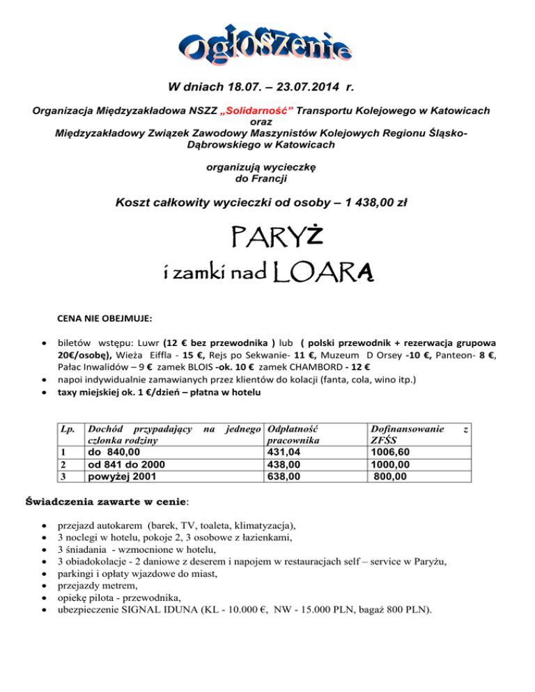 W dniach 18.07. – 23.07.2014 r. Organizacja Międzyzakładowa NSZZ „Solidarność” Transportu Kolejowego w Katowicach oraz Międzyzakładowy Związek Zawodowy Maszynistów Kolejowych Regionu ŚląskoDąbrowskiego w Katowicach organizują wycieczkę do Francji Koszt całkowity wycieczki od osoby – 1 438,00 zł PARYŻ i zamki nad LOARĄ CENA NIE OBEJMUJE: biletów wstępu: Luwr (12 € bez przewodnika ) lub ( polski przewodnik + rezerwacja grupowa 20€/osobę), Wieża Eiffla - 15 €, Rejs po Sekwanie- 11 €, Muzeum D Orsey -10 €, Panteon- 8 €, Pałac Inwalidów – 9 € zamek BLOIS -ok. 10 € zamek CHAMBORD - 12 € napoi indywidualnie zamawianych przez klientów do kolacji (fanta, cola, wino itp.) taxy miejskiej ok. 1 €/dzień – płatna w hotelu Lp. 1 2 3 Dochód przypadający członka rodziny do 840,00 od 841 do 2000 powyżej 2001 na jednego Odpłatność pracownika 431,04 438,00 638,00 Dofinansowanie ZFŚS 1006,60 1000,00 800,00 Świadczenia zawarte w cenie: przejazd autokarem (barek, TV, toaleta, klimatyzacja), 3 noclegi w hotelu, pokoje 2, 3 osobowe z łazienkami, 3 śniadania - wzmocnione w hotelu, 3 obiadokolacje - 2 daniowe z deserem i napojem w restauracjach self – service w Paryżu, parkingi i opłaty wjazdowe do miast, przejazdy metrem, opiekę pilota - przewodnika, ubezpieczenie SIGNAL IDUNA (KL - 10.000 €, NW - 15.000 PLN, bagaż 800 PLN). z RAMOWY PROGRAM IMPREZY: 1 dzień: Zbiórka o godz. 15.00. Przejazd przez Polskę, Niemcy. 2 dzień: Podróż przez terytorium Francji. Przyjazd do hotelu w okolicach Paryża, zakwaterowanie. Przejazd do centrum stolicy zwiedzanie miasta: wyspa La Cité - najstarsza część i kolebka Paryża z Katedrą Notre - Dame, Conciergerie - dawny pałac królewski i więzienie Rewolucji Francuskiej. Spacer do Centrum Pompidou - symbolu nowoczesności z zewnętrznymi rurami, rusztowaniami i windami. Obiadokolacja, Paryż nocą"- wieczorny rejs statkiem po SEKWANIE (11Euro dodatkowo płatny). Powrót do hotelu, nocleg. 3 dzień: Śniadanie, wyjazd do DOLINY LOARY, zwiedzanie: Zamek Królewski w BLOIS, ulubiona rezydencja królów Francji w okresie Renesansu. Zamek jest prawdziwym odzwierciedleniem architektury i historii Zamków nad Loarą – jego cztery skrzydła, reprezentujące odmienne style, a także monumentalne schody, zamykają się wokół dziedzińca, stanowiąc przykład przekroju architektury francuskiej od okresu średniowiecza do klasycyzmu. Zamek w CHAMBORD największa rezydencja w dolinie Loary powstała z inicjatywy Franciszka I i najprawdopodobniej wg pierwotnego projektu Leonarda da Vinci. Czas wolny, Powrót do Paryża, obiadokolacja. Przejazd do hotelu na nocleg. 4 dzień: śniadanie, wyjazd na zwiedzanie Paryża: Muzeum d'Orsay umieszczone w byłym dworcu kolejowym, prezentujące unikalną kolekcję obrazów Wielkich Impresjonistów, Wieża Eiffla, Pola Marsowe, Plac Trocadero. Przejazd tzw. Osią Historyczną do paryskiej "dzielnicy" XXI wieku La Défense - największego centrum biznesu i handlu. Powrót do centrum miasta, spacer pod Łuk Triumfalny i po Champs Elysees - najsłynniejszej alei świata. Przejazd przez plac de la Concorde w okolice Grands Boulevards i Opery Garnier. Wizyta w Muzeum Perfum Fragonard (możliwość zapoznania się z technologią produkcji perfum oraz zakupów po preferencyjnych cenach). Następnie przejedziemy na Plac Vendome, przy którym znajduje się Hotel Ritz. Po południu wizyta na Montmartrze, słynnym wzgórzu artystów, kabaretów i rozrywki. Spacer przez Plac Blanche ze słynnym kabaretem Moulin Rouge, Plac Pigalle, bazylika Sacre Coeur. Zwiedzanie Montmartre'u zakończymy na Place du Tertre, który jest historycznym miejscem powstania najbardziej znanego z nowoczesnych nurtów malarskich impresjonizmu. Obiadokolacja, powrót do hotelu na nocleg. 5dzień: śniadanie. wykwaterowanie z hotelu. Przejazd środkami komunikacji miejskiej do centrum na piesze zwiedzanie miasta: wizyta w Hotel des Invalides z grobem Napoleona. Następnie przejazd do Quartier Latin - dzielnicy pamiętającej czasy Rzymian i uczących się po łacinie studentów najstarszego uniwersytetu paryskiego - Sorbony. Zobaczymy także znajdujący się na wzgórzu świętej Genowefy Pantheon, gdzie spoczywają zasłużeni obywatele Francji, a wśród nich Maria Skłodowska - Curie. W godzinach popołudniowych - zwiedzanie Ogrodów Tuileries i najsłynniejszego muzeum paryskiego, "domu" Giocondy - Muzeum Luwr. W godzinach wieczornych wyjazd do kraju, nocny przejazd przez Niemcy. 6 dzień: Powrót do Polski na miejsce zbiórki w godzinach wieczornych. Zapisy w nieprzekraczalnym terminie do dnia 10 czerwca 2014 r. przyjmowane są w siedzibie Organizacji Związkowych przy ulicy Kościuszki 30 pok. 113. w godzinach 7.00 – 15.00. Wszelkich dodatkowych informacji udzielamy pod numerami telefonów. tel. 727-031-922 (w godz. 7.00 – 15.00). tel. 663-751-001 tel. 667-721-156 Osoba uprawniona, która zrezygnuje z przydzielonego na jej wniosek skierowania, a otrzyma dofinansowanie na podstawie faktury pro - forma będzie obciążona rzeczywistymi kosztami poniesionymi przez Spółkę. Ilość miejsc ograniczona. Organizatorzy imprezy zastrzegają sobie prawo do niezrealizowania w/w imprezy z przyczyn od niego niezależnych.