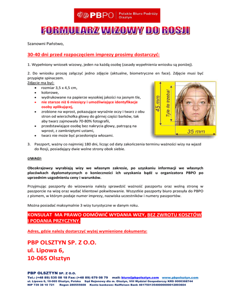 Szanowni Państwo, 30-40 dni przed rozpoczęciem imprezy prosimy dostarczyć: 1. Wypełniony wniosek wizowy, jeden na każdą osobę (zasady wypełnienia wniosku są poniżej). 2. Do wniosku proszę załączyć jedno zdjęcie (aktualne, biometryczne en face). Zdjęcie musi być przypięte spinaczem. Zdjęcie ma być: rozmiar 3,5 x 4,5 cm, kolorowe, wydrukowane na papierze wysokiej jakości na jasnym tle, nie starsze niż 6 miesięcy i umożliwiające identyfikacje osoby aplikującej, zrobione na wprost, pokazujące wyraźnie oczy i twarz z obu stron od wierzchołka głowy do górnej części barków, tak aby twarz zajmowała 70-80% fotografii, przedstawiające osobę bez nakrycia głowy, patrzącą na wprost, z zamkniętymi ustami, twarz nie może być przesłonięta włosami. 3. Paszport, ważny co najmniej 180 dni, licząc od daty zakończenia terminu ważności wizy na wjazd do Rosji, posiadający dwie wolne strony obok siebie. UWAGI: Obcokrajowcy wyrabiają wizy we własnym zakresie, po uzyskaniu informacji we własnych placówkach dyplomatycznych o konieczności ich uzyskania bądź u organizatora PBPO po uprzednim uzgodnieniu ceny i warunków. Przyjmując paszporty do wizowania należy sprawdzić ważność paszportu oraz wolną stronę w paszporcie na wizę oraz wydać klientowi pokwitowanie. Wszystkie paszporty biuro przesyła do PBPO z pismem, w którym podaje numer imprezy, nazwiska uczestników i numery paszportów. Można posiadać maksymalnie 3 wizy turystyczne w danym roku. KONSULAT MA PRAWO ODMÓWIĆ WYDANIA WIZY, BEZ ZWROTU KOSZTÓW I PODANIA PRZYCZYNY. Adres, gdzie należy dostarczyć wyżej wymienione dokumenty: PBP OLSZTYN SP. Z O.O. ul. Lipowa 6, 10-065 Olsztyn PBP OLSZTYN SP. Z O.O. Tel.: (+48 89) 535 08 18 Fax: (+48 89) 679 08 79 mail: [email protected] www.pbpolsztyn.com ul. Lipowa 6, 10-065 Olsztyn, Polska Sąd Rejonowy dla m. Olsztyn, VIII Wydział Gospodarczy KRS 0000368744 NIP 739 38 10 721 Regon 280555608 Konto bankowe: Raiffeisen Bank 46175013540000000012893604 Zasady wypełnienia formularza PBPO przyjmuje wyłącznie elektronicznie wypełnione wnioski wizowe dostępne na stronie Departamentu Konsularnego MSZ Rosji: http://visa.kdmid.ru STRONA I Na tej stronie można wypełnić i wydrukować formularz wizowy w celu uzyskania wizy do Federacji Rosyjskiej. Należy wskazać kraj siedziby placówki dyplomatycznej, urzędu konsularnego, w którym otrzyma Pan/i wizę: POLAND [۷] rozwijana lista Wskazać język, w którym wyświetlać się będą podpowiedzi do wypełnienia formularza POLISH [۷] rozwijana lista Czytamy zamieszczoną niżej informację oraz zaznaczamy [۷] w polu, że się zapoznaliśmy z tą informacją. Następnie wybieramy: Zaznaczyć tę opcję w celu wypełnienia nowego wniosku WYPEŁNIJ NOWY WNIOSEK Wybrać tę opcję w celu wypełnienia wniosku, edycji uprzednio wypełnionego formularza, przeglądu i wydruku wcześniej wypełnionego formularza, utworzenia nowego wniosku na bazie poprzednio wprowadzonych danych OTWÓRZ UPRZEDNIO WYPEŁNIONY FORMULARZ WNIOSKU STRONA II Na tej stronie zostaje nadany numer wypełnianego wniosku wizowego. Wypełniając wniosek wizowy należy pisać DUŻYMI LITERAMI (przy użyciu CAPS LOCK). Nie używamy polskich znaków. Wprowadź hasło PBPO2014 Wprowadź potwierdzenie hasła PBPO2014 Wprowadzić napis z obrazka i kliknąć przycisk „Wyślij”. Jeśli znaki są nieczytelne, ponownie załadować stronę. STRONA III Numer identyfikacyjny Pana/i wniosku …………. Proszę zapisać i zachować numer Pana/i w pewnym i bezpiecznym miejscu. Należy wydrukować numer wniosku, a następnie kontynuować wypełnianie wniosku. WYDRUK WNIOSKU KONTYNUUJ STRONA IV PBP OLSZTYN SP. Z O.O. Tel.: (+48 89) 535 08 18 Fax: (+48 89) 679 08 79 mail: [email protected] www.pbpolsztyn.com ul. Lipowa 6, 10-065 Olsztyn, Polska Sąd Rejonowy dla m. Olsztyn, VIII Wydział Gospodarczy KRS 0000368744 NIP 739 38 10 721 Regon 280555608 Konto bankowe: Raiffeisen Bank 46175013540000000012893604 ZAKŁADKA INFORMACJE DOTYCZĄCE WNIOSKOWANEJ WIZY (do wypełnienia tej części wniosku będziemy potrzebować paszportu). Wybieramy kolejno: obywatelstwo (nationality) POLAND [۷] rozwijana lista zaznaczamy czy mieliśmy wcześniej obywatelstwo ZSRR lub Rosji NO [۷] rozwijana lista wybieramy cel podróży (purpose of visit section) TOURISM [۷] rozwijana lista wybieramy cel podróży (purpose of visit) TOURISM [۷] rozwijana lista automatycznie aplikacja wybiera nam wariant wizy zwykłej turystycznej COMMON TOURIST [۷] rozwijana lista wybieramy liczbę wjazdów SINGLE [۷] rozwijana lista data wjazdu do Rosji Należy podać dokładną datę (z programu wycieczki) data wyjazdu z Rosji Ostatni dzień wycieczki Wybrać przycisk KONTYNUUJ STRONA V ZAKŁADKA DANE OSOBOWE Wpisujemy nazwisko z paszportu oraz imię (imiona) Have you ever had other names? Panie, które zawarły związek małżeński proszone są o kliknięcie YES/NO [۷] rozwijana lista w polu, które się ukaże poniżej należy wpisać nazwisko panieńskie. Wypełniamy pola: płeć, data urodzenia, miejsce urodzenia Jeśli Pani urodził/a się w Rosji, wpisać „yes” i podać kiedy i do jakiego kraju Pan/i wyemigrował/a Jeśli nie, wybrać z listy opadającej YES/NO [۷] rozwijana lista Aby zapisać dane, które uzupełniliśmy do tej pory wpisaliśmy klikamy >ZACHOWAJ KOPIĘ ROBOCZĄ, a następnie wybieramy >KONTYNUUJ. STRONA VI PBP OLSZTYN SP. Z O.O. Tel.: (+48 89) 535 08 18 Fax: (+48 89) 679 08 79 mail: [email protected] www.pbpolsztyn.com ul. Lipowa 6, 10-065 Olsztyn, Polska Sąd Rejonowy dla m. Olsztyn, VIII Wydział Gospodarczy KRS 0000368744 NIP 739 38 10 721 Regon 280555608 Konto bankowe: Raiffeisen Bank 46175013540000000012893604 ZAKŁADKA DANE PASZORTOWE numer paszportu (wpisujemy bez spacji, np. AA1234567), data wydania, data upływu ważności (wg dat w paszporcie) Aby zapisać dane, które uzupełniliśmy do tej pory wpisaliśmy klikamy >ZACHOWAJ KOPIĘ ROBOCZĄ, a następ