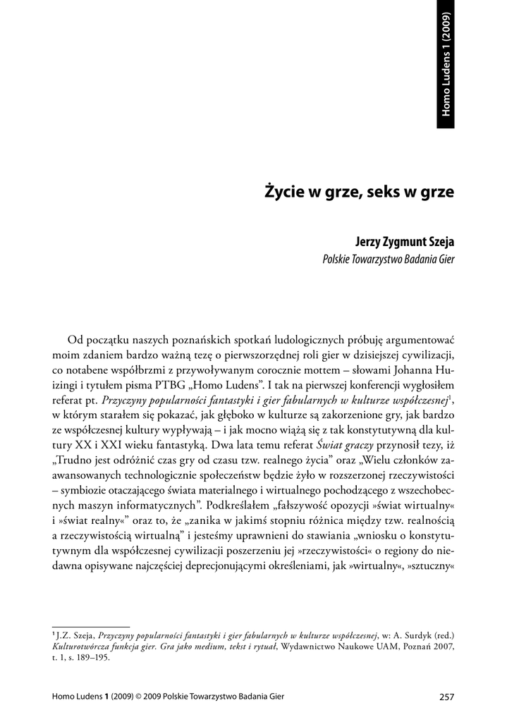Homo Ludens 1 (2009) Życie w grze, seks w grze Jerzy Zygmunt Szeja Polskie Towarzystwo Badania Gier Od początku naszych poznańskich spotkań ludologicznych próbuję argumentować moim zdaniem bardzo ważną tezę o pierwszorzędnej roli gier w dzisiejszej cywilizacji, co notabene współbrzmi z przywoływanym corocznie mottem – słowami Johanna Huizingi i tytułem pisma PTBG „Homo Ludens”. I tak na pierwszej konferencji wygłosiłem referat pt. Przyczyny popularności fantastyki i gier fabularnych w kulturze współczesnej1, w którym starałem się pokazać, jak głęboko w kulturze są zakorzenione gry, jak bardzo ze współczesnej kultury wypływają – i jak mocno wiążą się z tak konstytutywną dla kultury XX i XXI wieku fantastyką. Dwa lata temu referat Świat graczy przynosił tezy, iż „Trudno jest odróżnić czas gry od czasu tzw. realnego życia” oraz „Wielu członków zaawansowanych technologicznie społeczeństw będzie żyło w rozszerzonej rzeczywistości – symbiozie otaczającego świata materialnego i wirtualnego pochodzącego z wszechobecnych maszyn informatycznych”. Podkreślałem „fałszywość opozycji »świat wirtualny« i »świat realny«” oraz to, że „zanika w jakimś stopniu różnica między tzw. realnością a rzeczywistością wirtualną” i jesteśmy uprawnieni do stawiania „wniosku o konstytutywnym dla współczesnej cywilizacji poszerzeniu jej »rzeczywistości« o regiony do niedawna opisywane najczęściej deprecjonującymi określeniami, jak »wirtualny«, »sztuczny« J.Z. Szeja, Przyczyny popularności fantastyki i gier fabularnych w kulturze współczesnej, w: A. Surdyk (red.) Kulturotwórcza funkcja gier. Gra jako medium, tekst i rytuał, Wydawnictwo Naukowe UAM, Poznań 2007, t. 1, s. 189–195. 1 Homo Ludens 1 (2009) © 2009 Polskie Towarzystwo Badania Gier 257 Życie w grze, seks w grze J.Z. Szeja i »fantastyczny«2. Rok temu ośmieliłem się w zakończeniu tekstu Cywilizacja zabawy? Próba spojrzenia w przyszłość pójść krok dalej i stwierdzić: „inaczej określone stosunki i podziały społeczne mogą przynieść nową jakość w przepływie informacji. Dotychczasowe wspólnoty terytorialne nie bywały zaprzęgane do rozwiązywania problemów ekonomicznych czy jakichkolwiek innych, prócz politycznych. Nie pozwalał na to charakter związków takich społeczności i typ obiegu informacji. Wielotysięczne a nawet wielomilionowe grupy połączone typem AR i zespalane celowościowo mogą okazać się zdolne do radykalnej zmiany jakościowej cywilizacji – do przyspieszenia rozwoju jej potencjału w takich kierunkach, których określanie byłoby dzisiaj nawet nie futurologią, ale zwykłym wróżeniem”3. Tymczasem „nowe czasy” zdają się nadchodzić szybciej, niż myślałem jeszcze rok temu, w błogostanie wzrostu ekonomicznego. Kiedyś się mówiło, że motorem napędu rozwoju jest wojna. Dzisiaj, w czasach permanentnej wojny, w której nie brak zabitych, choć brak frontów, motorem rozwoju są kryzysy, które nakazują przewartościować dotychczasowe myślenie. To, co zdawało się odległe, puka do naszych drzwi. Na poparcie tej tezy proponuję dwa urywki prasowe z tytułów opiniotwórczych. Pierwszy, przychylnie spoglądający na gry, autorstwa Dariusza Fabiszewskiego, pochodzi z „Rzeczypospolitej” z 31 października 2008 roku: Czy kiedykolwiek, widząc dziecko z konsolą do gier wideo w ręku, pomyśleliśmy, że właśnie kształtuje ono w sobie zdolności przydatne w przyszłości w biznesie? Okazuje się, że gry komputerowe rozwijają umiejętności, których firmy coraz częściej poszukują […]. W rzeczywistości umiejętności potrzebne do osiągnięcia sukcesu w grach mogą pomóc młodym ludziom „rozwijać myślenie strategiczne i zdolności przywódcze“. John C. Beck i Mitchell Wade, autorzy książki „Dzieciaki są w porządku: jak pokolenie graczy zmienia rynek pracy“, twierdzą, że gry wideo mogą spełniać ważną rolę we wspieraniu młodych ludzi w rozwoju, ponieważ wymagają one od nich wykorzystania różnych umiejętności psychicznych i społecznych potrzebnych później w życiu. Szczególnie dostrzegalne jest to w branży IT. Dzisiejsza ewolucja zmierzająca w kierunku architektury zorientowanej na usługi (SOA) wymaga zarówno od informatyków, jak i menedżerów zdobycia umiejętności wybiegających poza ich codzienną specyfikę działania. Dlatego granie na komputerze może być formą nauki, która łączy rozwój zarówno umiejętności biznesowych, jak i informatycznych. Podobnie jak piloci, którzy korzystają z symulatorów lotu, aby nauczyć się latać samolotem, studenci studiów zarządzania IT, którzy wychowali się, grając 2 J.Z. Szeja, Świat graczy, w: A. Surdyk, J.Z. Szeja (red.), Kulturotwórcza funkcja gier. Gra w kontekście edukacyjnym, społecznym i medialnym, „Homo Communicativus”, nr 2(4), Poznań 2008, s. 13–21, <http://www.hc.amu. edu.pl/numery/4/szeja.pdf>. 3 J.Z. Szeja, Cywilizacja zabawy? Próba spojrzenia w przyszłość, w: A. Surdyk, J.Z. Szeja (red.), Kulturotwórcza funkcja gier. Cywilizacja zabawy czy zabawy cywilizacji? Rola gier we współczesności, „Homo Communicativus”, nr 3(5), Poznań 2008, s. 147–154, <http://www.hc.amu.edu.pl/numery/5/szeja.pdf>. 258 Homo Ludens 1 (2009) © 2009 Polskie Towarzystwo Badania Gier Życie w grze, seks w grze J.Z. Szeja w gry wideo, mogą się angażować w naukę w sposób, w jaki sprawia im to przyjemność i do jakiego są przyzwyczajeni. Według firmy Apply Group, zajmującej się konsultingiem biznesowym, co najmniej 100 największych firm świata z notowanych obecnie na liście Global Fortune 500 będzie używać gier komputerowych do edukacji swoich pracowników jeszcze przed 2012 rokiem. Dzięki grom na naszych oczach powstaje nowe środowisko biznesowe. Już dzisiaj setki tysięcy graczy samodzielnie łączą swoje siły, aby pomyślnie zakończyć ko