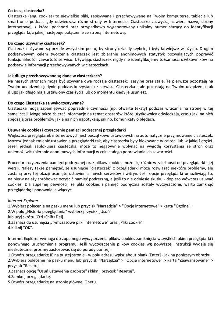 Co to są ciasteczka? Ciasteczka (ang. cookies) to niewielkie pliki, zapisywane i przechowywane na Twoim komputerze, tablecie lub smartfonie podczas gdy odwiedzasz różne strony w Internecie. Ciasteczko zazwyczaj zawiera nazwę strony internetowej, z której pochodzi oraz przypadkowo wygenerowany unikalny numer służący do identyfikacji przeglądarki, z jakiej następuje połączenie ze stroną internetową. Do czego używamy ciasteczek? Ciasteczka używane są przede wszystkim po to, by strony działały szybciej i były łatwiejsze w użyciu. Drugim podstawowym celem tworzenia ciasteczek jest zbieranie anonimowych statystyk pozwalających poprawić funkcjonalność i zawartość serwisu. Używając ciasteczek nigdy nie identyfikujemy tożsamości użytkowników na podstawie informacji przechowywanych w ciasteczkach. Jak długo przechowywane są dane w ciasteczkach? Na naszych stronach mogą być używane dwa rodzaje ciasteczek: sesyjne oraz stałe. Te pierwsze pozostają na Twoim urządzeniu jedynie podczas korzystania z serwisu. Ciasteczka stałe pozostają na Twoim urządzeniu tak długo jak długo mają ustawiony czas życia lub do momentu kiedy je usuniesz. Do czego Ciasteczka są wykorzystywane? Ciasteczka mogą zapamiętywać poprzednie czynności (np. otwarte teksty) podczas wracania na stronę w tej samej sesji. Mogą także zbierać informacje na temat obszarów które użytkownicy odwiedzają, czasu jaki na nich spędzają oraz problemów jakie na nich napotykają, jak np. komunikaty o błędach. Usuwanie cookies i czyszczenie pamięci podręcznej przeglądarki Większość przeglądarek internetowych jest początkowo ustawionych na automatyczne przyjmowanie ciasteczek. Możesz jednak zmienić ustawienia przeglądarki tak, aby ciasteczka były blokowane w całości lub w jakiejś części. Jeżeli jednak zablokujesz ciasteczka, może to negatywnie wpłynąć na wygodę korzystania ze stron oraz uniemożliwić zbieranie anonimowych informacji w celu stałego poprawiania ich zawartości. Procedura czyszczenia pamięci podręcznej oraz plików cookies może się różnić w zależności od przeglądarki i jej wersji. Należy także pamiętać, że usunięcie "ciasteczek" z przeglądarki może rozwiązać niektóre problemy, ale zostaną przy tej okazji usunięte ustawienia innych serwisów i witryn. Jeśli opcje przeglądarki umożliwiają to, najpierw należy spróbować oczyścić pamięć podręczną, a jeśli to nie odniesie skutku - dopiero wówczas usuwać cookies. Dla zupełnej pewności, że pliki cookies i pamięć podręczna zostały wyczyszczone, warto zamknąć przeglądarkę i ponownie ją włączyć. Internet Explorer 1.Wybierz polecenie na pasku menu lub przycisk "Narzędzia" > "Opcje internetowe" > karta "Ogólne". 2.W polu „Historia przeglądania" wybierz przycisk „Usuń” lub użyj skrótu [Ctrl+Shift+Del]. 3.Zaznacz do usunięcia „Tymczasowe pliki internetowe” oraz „Pliki cookie”. 4.Kliknij "OK". Internet Explorer wymaga do zupełnego wyczyszczenia plików cookies zamknięcia wszystkich okien przeglądarki i ponownego uruchomienia programu. Jeśli wyczyszczenie plików cookies wg powyższej instrukcji wydaje się nieskuteczne, prosimy zastosować się do porady poniżej: 1.Otwórz przeglądarkę IE na pustej stronie - w polu adresu wpisz about:blank [Enter] - jak na poniższym obrazku: 2.Wybierz polecenie na pasku menu lub przycisk "Narzędzia" > "Opcje internetowe" > karta "Zaawansowane" > przycisk "Resetuj…" 3.Zaznacz opcję "Usuń ustawienia osobiste" i kliknij przycisk "Resetuj". 4.Zamknij przeglądarkę. 5.Otwórz przeglądarkę na stronie głównej Onetu. Mozilla Firefox 1.Wybierz polecenie na pasku menu "Narzędzia". 2.Wybierz polecenie „Wyczyść historię przeglądania” lub użyj skrótu [Ctrl+Shift+Del]. 3.Wybierz "Okres do wyczyszczenia": wszystko. 4.Na liście szczegółów zaznacz pozycje „Ciasteczka”, „Pamięć podręczna” oraz "Aktywne zalogowania". 5.Naciśnij przycisk „Wyczyść teraz”. Jeśli próba nie zakończyła się powodzeniem, zamknij wszystkie okna przeglądarki i ponownie uruchom program. Google Chrome 1.Wybierz przycisk "Ustawienia" > "Narzędzia" > "Wyczyść dane przeglądania" lub użyj skrótu [Ctrl+Shift+Del]. 2.W oknie dialogowym "Wyczyść historię przeglądania" wybierz "Wyczyść poniższe elementy za okres: od samego początku", następnie zaznacz opcje: - "Opróżnij pamięć podręczną" - "Usuń pliki cookie oraz inne dane witryn i wtyczek". 3.Naciśnij przycisk "Wyczyść dane przeglądarki". Opera 1.Wybierz polecenie na pasku menu "Narzędzia". 2.Wybierz polecenie „Wyczyść historię przeglądania”. 3.Na liście szczegółów zaznacz pozycje „Usuń wszystkie ciasteczka” oraz „Usuń całą zawartość pamięci podręcznęj”. 4.Naciśnij przycisk "Usuń". Safari Windows 1.Wybierz przycisk "Ustawienia" > "Resetuj Safari..." 2.Zaznacz pozycję,"Usuń wszystkie dane witryn". 3.Naciśnij przycisk "Wyzeruj". Mac 1.Wybierz opcję Wyzeruj Safari... z menu przeglądarki Safari. 2.Zaznacz wszystkie elementy lub wybierz: "Opróżnij pamięć podręczną", "Usuń wszystkie pliki cookie", "Usuń zapamiętane nazwy i hasła". 3.Naciśnij przycisk "Wyzeruj".