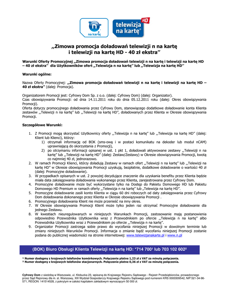 ,,Zimowa promocja doładowań telewizji n na kartę i telewizji na kartę HD - 40 zł ekstra’’ Warunki Oferty Promocyjnej ,,Zimowa promocja doładowań telewizji n na kartę i telewizji na kartę HD – 40 zł ekstra’’ dla Użytkowników ofert ,,Telewizja n na kartę’’ lub ,,Telewizja na kartę HD’’ Warunki ogólne: Nazwa Oferty Promocyjnej: ,,Zimowa promocja doładowań telewizji n na kartę i telewizji na kartę HD – 40 zł ekstra’’ (dalej: Promocja). Organizatorem Promocji jest: Cyfrowy Dom Sp. z o.o. (dalej: Cyfrowy Dom) (dalej: Organizator). Czas obowiązywania Promocji: od dnia 14.11.2011 roku do dnia 05.12.2011 roku (dalej: Okres obowiązywania Promocji). Oferta dotyczy promocyjnego doładowania przez Cyfrowy Dom, stanowiącego dodatkowe doładowanie konta Klienta zestawów ,,Telewizji n na kartę’’ lub ,,Telewizji na kartę HD’’, doładowanych przez Klienta w Okresie obowiązywania Promocji. Szczegółowe Warunki: 1. Z Promocji mogą skorzystać Użytkownicy oferty ,,Telewizja n na kartę’’ lub ,,Telewizja na kartę HD’’ (dalej: Klient lub Klienci), którzy: 1) otrzymali informację od BOK (sms-ową i w postaci komunikatu na dekoder lub moduł nCAM) uprawniającą do skorzystania z Promocji), 2) po otrzymaniu informacji opisanej w ust. 1 pkt 1, doładowali aktywowane zestawy ,,Telewizji n na kartę’’ lub ,,Telewizji na kartę HD’’ (dalej: Zestaw/Zestawy) w Okresie obowiązywania Promocji, kwotą co najmniej 40 zł, jednorazowo. 2. W ramach Promocji Klienci, którzy doładują Zestawy w ramach ofert ,,Telewizji n na kartę’’ lub ,,Telewizji na kartę HD’’ w Okresie obowiązywania Promocji uzyskują, bezpłatnie, dodatkowe doładowanie o wartości 40 zł (dalej: Promocyjne doładowanie). 3. W przypadkach opisanych w ust. 2 powyżej decydujące znaczenie dla uzyskania benefitu przez Klienta będzie miała data zaksięgowania doładowania wykonanego przez Klienta, zarejestrowana przez Cyfrowy Dom. 4. Promocyjne doładowanie może być wykorzystane tylko na Dostęp do Pakietu Domowego HD lub Pakietu Domowego HD Premium w ramach oferty ,,Telewizja n na kartę’’ lub „Telewizja na kartę HD”. 5. Promocyjne doładowanie zasili konto Klienta w ciągu 60 dni roboczych od daty zaksięgowania przez Cyfrowy Dom doładowania dokonanego przez Klienta w Okresie obowiązywania Promocji . 6. Promocyjnego doładowania Klient nie może przenieść na inny okres. 7. W Okresie obowiązywania Promocji Klient może tylko jeden raz otrzymać Promocyjne doładowanie dla jednego Zestawu. 8. W kwestiach nieuregulowanych w niniejszych Warunkach Promocji, zastosowanie mają postanowienia odpowiednio Przewodnika Użytkownika wraz z Przewodnikiem po ofercie ,,Telewizja n na kartę’’ albo Przewodnika Użytkownika wraz z Przewodnikiem po ofercie ,,Telewizja n na kartę’’. 9. Organizator Promocji zastrzega sobie prawo do wycofania niniejszej Promocji w dowolnym terminie lub zmiany niniejszych Warunków Promocji. Informacja o zmianie bądź wycofaniu niniejszej Promocji zostanie podana do publicznej wiadomości na stronie internetowej: www.telewizjanakarte.pl i www.n.pl (BOK) Biuro Obsługi Klienta Telewizji na kartę HD: *714 700¹ lub 703 102 602² ¹ Numer dostępny z krajowych telefonów komórkowych. Połączenie płatne 1,23 zł z VAT za minutę połączenia. ² Numer dostępny z krajowych telefonów stacjonarnych. Połączenie płatne 0,36 zł z VAT za minutę połączenia. Cyfrowy Dom z siedzibą w Warszawie, ul. Kłobucka 23, wpisaną do Krajowego Rejestru Sądowego - Rejestr Przedsiębiorców, prowadzonego przez Sąd Rejonowy dla m. st. Warszawy, XIII Wydział Gospodarczy Krajowego Rejestru Sądowego pod numerem KRS 0000309542, NIP:521-34-96571, REGON: 141514528, z pokrytym w całości kapitałem zakładowym wynoszącym 50 000 zł.