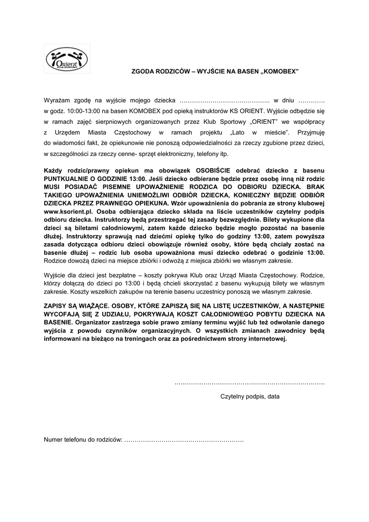 ZGODA RODZICÓW – WYJŚCIE NA BASEN „KOMOBEX” Wyrażam zgodę na wyjście mojego dziecka …………………………………….. w dniu …………. w godz. 10:00-13:00 na basen KOMOBEX pod opieką instruktorów KS ORIENT. Wyjście odbędzie się w ramach zajęć sierpniowych organizowanych przez Klub Sportowy „ORIENT” we współpracy z Urzędem Miasta Częstochowy w ramach projektu „Lato w mieście”. Przyjmuję do wiadomości fakt, że opiekunowie nie ponoszą odpowiedzialności za rzeczy zgubione przez dzieci, w szczególności za rzeczy cenne- sprzęt elektroniczny, telefony itp. Każdy rodzic/prawny opiekun ma obowiązek OSOBIŚCIE odebrać dziecko z basenu PUNTKUALNIE O GODZINIE 13:00. Jeśli dziecko odbierane będzie przez osobę inną niż rodzic MUSI POSIADAĆ PISEMNE UPOWAŻNIENIE RODZICA DO ODBIORU DZIECKA. BRAK TAKIEGO UPOWAŻNIENIA UNIEMOŻLIWI ODBIÓR DZIECKA, KONIECZNY BĘDZIE ODBIÓR DZIECKA PRZEZ PRAWNEGO OPIEKUNA. Wzór upoważnienia do pobrania ze strony klubowej www.ksorient.pl. Osoba odbierająca dziecko składa na liście uczestników czytelny podpis odbioru dziecka. Instruktorzy będą przestrzegać tej zasady bezwzględnie. Bilety wykupione dla dzieci są biletami całodniowymi, zatem każde dziecko będzie mogło pozostać na basenie dłużej. Instruktorzy sprawują nad dziećmi opiekę tylko do godziny 13:00, zatem powyższa zasada dotycząca odbioru dzieci obowiązuje również osoby, które będą chciały zostać na basenie dłużej – rodzic lub osoba upoważniona musi dziecko odebrać o godzinie 13:00. Rodzice dowożą dzieci na miejsce zbiórki i odwożą z miejsca zbiórki we własnym zakresie. Wyjście dla dzieci jest bezpłatne – koszty pokrywa Klub oraz Urząd Miasta Częstochowy. Rodzice, którzy dołączą do dzieci po 13:00 i będą chcieli skorzystać z basenu wykupują bilety we własnym zakresie. Koszty wszelkich zakupów na terenie basenu uczestnicy ponoszą we własnym zakresie. ZAPISY SĄ WIĄŻĄCE. OSOBY, KTÓRE ZAPISZĄ SIĘ NA LISTĘ UCZESTNIKÓW, A NASTĘPNIE WYCOFAJĄ SIĘ Z UDZIAŁU, POKRYWAJĄ KOSZT CAŁODNIOWEGO POBYTU DZIECKA NA BASENIE. Organizator zastrzega sobie prawo zmiany terminu wyjść lub też odwołanie danego wyjścia z powodu czynników organizacyjnych. O wszystkich zmianach zawodnicy będą informowani na bieżąco na treningach oraz za pośrednictwem strony internetowej. ………………………………………………………………. Czytelny podpis, data Numer telefonu do rodziców: ………………………………………………….