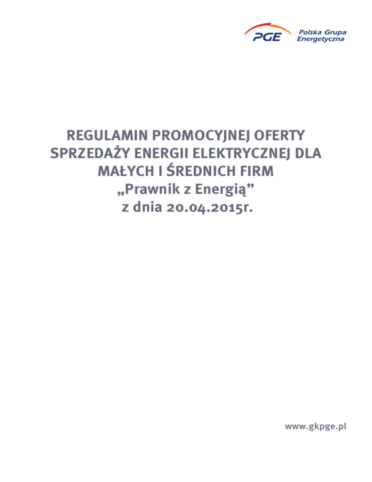 REGULAMIN PROMOCYJNEJ OFERTY SPRZEDAŻY ENERGII ELEKTRYCZNEJ DLA MAŁYCH I ŚREDNICH FIRM „Prawnik z Energią” z dnia 20.04.2015r. www.gkpge.pl SPIS TREŚCI 1. INFORMACJE OGÓLNE 4 2. OKRES OBOWIĄZYWANIA OFERTY. 5 3. ZASADY KWALIFIKACJI ODBIORCÓW 5 4. CENY ENERGII ELEKTRYCZNEJ 6 5. POSTANOWIENIA KOŃCOWE 6 3 1. INFORMACJE OGÓLNE 2. OKRES OBOWIĄZYWANIA OFERTY. 1.1 Niniejsza Oferta dedykowana jest dla Odbiorców, o których mowa w pkt. 3.1., którzy w okresie obowiązywania Oferty posiadają lub zawrą z PGE Obrót S.A. umowy sprzedaży energii elektrycznej lub umowy sprzedaży energii elektrycznej i świadczenia usług dystrybucji – umowy kompleksowe. 1.2 Oferta zawiera wysokość oraz warunki stosowania: a. cen za energię elektryczną; b. stawek opłat handlowych; 1.3 Ofertę stosuje się w rozliczeniach z Odbiorcami, dokonującymi zakupu energii na własny użytek, stosownie do zakresu zawartych umów sprzedaży energii elektrycznej lub umów kompleksowych. 1.4 Ustalone w Ofercie ceny i stawki opłat nie zawierają podatku od towarów i usług (VAT). W odniesieniu do nich podatek VAT nalicza się zgodnie z obowiązującymi przepisami. 1.5 Ceny i stawki ustalone w Ofercie nie zawierają opłat z tytułu dystrybucji energii elektrycznej. Dla Odbiorców zawierających w ramach Oferty umowy kompleksowe opłata za dystrybucję energii elektrycznej zostanie naliczona zgodnie z aktualną taryfą dla usług dystrybucji energii elektrycznej właściwego OSD. W przypadku umów sprzedaży energii elektrycznej rozliczenia usługi dystrybucji dokonywane będą na podstawie umowy o świadczenie usług dystrybucji energii elektrycznej zawartej przez Odbiorcę z właściwym OSD. Cena za dystrybucję może ulec zmianie w przypadku zmiany powyższej taryfy dystrybucji. 1.6 W przypadku zawarcia umowy kompleksowej / sprzedaży energii elektrycznej w związku z przyjęciem przez Odbiorcę Oferty, rozpoczęcie sprzedaży energii elektrycznej w ramach Oferty nastąpi, w terminie określonym w Umowie, a w przypadku Odbiorców dokonujących zmiany sprzedawcy energii dodatkowo nie wcześniej niż w dniu pozytywnej weryfikacji przez właściwego OSD zgłoszonej Umowy sprzedaży, zgodnie z zapisami IRiESD danego OSD i po uprzednim: a. przyjęciu umowy sprzedaży energii elektrycznej do realizacji przez OSD. b. zawarciu przez Odbiorcę z OSD umowy o świadczenie usług dystrybucji energii elektrycznej. c. rozpoczęciu świadczenia przez OSD usługi dystrybucji. 4 2.1 Oferta ma charakter limitowany i obowiązuje w okresie od 20.04.2015r. do 31.10.2015r. Sprzedawca zastrzega sobie prawo do skrócenia okresu obowiązywania Oferty przed terminem wskazanym w zdaniu poprzednim w przypadku wykorzystania przewidzianej ilości Ofert. 2.2 W okresie obowiązywania Oferty przez okres 12 miesięcy, liczonych od 1-szego dnia miesiąca kalendarzowego następującego po skutecznym wejściu w życie umowy w ramach niniejszej Oferty, o której mowa pkt. 3.1 lit. c) z PGE Obrót S.A. Odbiorca zostanie objęty pakietem usług prawnych na zasadach określonych w dokumencie - Regulamin świadczenia Usługi Prawnik Direct dla Klientów PGE Obrót S.A. 3. ZASADY KWALIFIKACJI ODBIORCÓW 3.1 Z niniejszej Oferty mogą skorzystać Odbiorcy, którzy: a. korzystają lub będą korzystać z grup taryfowych: C21, C22a, C22b, C22w, C23, C24, C11, C11o, C11s, C12a, C12b, C12o, C12w PGE Obrót S.A.; b. są przyłączeni do sieci OSD, z którym Sprzedawca posiada podpisaną generalną umowę dystrybucyjną w przypadku umów sprzedaży energii elektrycznej lub są przyłączeni do sieci OSD, którym jest PGE Dystrybucja S.A. w przypadku umów kompleksowych i/lub umów sprzedaży energii elektrycznej; c. zawrą umowę na sprzedaż energii elektrycznej lub umowę kompleksową, na czas nie krótszy niż do końca okresu gwarancji cen; d. nie posiadają przedpłatowego układu pomiarowo – rozliczeniowego; e. nie posiadają zaległych zobowiązań wobec przedsiębiorstw energetycznych; f. nie figurują w żadnym z rejestrów dłużników 3.2 Odbiorca ma prawo wyboru grupy taryfowej jednostrefowej lub grupy wielostrefowej, pod warunkiem zgodności wybranych stref rozliczeniowych ze strefami obowiązującymi w rozliczeniu usług dystrybucji, determinowanej możliwościami zainstalowanych układów pomiarowo - rozliczeniowych. 3.3 Odbiorcy korzystający z innych Ofert promocyjnych Sprzedawcy, mogą skorzystać z niniejszej oferty w zakresie zawieranej umowy na nowy punkt poboru energii elektrycznej. 5 3.4 W przypadku umów zawartych na czas nieokreślony, w okresie obowiązywania niniejszej Oferty, umowy do których została przyjęta niniejsza Oferta przekształcają się w umowy zawarte na czas określony. Po upływie okresu obowiązywania niniejszej Oferty umowy, o których mowa w zdaniu pierwszym, przekształcają się w umowy zawarte na czas nieokreślony. 4. CENY ENERGII ELEKTRYCZNEJ Sprzedaży Energii Elektrycznej lub Umowy kompleksowej sprzedaży energii elektrycznej i świadczenia usług dystrybucji oraz Regulaminu wykonywania umów kompleksowych PGE Obrót S.A. oraz Regulaminu świadczenia Usługi Prawnik Direct dla Klientów PGE Obrót S.A., który stanowi integralną cześć Oferty. 5.2 Niniejsza Oferta nie łączy się z innymi Ofertami, których organizatorem jest Sprzedawca. Tabela 1 4.1 Sprzedawca gwarantuje niezmienność cen energii elektrycznej i stawek opłaty handlowej zawartych w Tabeli nr 1 od momentu określonego w umowie do 30.06.2017r., z zastrzeżeniem pkt. 4.4. Poniższa gwarancja nie dotyczy cen i stawek opłat za usługi dystrybucji energii elektrycznej. 4.2 Po upływie okresu gwarancji ceny Odbiorca będzie rozliczany za zakupioną energię wg cen i stawek opłat z grupy taryfowej określonej w umowie sprzedaży energii elektrycznej lub umowie kompleksowej zgodnie z obowiązującą taryfą PGE Obrót S.A. 4.3 W przypadku rozwiązania Umowy lub w przypadku uniemożliwienia realizacji sprzedaży energii elektrycznej, 