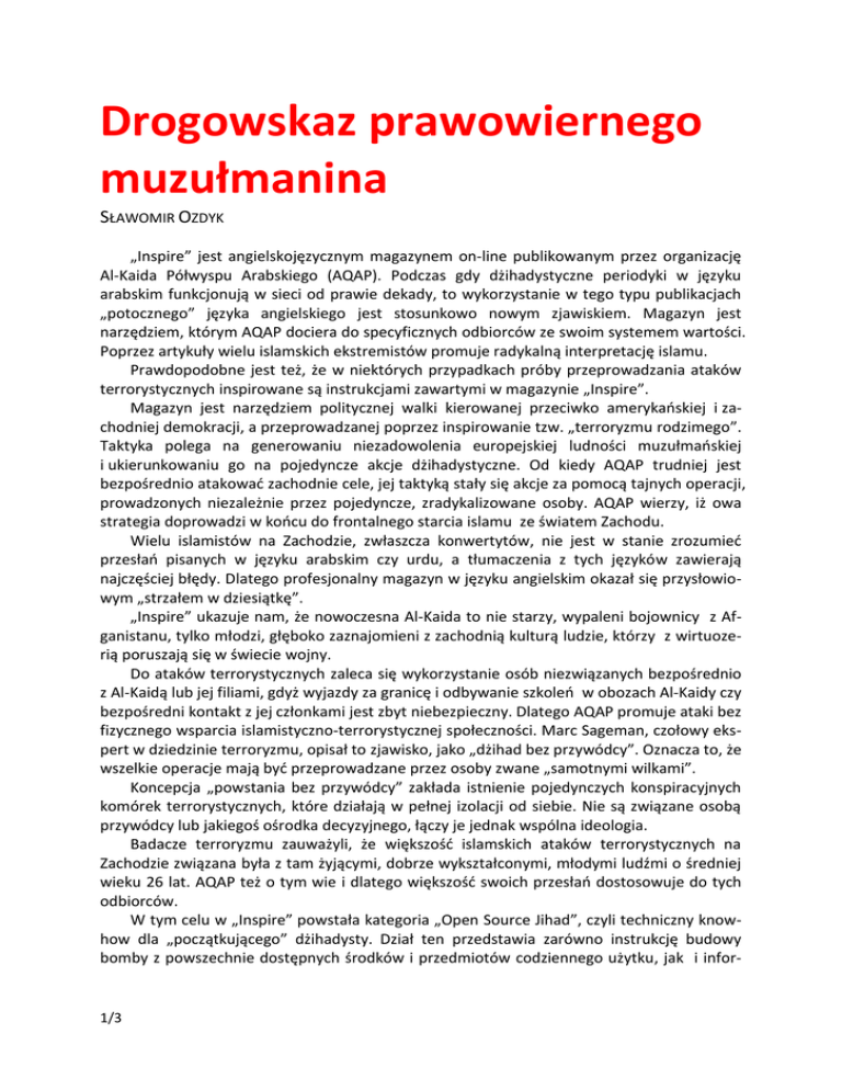 Drogowskaz prawowiernego muzułmanina SŁAWOMIR OZDYK „Inspire” jest angielskojęzycznym magazynem on-line publikowanym przez organizację Al-Kaida Półwyspu Arabskiego (AQAP). Podczas gdy dżihadystyczne periodyki w języku arabskim funkcjonują w sieci od prawie dekady, to wykorzystanie w tego typu publikacjach „potocznego” języka angielskiego jest stosunkowo nowym zjawiskiem. Magazyn jest narzędziem, którym AQAP dociera do specyficznych odbiorców ze swoim systemem wartości. Poprzez artykuły wielu islamskich ekstremistów promuje radykalną interpretację islamu. Prawdopodobne jest też, że w niektórych przypadkach próby przeprowadzania ataków terrorystycznych inspirowane są instrukcjami zawartymi w magazynie „Inspire”. Magazyn jest narzędziem politycznej walki kierowanej przeciwko amerykańskiej i zachodniej demokracji, a przeprowadzanej poprzez inspirowanie tzw. „terroryzmu rodzimego”. Taktyka polega na generowaniu niezadowolenia europejskiej ludności muzułmańskiej i ukierunkowaniu go na pojedyncze akcje dżihadystyczne. Od kiedy AQAP trudniej jest bezpośrednio atakować zachodnie cele, jej taktyką stały się akcje za pomocą tajnych operacji, prowadzonych niezależnie przez pojedyncze, zradykalizowane osoby. AQAP wierzy, iż owa strategia doprowadzi w końcu do frontalnego starcia islamu ze światem Zachodu. Wielu islamistów na Zachodzie, zwłaszcza konwertytów, nie jest w stanie zrozumieć przesłań pisanych w języku arabskim czy urdu, a tłumaczenia z tych języków zawierają najczęściej błędy. Dlatego profesjonalny magazyn w języku angielskim okazał się przysłowiowym „strzałem w dziesiątkę”. „Inspire” ukazuje nam, że nowoczesna Al-Kaida to nie starzy, wypaleni bojownicy z Afganistanu, tylko młodzi, głęboko zaznajomieni z zachodnią kulturą ludzie, którzy z wirtuozerią poruszają się w świecie wojny. Do ataków terrorystycznych zaleca się wykorzystanie osób niezwiązanych bezpośrednio z Al-Kaidą lub jej filiami, gdyż wyjazdy za granicę i odbywanie szkoleń w obozach Al-Kaidy czy bezpośredni kontakt z jej członkami jest zbyt niebezpieczny. Dlatego AQAP promuje ataki bez fizycznego wsparcia islamistyczno-terrorystycznej społeczności. Marc Sageman, czołowy ekspert w dziedzinie terroryzmu, opisał to zjawisko, jako „dżihad bez przywódcy”. Oznacza to, że wszelkie operacje mają być przeprowadzane przez osoby zwane „samotnymi wilkami”. Koncepcja „powstania bez przywódcy” zakłada istnienie pojedynczych konspiracyjnych komórek terrorystycznych, które działają w pełnej izolacji od siebie. Nie są związane osobą przywódcy lub jakiegoś ośrodka decyzyjnego, łączy je jednak wspólna ideologia. Badacze terroryzmu zauważyli, że większość islamskich ataków terrorystycznych na Zachodzie związana była z tam żyjącymi, dobrze wykształconymi, młodymi ludźmi o średniej wieku 26 lat. AQAP też o tym wie i dlatego większość swoich przesłań dostosowuje do tych odbiorców. W tym celu w „Inspire” powstała kategoria „Open Source Jihad”, czyli techniczny knowhow dla „początkującego” dżihadysty. Dział ten przedstawia zarówno instrukcję budowy bomby z powszechnie dostępnych środków i przedmiotów codziennego użytku, jak i infor- 1/3 macje na temat technik szyfrowania, procedurę szpiegowania celów ataku czy konkretne przykłady akcji sabotażowo-terrorystycznych. W jednym z pierwszych numerów „Inspire”, w artykule zatytułowanym „Ostateczna kosiarka”, autor sugeruje, że muzułmanie w USA powinni powstać i odpłacić Amerykanom za ich zbrodnie, popełnione wobec „wyznawców najwyższego”. Jednocześnie, daje wskazówki i porady, w jaki sposób, można ten „indywidualny dżihad” stosunkowo prosto, bez nadmiernych finansowych nakładów przeprowadzić. Jako przykład podaje możliwość użycia pikapa, ma którym „z przodu i z tyłu, jak i po obu bokach, należy zamontować rzeźnicze ostrza”, po czym wjechać z dużą prędkością w tłum ludzi, najlepiej w strefach handlowych (pieszych), jednocześnie – jeśli dostępna jest broń – strzelać, aby zabić większą ich ilość. Po takim ataku, trudno jest uciec, więc autor artykułu przypomina: „to jest ulica jednokierunkowa, więc należy tak długo walczyć, dopóki nie zginie się jako męczennik”. Instruuje też, iż „pomysł można zrealizować w takich krajach, jak Izrael, USA, Wielka Brytania, Kanada, Australia, Francja, Niemcy i Dania oraz w państwach, które wspie-rają izraelską okupację Palestyny i amerykańską inwazję na Afganistan i Irak lub odegrały szczególną rolę w obrażaniu Proroka Mahometa...” Porady magazynu „Inspire” przekazywane są przez profesjonalistów i ludzi doświadczonych w walce partyzanckiej. W wydaniu dziesiątym instruują oni, że wylewanie oleju na drogach (wystarczy 40 litrów, w razie problemów ze zdobyciem – może być olej jadalny) to śmiertelna pułapka dla kierowców. Również parking pełen płonących samochodów – „Operation No parking” – to strzelające bomby (przy polewaniu aut ropą należy uważać, aby nie oblać siebie samego i sprawdzić czy auta nie należą do muzułmanów). Natomiast rozkładane na jezdniach deski z nabitymi gwoździami to wyroki śmierci dla kierowców (ważne, aby były one pomalowane w kolorach asfaltu i rozkładane w weekendy, kiedy „kuffar” – najczęściej jeżdżą pijani). Również zimowe wydanie „Inspire” z 2010 roku zawiera bardzo niebezpieczne wskazówki dotyczące propozycji akcji terrorystycznych, gdyż było platformą dyskusji na temat wysadzania budynków domowymi, bardzo prostymi, dostępnymi dla każdego sposobami. Jeden z nowszych numerów wzywa muzułmanów do specjalnego rozniecania pożarów lasów w „krajach niewiernych” – tak aby jak najbardziej zaszkodzić ich gospodarce. Jako przykłady niszczycielskiej mocy takiego ognia podaje pożary bus