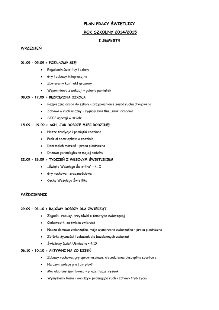 PLAN PRACY ŚWIETLICY ROK SZKOLNY 2014/2015 I SEMESTR WRZESIEŃ 01.09 – 05.09 > POZNAJMY SIĘ! Regulamin świetlicy i szkoły Gry i zabawy integracyjne Zawieramy kontrakt grupowy Wspomnienia z wakacji – galeria pamiątek 08.09 – 12.09 > BEZPIECZNA SZKOŁA Bezpieczna droga do szkoły – przypomnienie zasad ruchu drogowego Zabawa w ruch uliczny – sygnały świetlne, znaki drogowe STOP agresji w szkole 15.09 - 19.09 > ACH, JAK DOBRZE MIEĆ RODZINĘ! Nasze tradycje i pamiątki rodzinne Podział obowiązków w rodzinie Dom moich marzeń – praca plastyczna Drzewo genealogiczne mojej rodziny 22.09 – 26.09 > TYDZIEŃ Z WESOŁYM ŚWIETLIKIEM „Święto Wesołego Świetlika” - kl. I Gry ruchowe i zręcznościowe Cechy Wesołego Świetlika PAŹDZIERNIK 29.09 – 03.10 > BĄDŹMY DOBRZY DLA ZWIERZĄT Zagadki, rebusy, krzyżówki o tematyce zwierzęcej Ciekawostki ze świata zwierząt Nasze domowe zwierzątko, moje wymarzone zwierzątko – praca plastyczna Zbiórka żywności i zabawek dla bezdomnych zwierząt Światowy Dzień Uśmiechu – 4.10 06.10 – 10.10 > AKTYWNI NA CO DZIEŃ Zabawy ruchowe, gry sprawnościowe, niecodzienne dyscypliny sportowe Na czym polega gra fair play? Mój ulubiony sportowiec – prezentacje, rysunki Wymyślamy hasła i wierszyki promujące ruch i zdrowy tryb życia 13.10 – 17.10 > PAPIEROWY ZAWRÓT GŁOWY Origami – sztuka składania papieru Jesienne dekorowanie świetlicy Tworzymy ozdoby z papieru Sztuka zdobienia papieru Światowy Dzień Mycia Rąk – 15.10 – pogadanka 20.10 – 24.10 > ALE KINO! Mój ulubiony film dla dzieci Reżyser, scenarzysta, dźwiękowiec i inne zawody związane z powstawaniem filmów Tworzymy animację Światowy Dzień Origami – 24.10 27.10 – 31.10 > ŚWIAT ZE STARYCH FOTOGRAFII Fotografia - sposób na zatrzymanie chwili Wspominamy tych, którzy odeszli Odwiedziny na cmentarzu W jesiennych barwach – praca plastyczna LISTOPAD 03.11 - 07.11 > WIERSZE, RYMY, ZABAWY SŁOWAMI Dzień Postaci z Bajek – 5.11 Nasze ulubione wiersze dla dzieci Zabawa w rymy Tworzymy świetlicową bajkę 10.11 – 14.11 > NASZA SZKOŁA, NASZA KLASA Mój nauczyciel, wychowawca – plakat Historia naszej szkoły Opowiadamy o swojej klasie Kształtowanie nawyków grzecznościowych, szacunku dla wychowawców, pracowników szkoły Laurka dla nauczyciela 11 Listopada – święto narodowe 17.11 - 21.11 > TYDZIEŃ ŻYCZLIWOŚCI Dzień dobry, Do widzenia, proszę, dziękuję, przepraszam – savoir vivre na co dzień Wybór najsympatyczniejszego kolegi, koleżanki w świetlicy Ogólnoświatowy Dzień Rzucania Palenia Tytoniu – 21.11. Dbam o siebie i innych – NIE PALĘ! – akcja prozdrowotna Warto być dobrym! Światowy Dzień Życzliwości i Pozdrowień – 21.11. 24.11 – 28.11 > CZAS WOLNY NIE MUSI BYĆ CZASEM NUDY Moje hobby – pokazy i prezentacje Konkurs piosenki Wróżby i zwyczaje związane z Andrzejkami GRUDZIEŃ 01.12 – 05.12 > ZOSTAŃ POMOCNIKIEM MIKOŁAJA Od Świętego Mikołaja z Miry do Świętego Mikołaja z Rovaniemi Wolontariat – co to takiego? Wykonujemy prezenty dla najbliższych 08.12 – 12.12 > DZWONIĄ DZWONKI SAŃ Anioły z bibuły Nauka piosenek świątecznych Wykonujemy choinkowe ozdoby Świąteczna dekoracja świetlicy 15.12 – 19.12 > HEJ, DO BETLEJEM! Wspólne śpiewanie kolęd i pastorałek „W BLASKU GWIAZDY BETLEJEMSKIEJ” – międzyszkolny konkurs plastyczny Potrawy na wigilijnym stole – 20.12 Dzień Ryby STYCZEŃ 02.01 – 03.01 > IDZIE NOWY ROK Przysłowia i wiersze związane z miesiącami i porami roku Nasze noworoczne postanowienia i plany Skąd pochodzą nazwy pór roku, miesięcy, dni tygodnia – burza mózgów, zabawa z skojarzenia 05.01 – 09.01 > ZDROWY ROK – DOBRY ROK! Rola warzyw i owoców w codziennym jadłospisie Co to jest piramida żywienia? Talerz zdrowia – przygotowujemy zdrowe przekąski do szkoły Krzyżówki, rebusy, zagadki o tematyce zdrowotnej; układamy hasła promujące zdrowie 12.01 – 16.01 > ŚNIEŻNA ZABAWA Światowy Dzień Śniegu – 20.01 – zabawy na świeżym powietrzu Płatki śniegu – praca techniczna Zima w literaturze i sztuce – prezentacja multimedialna Pokaz mody zimowej 19.01 – 23.01 > RODZICE NASZYCH RODZICÓW Dzień Babci i Dziadka 21 i 22.01 Jak okazać szacunek i miłość? - prezenty i laurki dla babci i dziadka Gdy nasi dziadkowie byli młodzi... 26.01 – 30.01 > BEZPIECZNY ZIMOWY WYPOCZYNEK Atrakcje Bielska-Białej Ruch to zdrowie Bezpieczeństwo podczas zimowego wypoczynku - spotkanie z ratownikiem Grupy Beskidzkiej GOPR LUTY 16.02 – 20.02 > TYDZIEŃ MULTIMEDIALNY Bezpieczny Internet Higiena korzystania z komputera Dobre wychowanie w sieci Programy i gry edukacyjne 23.02 – 27.02 > W KRAINIE WYOBRAŹNI Muzyczne inspiracje Jak wygląda Kraina Wyobraźni? - praca plastyczna, plakat Czy każdy może być artystą? Wizyta w galerii sztuki PLAN PRACY ŚWIETLICY ROK SZKOLNY 2014/2015 II SEMESTR MARZEC O2.03 – 06.03 > ROZTAŃCZONY TYDZIEŃ Dlaczego ludzie tańczą? Rodzaje i funkcje tańca - prezentacja Zabawy ruchowe przy muzyce Nauka podstawowych kroków tanecznych Taniec robotów, drzew, kotów... - zabawy inspirowane tańcem 09.03 – 13.03 > RAZEM RAŹNIEJ Mój przyjaciel Cechy prawdziwego przyjaciela Piosenki, opowiadania i przysłowia o przyjaźni 16.03 – 20.03 > WIOSENNE PRZEBUDZENIE Szukamy oznak wiosny w przyrodzie Wiersze i piosenki na temat wiosny Dekorowanie świetlicy Wiosenne inspiracje 23.03 – 27.03 > TEATR WSPANIAŁY 27.03 – Międzynarodowy Dzień Teatru Kulisy, scena, garderoba, czyli co jest czym w teatrze Krótka historia teatru Scenki dramowe i pantomimiczne KWIECIEŃ 30.03 – 03.04 > WIELKANOC W DOMU I NA PODWÓRKU Wielkanocne tradycje dawniej i dziś Pisanki i ozdoby świąteczne Świąteczne dekorowanie świetlicy 06.04 – 10.04 > MIASTECZKO UŚMIECHU Rozmawiamy o naszych emocjach Konkurs opowiadania dowcipów Budujemy Miasteczko Uśmiechu 12.04 – Dzień Czekolady 13.04 – 17.04 > PRZYJAŹŃ Z PRZYRODĄ 2