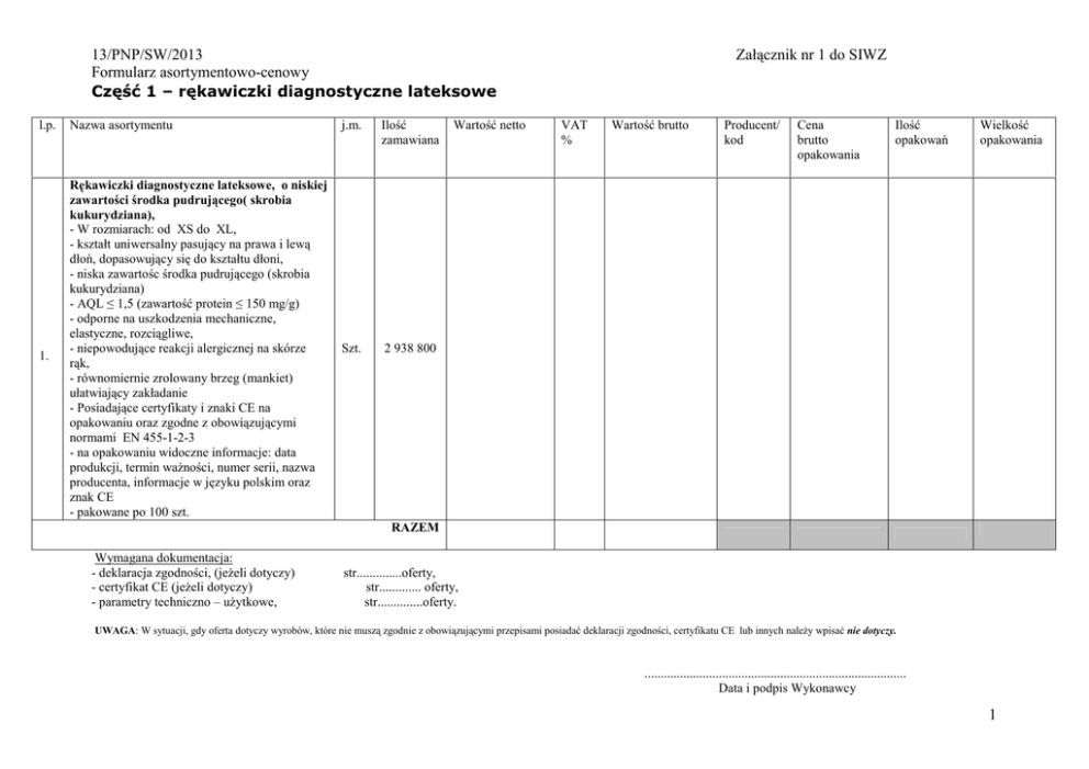 13/PNP/SW/2013 Formularz asortymentowo-cenowy Część 1 – rękawiczki diagnostyczne lateksowe l.p. 1. Nazwa asortymentu j.m. Ilość zamawiana Rękawiczki diagnostyczne lateksowe, o niskiej zawartości środka pudrującego( skrobia kukurydziana), - W rozmiarach: od XS do XL, - kształt uniwersalny pasujący na prawa i lewą dłoń, dopasowujący się do kształtu dłoni, - niska zawartośc środka pudrującego (skrobia kukurydziana) - AQL ≤ 1,5 (zawartość protein ≤ 150 mg/g) - odporne na uszkodzenia mechaniczne, elastyczne, rozciągliwe, - niepowodujące reakcji alergicznej na skórze rąk, - równomiernie zrolowany brzeg (mankiet) ułatwiający zakładanie - Posiadające certyfikaty i znaki CE na opakowaniu oraz zgodne z obowiązującymi normami EN 455-1-2-3 - na opakowaniu widoczne informacje: data produkcji, termin waŜności, numer serii, nazwa producenta, informacje w języku polskim oraz znak CE - pakowane po 100 szt. Szt. 2 938 800 Wartość netto Załącznik nr 1 do SIWZ VAT % Wartość brutto Producent/ kod Cena brutto opakowania Ilość opakowań Wielkość opakowania RAZEM Wymagana dokumentacja: - deklaracja zgodności, (jeŜeli dotyczy) - certyfikat CE (jeŜeli dotyczy) - parametry techniczno – uŜytkowe, str..............oferty, str............. oferty, str..............oferty. UWAGA: W sytuacji, gdy oferta dotyczy wyrobów, które nie muszą zgodnie z obowiązującymi przepisami posiadać deklaracji zgodności, certyfikatu CE lub innych naleŜy wpisać nie dotyczy. ................................................................................. Data i podpis Wykonawcy 1 13/PNP/SW/2013 Formularz asortymentowo-cenowy Załącznik nr 1 do SIWZ Część 2 – rękawiczki diagnostyczne nitrylowe l.p. Nazwa asortymentu j.m. Ilość zamawiana 1 Rękawice diagnostyczne, bezpudrowe, nitrylowe - W rozmiarach: od S do XL, - kształt uniwersalny pasujący na prawa i lewą dłoń, dopasowujący się do kształtu dłoni, - AQL ≤ 1,5 (zawartość protein ≤ 150 mg/g) - odporne na uszkodzenia mechaniczne, elastyczne, rozciągliwe, - niepowodujące reakcji alergicznej na skórze rąk, - równomiernie zrolowany brzeg (mankiet) ułatwiający zakładanie - Posiadające certyfikaty i znaki CE na opakowaniu oraz zgodne z obowiązującymi normami EN 455-1-2-3 - na opakowaniu widoczne informacje: data produkcji, termin waŜności, numer serii, nazwa producenta, informacje w języku polskim oraz znak CE - pakowane po 100 szt. Szt. 50 400 Wartość netto VAT % Wartość brutto Producent/ kod Cena brutto opakowania Ilość opakowań Wielkość opakowania RAZEM Wymagana dokumentacja: - deklaracja zgodności, (jeŜeli dotyczy) - certyfikat CE (jeŜeli dotyczy) - parametry techniczno – uŜytkowe, str..............oferty, str............. oferty, str..............oferty. UWAGA: W sytuacji, gdy oferta dotyczy wyrobów, które nie muszą zgodnie z obowiązującymi przepisami posiadać deklaracji zgodności, certyfikatu CE lub innych naleŜy wpisać nie dotyczy. ................................................................................. Data i podpis Wykonawcy 2 13/PNP/SW/2013 Formularz asortymentowo-cenowy Załącznik nr 1 do SIWZ 3