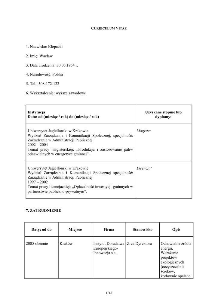 CURRICULUM VITAE 1. Nazwisko: Klepacki 2. Imię: Wacław 3. Data urodzenia: 30.05.1954 r. 4. Narodowość: Polska 5. Tel.: 508-172-122 6. Wykształcenie: wyższe zawodowe Instytucja Data: od (miesiąc / rok) do (miesiąc / rok) Uzyskane stopnie lub dyplomy: Uniwersytet Jagielloński w Krakowie Magister Wydział Zarządzania i Komunikacji Społecznej, specjalność: Zarządzanie w Administracji Publicznej 2002 – 2004 Temat pracy magisterskiej: „Produkcja i zastosowanie paliw odnawialnych w energetyce gminnej”. Uniwersytet Jagielloński w Krakowie Licencjat Wydział Zarządzania i Komunikacji Społecznej specjalność: Zarządzanie w Administracji Publicznej 1997 – 2002 Temat pracy licencjackiej: „Opłacalność inwestycji gminnych w partnerstwie publiczno-prywatnym”. 7. ZATRUDNIENIE Daty: od do 2005-obecnie Miejsce Kraków Firma Stanowisko Instytut Doradztwa Z-ca Dyrektora EuropejskiegoInnowacja s.c. 1/18 Opis Odnawialne źródła energii, Wdrażanie projektów ekologicznych (oczyszczalnie ścieków, kotłownie opalane ekologicznie), Plany Rozwoju Lokalnego Wieloletnie Plany Inwestycyjne, pozyskiwanie funduszy zewnętrznych 2003-obecnie Kraków Eko-Pol Sp. z o.o. Prezes Zarządu 2002-2003 Kraków Eko - Pol s.c. Właściciel firmy 2000-2002 Chrzanów Agencja Rozwoju Ziemi Chrzanowskiej 1978-2000 Kraków Huta im. T. Sendzimira w Krakowie Elektrykautomatyk 1974-1978 Kraków Branżowy Ośrodek Informatyki w Zakładach Tytoniowych Operator maszyny cyfrowej Odnawialne źródła energii, Wdrażanie projektów ekologicznych (oczyszczalnie ścieków, kotłownie opalane ekologicznie) Przygotowanie do aplikacji funduszy europejskich Utrzymanie ruchu 8. DOŚWIADCZENIE Z ZAKRESU PROWADZENIA SZKOLEŃ: 20.06.2012- 22.06.2012organizacja i prowadzanie wraz z firmą HERZ szkolenia wyjazdowego w Austrii, dotyczącego projektowania i budowy kotłowni biomasowych oraz zagadnienia produkcji i logistyki paliw biomasowych- II edycja 22.02.2012- 24.02.2012organizacja i prowadzanie wraz z firmą HERZ szkolenia wyjazdowego w Austrii, dotyczącego projektowania i budowy kotłowni biomasowych oraz zagadnienia produkcji i logistyki paliw biomasowych 2007 r. - cykl szkoleń na zlecenie LGD - Fundacji Rozwoju Obszarów Wiejskich w dorzeczu rzek: Szkła, Lubaczówki i Środkowego Sanu 2/18 o Szkolenie dotyczące prowadzenia gospodarstw agroturystycznych przeprowadzone w Gminie Laszki i Gminie Wielkie Oczy o Szkolenie dotyczące pozyskiwania Funduszy Europejskich przeprowadzone w Gminie Laszki i Gminie Wielkie Oczy o Szkolenie dotyczące tematu uprawy roślin energetycznych i energii odnawialnej przeprowadzone w Gminie Laszki i Gminie Wielkie Oczy 2007 r. - cykl szkoleń dla LGD - Stowarzyszenia „Nadwiślańska Grupa Działania E.O.CENOMA” o Szkolenie pn.: „Przegląd Funduszy Unii Europejskiej na lata 2007 – 2013” o Szkolenie pn.: „Budowanie projektu” o Szkolenie pn.: „Marketing miejsca” 2006 r.- usługi szkoleniowe i szkoleniowo- doradcze w ramach organizowanego przez Urząd Marszałkowski Województwa Lubelskiego w Lublinie cyklu szkoleń na temat: „Opracowanie studium wykonalności dla projektów przewidzianych do współfinansowania z funduszy strukturalnych w ramach Regionalnego Programu Operacyjnego na lata 2007-2013”- zlecenia 40 dni (320 godziny lekcyjne) szkoleniowych. 2006 r.- Opracowywanie Planu Rozwoju Lokalnego Gminy Laszki na lata 2006 – 2013 zgodnie z wytycznymi Zintegrowanego Programu Rozwoju Lokalnego, dla Gminy Laszki oraz przeprowadzenie czterech szkoleń dla 36 osób. 2006 r. - Opracowanie Wieloletniego Planu Inwestycyjnego dla Gminy Laszki i przeprowadzenie dwóch szkoleń dla 27 osób. 2006 r.- Opracowanie Wieloletniego Planu Inwestycyjnego dla Gminy Bukowina i przeprowadzenie szkolenia dla 5 osób. 2006 r.- Opracowanie Wieloletniego Planu Inwestycyjnego dla Gminy Iwanowice i przeprowadzenie dwóch szkoleń dla 33 osób. 2006 r.- Opracowanie Wieloletniego Planu Inwestycyjnego dla Powiatu Wałeckiego i przeprowadzenie dwóch szkoleń dla 22 osób. 2006 r.- Opracowanie Wieloletniego Planu Inwestycyjnego dla Miasta i Gminy Wieliczka i przeprowadzenie trzech szkoleń dla 62 osób. 2006 r.- Opracowanie Wieloletniego Planu Inwestycyjnego dla Gminy Sanok i przeprowadzenie trzech szkoleń dla 62 osób. 2006 r.- Opracowanie wniosku i oraz ZSROW w tym pięciu szkoleń, w których uczestniczyło 111 uczestników dla inwestycji „Leader + siłą napędową terenów przygranicznych Gmin Laszki i Wielkie Oczy” dla SPO Program Pilotażowy Leader+”. 2006 r.- Przeprowadzenie konferencji o tematyce „Odnawialne źródła energii jako szansa rozwoju obszarów wiejskich” w ramach Sektorowego Programu Operacyjnego „Restrukturyzacja i modernizacja sektora żywnościowego oraz rozwój obszarów wiejskich 2004-2006” działanie 2.7. „Pilotażowy Program Leader+”dla miejscowości Miechów, Gołcza, Kozłów, Słaboszów, Książ Wielki, Racławice, Charsznica 3/18 Czerwiec 2005, Kraków, Fundacja Swingtherm Im. Dr Nauk Technicznych Jerzego Wojciechowskiego- III Ogólnopolskie Seminarium Edukacyjne- przeprowadzenie konferencji o tematyce „Możliwości uzyskania środków finansowych na przedsięwzięcia z zakresu ochrony środowiska realizowane przez jednostki samorządu terytorialnego, firmy i organizacje pozarządowe oraz „Ekopaliwa (paliwa biomasowe) i instalacje grzewcze firmy HDG Bavaria wykorzystujące ekopaliwa. Kwiecień 2005, Karniowice, Małopolski Ośrodek Doradztwa Rolniczego w Karniowicach, IV Małopolska konferencja „Odnawialne źródła energii”. Prezentacja na temat „produkcji paliwa i biomasy” oraz „Możliwości uzyskania środków finansowych na przedsięwzięcia z zakresu produkcji paliwa biomasowego”. Październik 2005, Toruń, VII Krajowa Konferencja Dyrektorów Szkół- prezentacja na temat” wieloletniego planu inwestycyjnego”, „Mechanizmu finansowego Europejskiego Obszaru Gospodarczego-Norweski Mechanizm Finansowy”, Termomoderniz