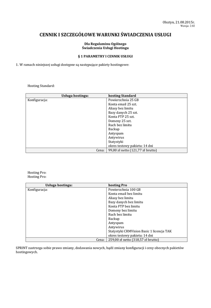 Olsztyn, 21.08.2015r. Wersja: 2.02 CENNIK I SZCZEGÓŁOWE WARUNKI ŚWIADCZENIA USŁUGI Dla Regulaminu Ogólnego Świadczenia Usługi Hostingu § 1 PARAMETRY I CENNIK USŁUGI 1. W ramach niniejszej usługi dostępne są następujące pakiety hostingowe: Hosting Standard: Konfiguracja: Usługa hostingu: Cena: hosting Standard Powierzchnia 25 GB Konta email 25 szt. Aliasy bez limitu Bazy danych 25 szt. Konta FTP 25 szt. Domeny 25 szt. Ruch bez limitu Backup Antyspam Antywirus Statystyki okres testowy pakietu: 14 dni 99,00 zł netto (121,77 zł brutto) Cena: hosting Pro Powierzchnia 100 GB Konta email bez limitu Aliasy bez limitu Bazy danych bez limitu Konta FTP bez limitu Domeny bez limitu Ruch bez limitu Backup Antyspam Antywirus Statystyki CRMVision Basic 1 licencja TAK okres testowy pakietu: 14 dni 259,00 zł netto (318,57 zł brutto) Hosting Pro: Hosting Pro: Usługa hostingu: Konfiguracja: SPRINT zastrzega sobie prawo zmiany, dodawania nowych, bądź zmiany konfiguracji i ceny obecnych pakietów hostingowych. 1. 2. 3. 4. 5. § 2 PŁATNOŚCI Z tytułu uruchomienia i świadczenia Usługi Usługobiorca ponosić będzie opłaty naliczone zgodnie z cennikiem. Podane opłaty są kwotami netto i zostaną powiększone o obowiązującą stawkę podatku VAT. Wynagrodzenie za korzystanie z Usługi od Usługobiorcy na rzecz Sprint staje się wymagalne w terminie 14 dni od daty wystawienia faktury proforma. Usługobiorca płaci wynagrodzenie za pośrednictwem systemu płatności internetowych wskazanego przez Sprint lub przelewem na rachunek bankowy SPRINT wskazany na fakturze proforma. Za dzień dokonania płatności uważa się dzień wpływu środków pieniężnych na rachunek bankowy SPRINT. Opłata abonamentowa będzie naliczana od dnia Odbioru Usługi.