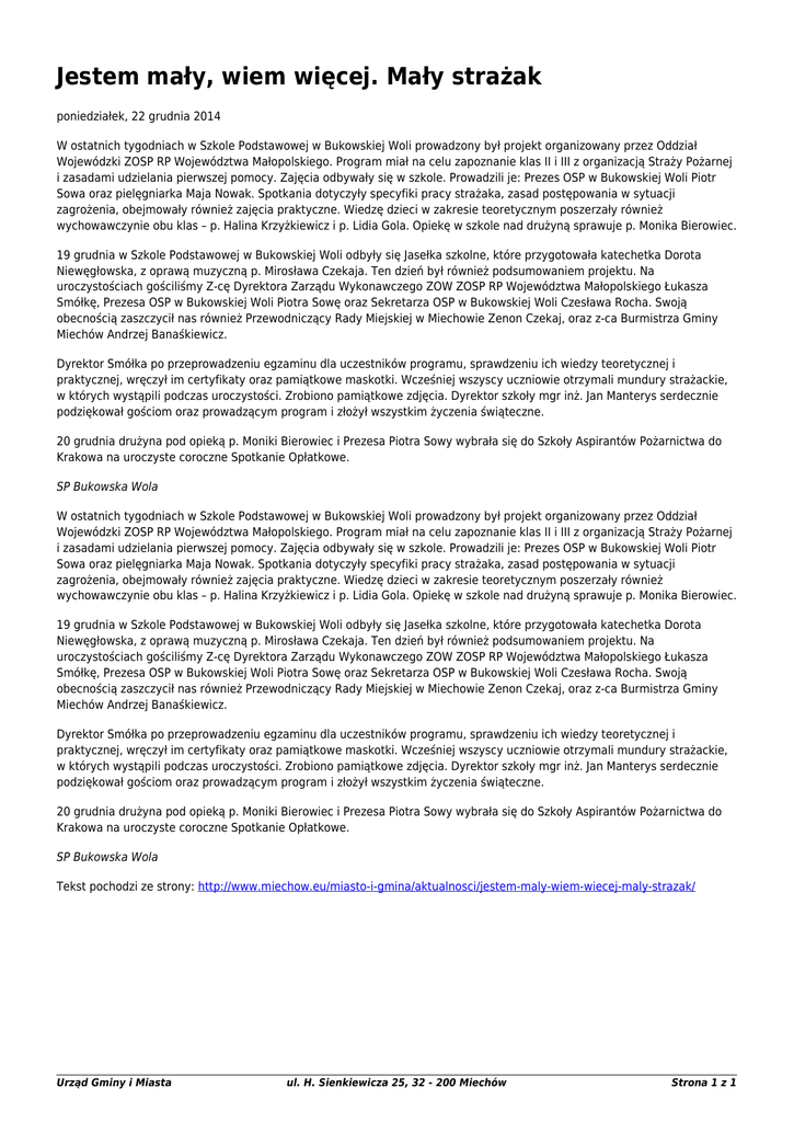 Jestem mały, wiem więcej. Mały strażak poniedziałek, 22 grudnia 2014 W ostatnich tygodniach w Szkole Podstawowej w Bukowskiej Woli prowadzony był projekt organizowany przez Oddział Wojewódzki ZOSP RP Województwa Małopolskiego. Program miał na celu zapoznanie klas II i III z organizacją Straży Pożarnej i zasadami udzielania pierwszej pomocy. Zajęcia odbywały się w szkole. Prowadzili je: Prezes OSP w Bukowskiej Woli Piotr Sowa oraz pielęgniarka Maja Nowak. Spotkania dotyczyły specyfiki pracy strażaka, zasad postępowania w sytuacji zagrożenia, obejmowały również zajęcia praktyczne. Wiedzę dzieci w zakresie teoretycznym poszerzały również wychowawczynie obu klas – p. Halina Krzyżkiewicz i p. Lidia Gola. Opiekę w szkole nad drużyną sprawuje p. Monika Bierowiec. 19 grudnia w Szkole Podstawowej w Bukowskiej Woli odbyły się Jasełka szkolne, które przygotowała katechetka Dorota Niewęgłowska, z oprawą muzyczną p. Mirosława Czekaja. Ten dzień był również podsumowaniem projektu. Na uroczystościach gościliśmy Z-cę Dyrektora Zarządu Wykonawczego ZOW ZOSP RP Województwa Małopolskiego Łukasza Smółkę, Prezesa OSP w Bukowskiej Woli Piotra Sowę oraz Sekretarza OSP w Bukowskiej Woli Czesława Rocha. Swoją obecnością zaszczycił nas również Przewodniczący Rady Miejskiej w Miechowie Zenon Czekaj, oraz z-ca Burmistrza Gminy Miechów Andrzej Banaśkiewicz. Dyrektor Smółka po przeprowadzeniu egzaminu dla uczestników programu, sprawdzeniu ich wiedzy teoretycznej i praktycznej, wręczył im certyfikaty oraz pamiątkowe maskotki. Wcześniej wszyscy uczniowie otrzymali mundury strażackie, w których wystąpili podczas uroczystości. Zrobiono pamiątkowe zdjęcia. Dyrektor szkoły mgr inż. Jan Manterys serdecznie podziękował gościom oraz prowadzącym program i złożył wszystkim życzenia świąteczne. 20 grudnia drużyna pod opieką p. Moniki Bierowiec i Prezesa Piotra Sowy wybrała się do Szkoły Aspirantów Pożarnictwa do Krakowa na uroczyste coroczne Spotkanie Opłatkowe. SP Bukowska Wola W ostatnich tygodniach w Szkole Podstawowej w Bukowskiej Woli prowadzony był projekt organizowany przez Oddział Wojewódzki ZOSP RP Województwa Małopolskiego. Program miał na celu zapoznanie klas II i III z organizacją Straży Pożarnej i zasadami udzielania pierwszej pomocy. Zajęcia odbywały się w szkole. Prowadzili je: Prezes OSP w Bukowskiej Woli Piotr Sowa oraz pielęgniarka Maja Nowak. Spotkania dotyczyły specyfiki pracy strażaka, zasad postępowania w sytuacji zagrożenia, obejmowały również zajęcia praktyczne. Wiedzę dzieci w zakresie teoretycznym poszerzały również wychowawczynie obu klas – p. Halina Krzyżkiewicz i p. Lidia Gola. Opiekę w szkole nad drużyną sprawuje p. Monika Bierowiec. 19 grudnia w Szkole Podstawowej w Bukowskiej Woli odbyły się Jasełka szkolne, które przygotowała katechetka Dorota Niewęgłowska, z oprawą muzyczną p. Mirosława Czekaja. Ten dzień był również podsumowaniem projektu. Na uroczystościach gościliśmy Z-cę Dyrektora Zarządu Wykonawczego ZOW ZOSP RP Województwa Małopolskiego Łukasza Smółkę, Prezesa OSP w Bukowskiej Woli Piotra Sowę oraz Sekretarza OSP w Bukowskiej Woli Czesława Rocha. Swoją obecnością zaszczycił nas również Przewodniczący Rady Miejskiej w Miechowie Zenon Czekaj, oraz z-ca Burmistrza Gminy Miechów Andrzej Banaśkiewicz. Dyrektor Smółka po przeprowadzeniu egzaminu dla uczestników programu, sprawdzeniu ich wiedzy teoretycznej i praktycznej, wręczył im certyfikaty oraz pamiątkowe maskotki. Wcześniej wszyscy uczniowie otrzymali mundury strażackie, w których wystąpili podczas uroczystości. Zrobiono pamiątkowe zdjęcia. Dyrektor szkoły mgr inż. Jan Manterys serdecznie podziękował gościom oraz prowadzącym program i złożył wszystkim życzenia świąteczne. 20 grudnia drużyna pod opieką p. Moniki Bierowiec i Prezesa Piotra Sowy wybrała się do Szkoły Aspirantów Pożarnictwa do Krakowa na uroczyste coroczne Spotkanie Opłatkowe. SP Bukowska Wola Tekst pochodzi ze strony: http://www.miechow.eu/miasto-i-gmina/aktualnosci/jestem-maly-wiem-wiecej-maly-strazak/ Urząd Gminy i Miasta ul. H. Sienkiewicza 25, 32 - 200 Miechów Strona 1 z 1
