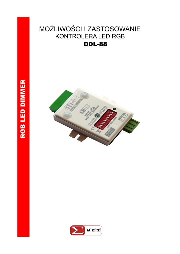 MOŻLIWOŚCI I ZASTOSOWANIE RGB LED DIMMER KONTROLERA LED RGB DDL-88 Wprowadzenie Technika LED wyznacza nowe standardy aranżacji wnętrz. Miniaturyzacja źródeł światła daje projektantom ogromne możliwości eksponowania elementów wystroju. Dziś już nie tylko zmiana intensywności świtała białego wprowadza odpowiedni nastrój, lecz kolor emitowany przez diody RGB. Podświetlenie sufitu lub ściany jednym z 16 milionów kolorów lub ich płynna zmiana, tworzy efektowne iluminacje. Sterowanie diodami LED to nowe wyzwanie dla producentów elementów sterujących, zwłaszcza gdy zachodzi potrzeba podświetlenia dużej liczby detali w technologii LED RGB. Wówczas, jednoczesna płynna zmiana koloru stanowi problem nawet dla systemów EIB/KNX. W takiej sytuacji najbardziej ekonomicznym i funkcjonalnym rozwiązaniem wydaje się sterowanie przez standard DMX-512, który od wielu lat wykorzystywany jest w profesjonalnym oświetleniu estradowym. Poprzez magistralę DMX można niezależnie sterować każdym elementem podłączonym do systemu. Duży wybór konsolet pracujących w standardzie DMX-512, pozwala na dobranie odpowiedniego modelu do konkretnej instalacji oświetleniowej. Przykładem takiego rozwiązania może być lokal, w którym całe światło oparte jest o technologię LED RGB. Użytkownik jednym przyciśnięciem konsolety może zmienić nastrój w całym obiekcie. Podświetlane pojemniki na lód umieszczone w każdym stoliku, mogą zmieniać kolor w zależności od zamówionego alkoholu. Prezentowany sterownik DDL-88 jest cyfrowym urządzeniem wykonawczym do sterowania diodami LED RGB. Regulując intensywnością odrębną dla każdego koloru - Red, Green, Blue, można uzyskać efekt miksowania barw. Urządzenie to znajduje zastosowanie zarówno w prostych, jak i rozbudowanych instalacjach oświetleniowych - w restauracjach, hotelach, teatrach, klubach, studiach telewizyjnych, reklamie i wszędzie tam, gdzie poprzez światło chcemy podkreślić klimat wnętrza. Można go również stosować, jako regulator natężenia białego oświetlenia LED np.: w domowych instalacjach. Jest bardzo prosty w obsłudze i w instalacji, a wbudowane zabezpieczenia chronią go przed uszkodzeniami. C echy urządzenia Funkcjonalność stosowania Sterownik został wyposażony w szereg interfejsów wejściowych, aby można było je stosować zarówno w małych, jak i dużych instalacjach. W oświetleniu reklamowym, gdzie światło nie wymaga częstych zmian, można ustawić kolor lub jeden z wbudowanych programów za pomocą mikroprzełączników. Kilka z nich zostało również przypisanych do regulacji intensywności i prędkości programów. W prostych instalacjach wykorzystywane jest sterowanie z zewnętrznych przycisków (np.: typu dzwonkowego). Jeden z nich odpowiada za włączanie i wyłączanie oraz regulację intensywności światła, a drugi - za wybór kolorów lub wbudowanych sekwencji świetlnych. Bardziej wymagający użytkownik może sterować urządzeniem z pilota na podczerwień. Ma on wówczas możliwość pełnego wykorzystania sterownika. Przy większych instalacjach stosuje się sterowanie za pomocą profesjonalnego systemu sterowania światłem DMX-512. W systemie tym, wszystkie urządzenia łączy się cyfrową magistralą, której długość może wynosić do 1000 metrów lub więcej w przypadku zastosowania wzmacniaczy sygnału. Za pomocą konsolety sterującej, istnieje możliwość regulacji każdego parametru wybranego sterownika lub całych grup urządzeń. Ma to ogromne znaczenie, gdy chcemy zbudować scenerię świetlną idealnie dopasowaną do własnych potrzeb. Sterownik DDL-88 daje się łatwo integrować z innymi systemami sterowania (np.: EIB/KNX). Poprzez wejścia binarne można kontrolować załączanie lub zmianę intensywności światła oraz wybór koloru. Integracji można również dokonać sterując urządzeniem za pomocą podczerwieni. Wszystkie opisane powyżej możliwości, pozwalają na wykorzystanie sterownika w różnych trybach pracy. W przypadku zmiany koncepcji sterowania, nie jest potrzebna wymiana urządzeń, a jedynie zmiana konfiguracji. Obciążalność sterownika – nieograniczona moc Obciążalność każdego kanału sterownika wynosi 3A. Oznacza to, że do jednego sterownika można podłączyć diody LED o łącznej mocy 108 W (dotyczy zasilania sterownika z 12V). W sytuacji, gdy zachodzi potrzeba identycznego sterowania diodami LED, których moc przewyższa parametry dopuszczalne, można sterowniki łączyć w grupy. Wówczas do pierwszego sterownika należy podłączyć odbiornik podczerwieni lub przyciski i przestawić go w tryb nadajnika DMX (tryb master). Kolejne sterowniki – odbiorniki połączone linią DMX z pierwszym sterownikiem działają identycznie jak nadajnik. Do jednego nadajnika – mastera można podłączyć maksymalnie 32 odbiorniki, co daje możliwość sterowania LED o łącznej mocy 3456 W. Przy 31 odbiorniku można zastosować wzmacniacz sygnału DMX i rozbudować instalację o kolejne 32 odbiorniki. Idealne ściemnianie i rozjaśnianie Ściemnianie i rozjaśnianie to niezbędna funkcja przy tworzeniu barw. Pozwala ona na efektywne gospodarowanie energią. W sterowniku DDL-88 zastosowano algorytm kwadratowego prawa ściemniania tak, aby zmiana natężenia światła od 0% do 100%, była widziana przez ludzkie oko w sposób liniowy. Przy niskim natężeniu, źrenica oka rozszerza się, dzięki czemu odbierana ilość światła jest większa, niż rzeczywisty poziom oświetlenia. Przykładowo, poziom oświetlenia wynoszący 1% widziany jest przez ludzkie oko na poziomie 10%. Rozszerzona rozdzielczość modulacji PWM do 12 bitów pozwoliła na bardzo płynne zmiany intensywności światła. Dzięki dostępnym 4096 poziomom jasności, można uzyskać odcienie kolorystyczne, niespotykane przy sterowaniu z rozdzielczością 8 bitów, gdzie istnieje tylko 256 poziomów intensywności. Częstotliwość przebiegu PWM w