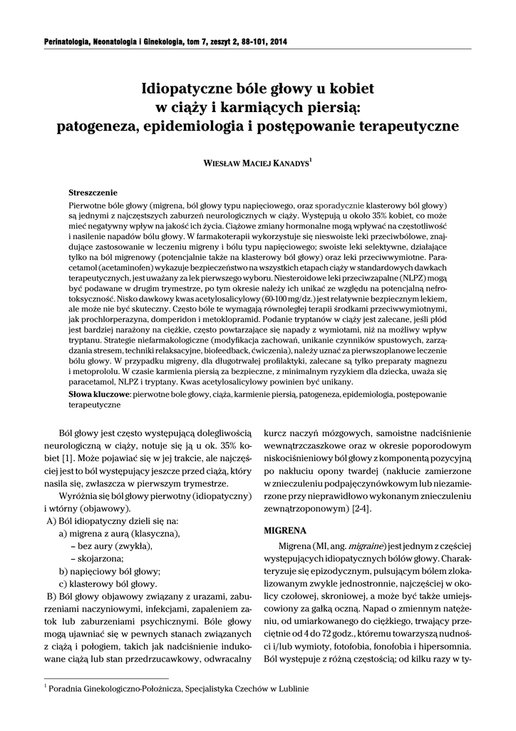 Perinatologia, Neonatologia i Ginekologia, tom 7, zeszyt 2, 88-101, 2014 Idiopatyczne bóle głowy u kobiet w ciąży i karmiących piersią: patogeneza, epidemiologia i postępowanie terapeutyczne WIESŁAW MACIEJ KANADYS1 Streszczenie Pierwotne bóle głowy (migrena, ból głowy typu napięciowego, oraz sporadycznie klasterowy ból głowy) są jednymi z najczęstszych zaburzeń neurologicznych w ciąży. Występują u około 35% kobiet, co może mieć negatywny wpływ na jakość ich życia. Ciążowe zmiany hormonalne mogą wpływać na częstotliwość i nasilenie napadów bólu głowy. W farmakoterapii wykorzystuje się nieswoiste leki przeciwbólowe, znajdujące zastosowanie w leczeniu migreny i bólu typu napięciowego; swoiste leki selektywne, działające tylko na ból migrenowy (potencjalnie także na klasterowy ból głowy) oraz leki przeciwwymiotne. Paracetamol (acetaminofen) wykazuje bezpieczeństwo na wszystkich etapach ciąży w standardowych dawkach terapeutycznych, jest uważany za lek pierwszego wyboru. Niesteroidowe leki przeciwzapalne (NLPZ) mogą być podawane w drugim trymestrze, po tym okresie należy ich unikać ze względu na potencjalną nefrotoksyczność. Nisko dawkowy kwas acetylosalicylowy (60-100 mg/dz.) jest relatywnie bezpiecznym lekiem, ale może nie być skuteczny. Często bóle te wymagają równoległej terapii środkami przeciwwymiotnymi, jak prochlorperazyna, domperidon i metoklopramid. Podanie tryptanów w ciąży jest zalecane, jeśli płód jest bardziej narażony na ciężkie, często powtarzające się napady z wymiotami, niż na możliwy wpływ tryptanu. Strategie niefarmakologiczne (modyfikacja zachowań, unikanie czynników spustowych, zarządzania stresem, techniki relaksacyjne, biofeedback, ćwiczenia), należy uznać za pierwszoplanowe leczenie bólu głowy. W przypadku migreny, dla długotrwałej profilaktyki, zalecane są tylko preparaty magnezu i metoprololu. W czasie karmienia piersią za bezpieczne, z minimalnym ryzykiem dla dziecka, uważa się paracetamol, NLPZ i tryptany. Kwas acetylosalicylowy powinien być unikany. Słowa kluczowe: pierwotne bole głowy, ciąża, karmienie piersią, patogeneza, epidemiologia, postępowanie terapeutyczne Ból głowy jest często występującą dolegliwością neurologiczną w ciąży, notuje się ją u ok. 35% kobiet [1]. Może pojawiać się w jej trakcie, ale najczęściej jest to ból występujący jeszcze przed ciążą, który nasila się, zwłaszcza w pierwszym trymestrze. Wyróżnia się ból głowy pierwotny (idiopatyczny) i wtórny (objawowy). A) Ból idiopatyczny dzieli się na: a) migrena z aurą (klasyczna), – bez aury (zwykła), – skojarzona; b) napięciowy ból głowy; c) klasterowy ból głowy. B) Ból głowy objawowy związany z urazami, zaburzeniami naczyniowymi, infekcjami, zapaleniem zatok lub zaburzeniami psychicznymi. Bóle głowy mogą ujawniać się w pewnych stanach związanych z ciążą i połogiem, takich jak nadciśnienie indukowane ciążą lub stan przedrzucawkowy, odwracalny 1 kurcz naczyń mózgowych, samoistne nadciśnienie wewnątrzczaszkowe oraz w okresie poporodowym niskociśnieniowy ból głowy z komponentą pozycyjną po nakłuciu opony twardej (nakłucie zamierzone w znieczuleniu podpajęczynówkowym lub niezamierzone przy nieprawidłowo wykonanym znieczuleniu zewnątrzoponowym) [2-4]. MIGRENA Migrena (MI, ang. migraine) jest jednym z częściej występujących idiopatycznych bólów głowy. Charakteryzuje się epizodycznym, pulsującym bólem zlokalizowanym zwykle jednostronnie, najczęściej w okolicy czołowej, skroniowej, a może być także umiejscowiony za gałką oczną. Napad o zmiennym natężeniu, od umiarkowanego do ciężkiego, trwający przeciętnie od 4 do 72 godz., któremu towarzyszą nudności i/lub wymioty, fotofobia, fonofobia i hipersomnia. Ból występuje z różną częstością; od kilku razy w ty- Poradnia Ginekologiczno-Położnicza, Specjalistyka Czechów w Lublinie Idiopatyczne bóle głowy u kobiet w ciąży i karmiących piersią godniu do jednego, dwóch epizodów w roku. MI klinicznie dzieli się na dwa główne podtypy (migrena bez aury i migrena z aurą), które oparte są na obecności aury, w pełni odwracalnych objawów ogniskowych, takich jak zaburzenia widzenia, czucia, motoryki i mowy lub objawy z pnia mózgu [2]. Patogeneza Mimo prowadzenia intensywnych badań, MI nadal pozostaje chorobą o niejasnej patofizjologii. Istnieją liczne teorie, które próbują wyjaśnić jej patomechanizm [5]. Uważa się, że za jej powstanie odpowiada złożone, wieloczynnikowe dziedziczenie wielogenowe ze zmienną penetracją [6]. Uwarunkowana genetycznie może być wzmożona reaktywność neuronów, zaburzenie w układzie serotoninergicznym oraz nadwrażliwość na bodźce bólowe. Podstawową rolę odgrywają takie zjawiska, jak: a) rozprzestrzeniająca się depresja korowa z towarzyszącą jej hipoperfuzją; b) aktywacja niektórych struktur pnia mózgu; c) depolaryzacja neuronów prowadząca do aktywacji układu trójdzielnego z następowym rozszerzeniem naczyń oponowych i powstaniem zapalenia neurogennego (układ trójdzielno-naczyniowy) oraz d) nieadekwatne uwalnianie neurotransmiterów, takich jak serotonina, dopamina, peptyd związany z genem kalcytoniny (CGRP), substancja P oraz endogennego tlenku azotu [7-10]. W percepcji bólu ważną rolę odgrywają steroidy płciowe, wpływając modulująco na obwodowe i ośrodkowe szlaki przetwarzania bólu [11, 12]. Epidemiologia W przybliżeniu 10-25% kobiet uskarża się na migrenowe bóle głowy przed lub w czasie ciąży [13]. Około 50-80% kobiet z MI doświadcza redukcji częstości i natężenia lub całkowitego ustania napadów w tym okresie [14, 15]. W przebiegu ciąży obserwuje się obniżenie częstości napadów u 47% kobiet w pierwszym, u 83% w drugim i u 87% w trzecim trymestrze, natomiast zupełną remisję odpowiednio u 11%, 53% i 79% [13, 16-18]. Ciąża ma korzyst