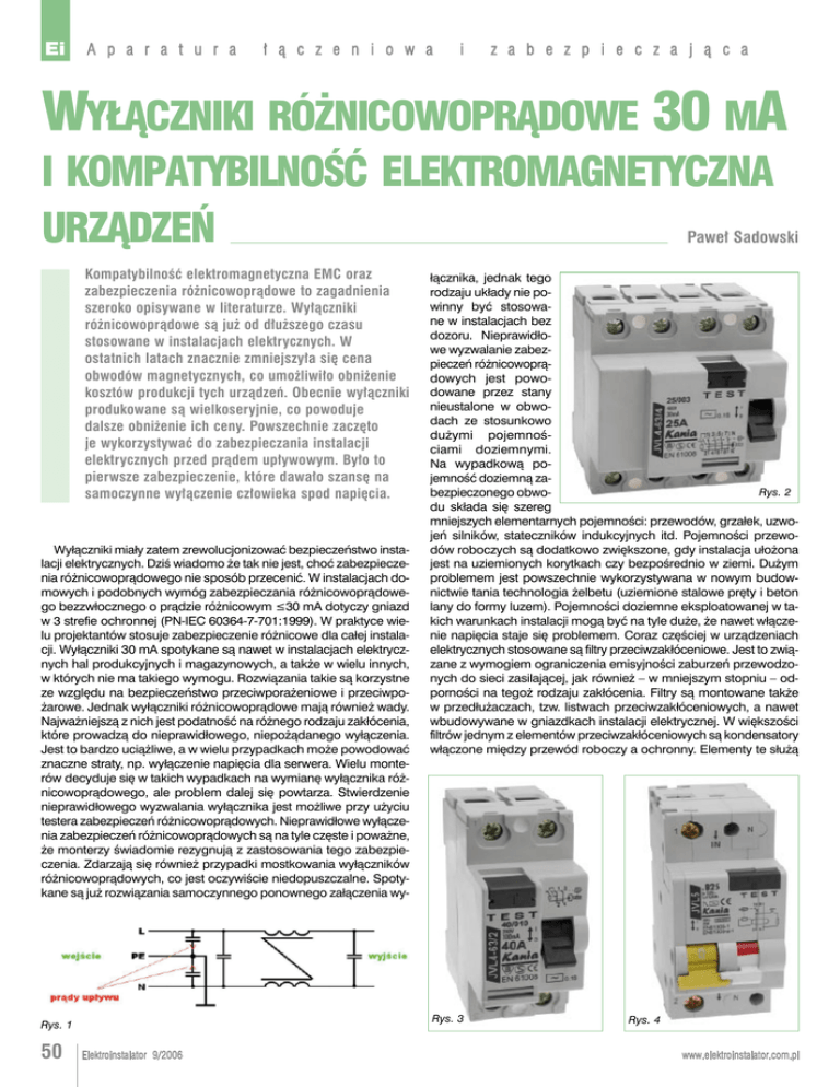 Ei A p a r a t u r a ł ą c z e n i o w a i z a b e z p i e c z a j ą c a Wyłączniki różnicowoprądowe 30 mA i kompatybilność elektromagnetyczna urządzeń Paweł Sadowski Kompatybilność elektromagnetyczna EMC oraz zabezpieczenia różnicowoprądowe to zagadnienia szeroko opisywane w literaturze. Wyłączniki różnicowoprądowe są już od dłuższego czasu stosowane w instalacjach elektrycznych. W ostatnich latach znacznie zmniejszyła się cena obwodów magnetycznych, co umożliwiło obniżenie kosztów produkcji tych urządzeń. Obecnie wyłączniki produkowane są wielkoseryjnie, co powoduje dalsze obniżenie ich ceny. Powszechnie zaczęto je wykorzystywać do zabezpieczania instalacji elektrycznych przed prądem upływowym. Było to pierwsze zabezpieczenie, które dawało szansę na samoczynne wyłączenie człowieka spod napięcia. Wyłączniki miały zatem zrewolucjonizować bezpieczeństwo instalacji elektrycznych. Dziś wiadomo że tak nie jest, choć zabezpieczenia różnicowoprądowego nie sposób przecenić. W instalacjach domowych i podobnych wymóg zabezpieczania różnicowoprądowego bezzwłocznego o prądzie różnicowym ≤30 mA dotyczy gniazd w 3 strefie ochronnej (PN-IEC 60364-7-701:1999). W praktyce wielu projektantów stosuje zabezpieczenie różnicowe dla całej instalacji. Wyłączniki 30 mA spotykane są nawet w instalacjach elektrycznych hal produkcyjnych i magazynowych, a także w wielu innych, w których nie ma takiego wymogu. Rozwiązania takie są korzystne ze względu na bezpieczeństwo przeciwporażeniowe i przeciwpożarowe. Jednak wyłączniki różnicowoprądowe mają również wady. Najważniejszą z nich jest podatność na różnego rodzaju zakłócenia, które prowadzą do nieprawidłowego, niepożądanego wyłączenia. Jest to bardzo uciążliwe, a w wielu przypadkach może powodować znaczne straty, np. wyłączenie napięcia dla serwera. Wielu monterów decyduje się w takich wypadkach na wymianę wyłącznika różnicowoprądowego, ale problem dalej się powtarza. Stwierdzenie nieprawidłowego wyzwalania wyłącznika jest możliwe przy użyciu testera zabezpieczeń różnicowoprądowych. Nieprawidłowe wyłączenia zabezpieczeń różnicowoprądowych są na tyle częste i poważne, że monterzy świadomie rezygnują z zastosowania tego zabezpieczenia. Zdarzają się również przypadki mostkowania wyłączników różnicowoprądowych, co jest oczywiście niedopuszczalne. Spotykane są już rozwiązania samoczynnego ponownego załączenia wy- Rys. 3 Rys. 1 50 łącznika, jednak tego rodzaju układy nie powinny być stosowane w instalacjach bez dozoru. Nieprawidłowe wyzwalanie zabezpieczeń różnicowoprądowych jest powodowane przez stany nieustalone w obwodach ze stosunkowo dużymi pojemnościami doziemnymi. Na wypadkową pojemność doziemną zaRys. 2 bezpieczonego obwodu składa się szereg mniejszych elementarnych pojemności: przewodów, grzałek, uzwojeń silników, stateczników indukcyjnych itd. Pojemności przewodów roboczych są dodatkowo zwiększone, gdy instalacja ułożona jest na uziemionych korytkach czy bezpośrednio w ziemi. Dużym problemem jest powszechnie wykorzystywana w nowym budownictwie tania technologia żelbetu (uziemione stalowe pręty i beton lany do formy luzem). Pojemności doziemne eksploatowanej w takich warunkach instalacji mogą być na tyle duże, że nawet włączenie napięcia staje się problemem. Coraz częściej w urządzeniach elektrycznych stosowane są filtry przeciwzakłóceniowe. Jest to związane z wymogiem ograniczenia emisyjności zaburzeń przewodzonych do sieci zasilającej, jak również – w mniejszym stopniu – odporności na tegoż rodzaju zakłócenia. Filtry są montowane także w przedłużaczach, tzw. listwach przeciwzakłóceniowych, a nawet wbudowywane w gniazdkach instalacji elektrycznej. W większości filtrów jednym z elementów przeciwzakłóceniowych są kondensatory włączone między przewód roboczy a ochronny. Elementy te służą Elektroinstalator 9/2006 Rys. 4 www.elektroinstalator.com.pl Ei Katalog Firm Instalacyjnych 2006/2007 KATALOG TO: � najniższy koszt dotarcia do potencjalnych klientów � aktualna informacja � dobra orientacja rynkowa � komunikacja pomiędzy sprzedającymi a kupującymi � w uzupełnieniu wersja on-line Instalator Polski Sp. z o.o. Dział Promocji i Katalogów e-mail: [email protected] tel. 0-22 678 37 30 wew. 120 lub 220 fax 0-22 679 52 03 w w w. k a t a l o g i . i p n e t . c o m . p l 52 REKLAMA 06/00448-01 Zgłoś swój udział! do tłumienia składowych asymetrycznych przewodzonych zakłóceń wielkiej częstotliwości. W każdym z filtrów znajdują się zwykle dwa kondensatory: na przewodzie neutralnym i fazowym. Pojemności tych elementów wynoszą zwykle od 1 do 4,7 nF. Całkowita pojemność obwodu zabezpieczonego wyłącznikiem różnicowoprądowym jest sumą wszystkich włączonych w obwód doziemnych pojemności. Pojemności te znacznie zwiększają wartość prądu upływowego instalacji. Jeśli urządzeń (stateczników elektronicznych, komputerów itp.) jest więcej, pojemności wypadkowe instalacji są na tyle duże, że mogą prowadzić do zakłóceń w funkcjonowaniu zabezpieczenia różnicowoprądowego. Największe pojemności występują w liniach kablowych ułożonych w ziemi (rzędu mikrofaradów) i są niebezpieczne dla człowieka. Zgodnie z prawem komutacji, w układzie z pojemnością napięcie nie może zmienić się skokowo. A więc włączenie napięcia oraz szybkie stany przejściowe powodują zmianę ładunku na pojemności instalacji. To z kolei powoduje przepływ prądu różnicowego i wyzwolenie zabezpieczenia. Wyzwolenie zabezpieczenia różnicowoprądowego mogą powodować zapady napięcia np. spowodowane bliskimi zwarciami. To powoduje równoczesne wyzwolenie wyłącznika różnicowoprądowego wraz z zabezpieczeniem nadmiarowym instalacji. Jeśli zabezpieczenie różnicowe umieszczone jest zb