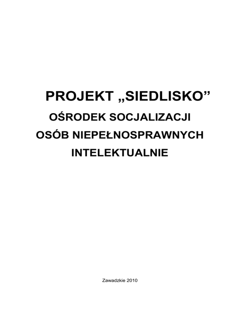 PROJEKT „SIEDLISKO” OŚRODEK SOCJALIZACJI OSÓB NIEPEŁNOSPRAWNYCH INTELEKTUALNIE Zawadzkie 2010 1. Założenia do projektu „Siedlisko” ośrodka socjalizacji osób niepełnosprawnych intelektualnie. Projekt jest szansą na rozwiązanie problemu wykluczenia społecznego i marginalizacji podstawowych potrzeb osób niepełnosprawnych intelektualnie. Jednym z głównych Niepełnosprawnym zrealizować w celów „Siedlisko” ramach w naszej Stowarzyszenia Zawadzkiem, działalności na które jest Rzecz Pomocy konsekwentnie aktywizacja Osobom próbujemy zawodowa osób niepełnosprawnych ze znacznym i umiarkowanym stopniem niepełnosprawności. Diagnozując środowisko osób niepełnosprawnych stwierdzamy, że samodzielność i samorealizacja w dorosłym życiu ma ogromne znaczenie i determinuje całokształt ich funkcjonowania. Wobec powyższego podjęliśmy kroki zmierzające do stworzenia ośrodka aktywności społecznej i zawodowej „Siedlisko”. Adresatami naszego przedsięwzięcia będą niepełnosprawni mieszkańcy północno-wschodniego rejonu Opolszczyzny. Ośrodek „Siedlisko” jest jedną z nielicznych szans w systemie pomocy społecznej, która daje niepełnosprawnym możliwość podjęcia pracy w warunkach specjalnej ochrony i nadzoru, z jednoczesnym respektowaniem prawa do szacunku i godności należnych każdej osobie. Obecnie nasi wychowankowie po ukończeniu edukacji pozostają bez jakichkolwiek propozycji na pracę i społeczny rozwój. Pozbawieni są systematycznych oddziaływań o charakterze terapeutyczno-edukacyjnym, a to w konsekwencji doprowadza do wykluczenia i marginalizacji. Aby temu zapobiec ważna jest ciągła stymulacja i pilotaż ich aktywności. Planujemy stworzyć kompleks, miejsce: rehabilitacji zawodowej i społecznej, pracy i zamieszkania. W skład ośrodka wchodziłyby: pion rehabilitacji społecznej i zawodowej, Niepubliczny Zakład Opiekuńczo-Leczniczego (NZOL) dla osób starszych i przewlekle chorych, w którym nasi niepełnosprawni znaleźliby zatrudnienie. Wieloletnie doświadczenie w pracy z niepełnosprawnymi intelektualnie pozwoliło nam na staranną diagnozę możliwości dotyczących kariery zawodowej powyższej grupy. Nasi podopieczni posiadają różne umiejętności i potencjał do podejmowania prostych działań. Potrafimy ich właściwie zmotywować, mamy dobry kontakt z rodzicami, którym służymy stałą pomocą. Nasze przedsięwzięcie jest nowatorskie na skalę całego kraju. Wprowadza innowacyjne ujęcie problemu pracy zawodowej, która sprawi, że niepełnosprawni odnajdą swoje rolę i miejsce w dorosłym życiu. Kompleks „Siedlisko” to doskonała wizytówka społecznej odpowiedzialności biznesu, otwartego na potrzeby niepełnosprawnych. II. STRUKTURA OŚRODKA SOCJALIZACJI OSÓB NIEPEŁNOSPRAWNYCH „SIEDLISKO” Kompleks „Siedlisko” stanie się instytucją zabezpieczającą miejsca pracy osobom ze znacznym i umiarkowanym stopniem niepełnosprawności. Podejmowana przez naszych podopiecznych praca odbywać się będzie pod kierunkiem wykwalifikowanej kadry. Kompleks socjalizacji osób niepełnosprawnych „Siedlisko” Pion rehabilitacji społecznej i zawodowej NZOL (miejsce pracy niepełnosprawnych) Sekcja A Gastronomia Sekcja B Opiekuńczo -pielęgnacyjna Mieszkalnictwo chronione Sekcja C Porządkowa -konserwatorska SEKCJA A GASTRONOMIA zaplecze zabezpieczające przygotowanie posiłków dla pensjonariuszy (w dalszej perspektywie catering, stołówka socjalna dla mieszkańców okolicznych gmin). Osoby niepełnosprawne posiadają kompetencje pozwalające na efektywną pracę w kuchni. Bezbłędnie wykonują schematyczne czynności związane z estetycznym przygotowaniem i obróbką żywności. Są zdyscyplinowani, uporządkowani i chętnie wykonują wyuczone czynności. SEKCJA B OPIEKUŃCZO–PIELĘGNACYJNA kadra medyczna oraz osoby niepełnosprawne zatrudnione w charakterze asystenta osoby chorej. Osoby niepełnosprawne pomimo dolegliwości i kalectwa prezentują wysoki poziom empatii, są wiernymi towarzyszami i troskliwymi opiekunami. Zamierzamy wykorzystać ich potencjał zarówno do działań pielęgnacyjnych jak i w celach terapeutycznych. SEKCJA C PORZĄDKOWO–KONSERWATORSKA zaplecze utrzymujące porządek w budynku i w jego obejściu. Nasi podopieczni w wyniku wieloletniej edukacji nabywają umiejętność dokładnego sprzątania, pielęgnowania terenów zieleni. Bezpiecznie obsługują proste urządzenia. Dodatkowym atutem jest fakt, że pomimo dysfunkcji intelektualnych są osobami silnymi pod względem fizycznym. Pod kierunkiem instruktora są w stanie wykonać wiele różnorodnych prac wymagających aktywności fizycznej. ATUTY: 1. Ośrodek „Siedlisko” będzie dążył do kompleksowej opieki nad ludźmi starszymi: opieka pielęgnacyjna wspierająca działania NZOZ „Caritas” i Ośrodków Pomocy Społecznej. W przyszłości planujemy poszerzyć działalność o specjalistyczny transport osób obłożnie chorych oraz o rehabilitację dzienną. 2. W obliczu wydłużenia wieku życia, dużej migracji młodych osób, osamotnienia ludzi starszych zorganizowanie specjalistycznej opieki paliatywnej jest zasadne z ekonomicznego punktu widzenia i daje realne perspektywy na samodzielne utrzymanie i wypracowanie środków finansowych z przeznaczeniem na mieszkalnictwo chronione. 3. Ośrodek „Siedlisko” będzie miejscem użyteczności publicznej, wyposażonym w nowoczesny sprzęt, służący do rehabilitacji osób starszych i niepełnosprawnych podopiecznych. 4. Zatrudnienie w kompleksie „Siedlisko” znajdzie grupa około sześćdziesięciu osób, aktualnie nie posiadająca jakiejkolwiek propozycji pracy skazana na wegetację w czterech ścianach. 5. Kompleks „Siedlisko” stanie się wizytówką społecznej odpowiedzialności różnych organizacji i instytucji działających na rzecz polepszania jakości życia oraz wyrównywania szans w dostępie do zatrudnienia osób niepełnosprawnych intelekt