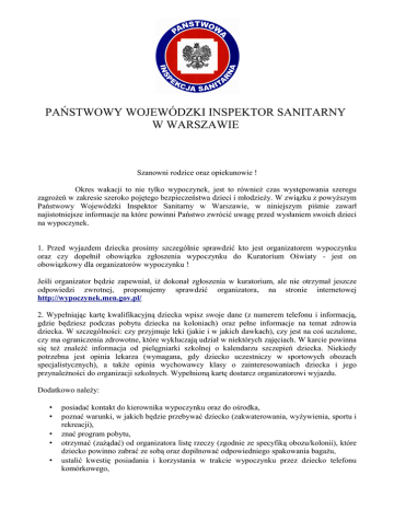 PAŃSTWOWY WOJEWÓDZKI INSPEKTOR SANITARNY W WARSZAWIE Szanowni rodzice oraz opiekunowie ! Okres wakacji to nie tylko wypoczynek, jest to również czas występowania szeregu zagrożeń w zakresie szeroko pojętego bezpieczeństwa dzieci i młodzieży. W związku z powyższym Państwowy Wojewódzki Inspektor Sanitarny w Warszawie, w niniejszym piśmie zawarł najistotniejsze informacje na które powinni Państwo zwrócić uwagę przed wysłaniem swoich dzieci na wypoczynek. 1. Przed wyjazdem dziecka prosimy szczególnie sprawdzić kto jest organizatorem wypoczynku oraz czy dopełnił obowiązku zgłoszenia wypoczynku do Kuratorium Oświaty - jest on obowiązkowy dla organizatorów wypoczynku ! Jeśli organizator będzie zapewniał, iż dokonał zgłoszenia w kuratorium, ale nie otrzymał jeszcze odpowiedzi zwrotnej, proponujemy sprawdzić organizatora, na stronie internetowej http://wypoczynek.men.gov.pl/ 2. Wypełniając kartę kwalifikacyjną dziecka wpisz swoje dane (z numerem telefonu i informacją, gdzie będziesz podczas pobytu dziecka na koloniach) oraz pełne informacje na temat zdrowia dziecka. W szczególności: czy przyjmuje leki (jakie i w jakich dawkach), czy jest na coś uczulone, czy ma ograniczenia zdrowotne, które wykluczają udział w niektórych zajęciach. W karcie powinna się też znaleźć informacja od pielęgniarki szkolnej o kalendarzu szczepień dziecka. Niekiedy potrzebna jest opinia lekarza (wymagana, gdy dziecko uczestniczy w sportowych obozach specjalistycznych), a także opinia wychowawcy klasy o zainteresowaniach dziecka i jego przynależności do organizacji szkolnych. Wypełnioną kartę dostarcz organizatorowi wyjazdu. Dodatkowo należy: • • • • • posiadać kontakt do kierownika wypoczynku oraz do ośrodka, poznać warunki, w jakich będzie przebywać dziecko (zakwaterowania, wyżywienia, sportu i rekreacji), znać program pobytu, otrzymać (zażądać) od organizatora listę rzeczy (zgodnie ze specyfiką obozu/kolonii), które dziecko powinno zabrać ze sobą oraz dopilnować odpowiedniego spakowania bagażu, ustalić kwestię posiadania i korzystania w trakcie wypoczynku przez dziecko telefonu komórkowego, • • • sprawdzić, czy dziecko jest dodatkowo ubezpieczone od nieszczęśliwego wypadku, w wypadku pozostawania dziecka w trakcie leczenia - ustalić z organizatorem kwestie przyjmowania przez dziecko leków (czy dziecko przyjmuje je samo czy opiekun mu w tym pomaga - jeśli tak, musi wiedzieć jakie dawki i w jakich odstępach czasowych dziecko ma je przyjmować), poinformować organizatora o wszelkich nietypowych zachowaniach dziecka (moczenie w nocy, lunatykowanie, uczulenia żywieniowe, itp.), które mogą mieć wpływ na bezpieczeństwo dziecka lub powstawanie sytuacji niekomfortowych dla dziecka i innych uczestników. Przed wyjazdem dziecka, warto odbyć z nim rozmowę odnośnie bezpiecznych i higienicznych zachowań, szczególnie aby: 1.W trosce o swoje zdrowie: • dokładnie myło ręce pod bieżącą wodą przed posiłkami oraz bezwzględnie po każdym skorzystaniu z toalety, • dbało o higienę osobistą, nie używało wspólnie z innymi osobami ręcznika, grzebienia i innych przyborów toaletowych oraz nie wymieniało się i nie pożyczało ubrań, • nie piło napojów z jednego pojemnika (butelki, kubka) z innymi uczestnikami wypoczynku, • dokładnie myło surowce (owoce, warzywa) podczas sporządzania posiłku, pamiętało o właściwym przechowywaniu żywności, unikało zakupów wątpliwej jakości żywności • w razie niepokojących objawów samopoczucia i zdrowia (m. in. nudności, bóle brzucha, wymioty, biegunka, gorączka) zgłosiło się do opiekuna lub wychowawcy. 2.Nad wodą, zachowywało się ostrożnie i nie utrudniało kąpieli innym, nie skakało do wody w miejscach nierozpoznanych, przestrzegało regulaminu kąpieliska, nie zaśmiecało plaży, słuchało poleceń ratownika oraz wychowawcy. 3.Podczas opalania odsłonięte części ciała chroniło kremem zawierającym filtr (prosimy pamiętać aby wyposażyć dziecko w odpowiedni preparat), rezygnowało lub korzystało z cienia w godzinach największego działania słońca, chroniło głowę i oczy przed słońcem, regularnie piło duże ilości wody. 4.Uczestnicząc w wycieczkach do lasu (z uwagi na kleszcze) nosiło w lesie odpowiednią odzież, zakrywało jak najwięcej części ciała, po wizycie w lesie obejrzało całe ciało oraz odzież, w razie zlokalizowania owada zgłosiło się jak najszybciej do opiekuna, wychowawcy. 5.Nie zbliżało się do obcych zwierząt (psa, kota oraz zwierząt w lesie) nawet jeśli robi wrażenie łagodnego. 6.Do zabawy wybierało miejsca bezpieczne, mówiło zawsze opiekunom dokąd wychodzi oraz informowało ich o wszelkich sytuacjach zagrożenia (np. kontakt z postronnymi osobami). Jeżeli Twoje dziecko wypoczywa na terenie województwa mazowieckiego, w razie wątpliwości dotyczących warunków sanitarnych prosimy o kontakt, do: • Powiatowych Stacji Sanitarno-Epidemiologicznych w zależności od miejsca wypoczynku dziecka (wykaz adresów oraz telefonów na stronie http://www.wsse.waw.pl/ pod zakładką Stacje Powiatowe i Stacja Graniczna) • Oddziału Higieny Dzieci i Młodzieży Wojewódzkiej Stacji Sanitarno-Epidemiologicznej w Warszawie tel: 22 432 10 04/24 lub drogą elektroniczną [email protected]