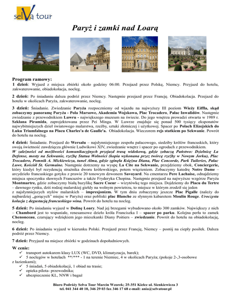 Paryż i zamki nad Loarą Program ramowy: 1 dzień: Wyjazd z miejsca zbiórki około godziny 06:00. Przejazd przez Polskę, Niemcy. Przyjazd do hotelu, zakwaterowanie, obiadokolacja, nocleg. 2 dzień: Po śniadaniu dalsza podróż przez Niemcy. Następnie przejazd przez Francję. Obiadokolacja. Przejazd do hotelu w okolicach Paryża, zakwaterowanie, nocleg. 3 dzień: Śniadanie. Zwiedzanie Paryża rozpoczniemy od wjazdu na najwyższy III poziom Wieży Eiffla, skąd zobaczymy panoramę Paryża - Pola Marsowe, Akademia Wojskowa, Plac Trocadero, Pałac Inwalidów. Następnie zwiedzanie z przewodnikiem Luwru - największego muzeum na świecie. Do jego wnętrza prowadzi otwarta w 1989 r. Szklana Piramida, zaprojektowana przez Pei Minga. W Luwrze znajduje się ponad 500 tysięcy eksponatów najwybitniejszych dzieł światowego malarstwa, rzeźby, sztuki złotniczej i użytkowej. Spacer po Polach Elizejskich do Łuku Triumfalnego na Placu Charles'a de Gaulle'a. Obiadokolacja. Wieczorem rejs statkiem po Sekwanie. Powrót do hotelu na nocleg. 4 dzień: Śniadanie. Przejazd do Wersalu – najsłynniejszego zespołu pałacowego, siedziby królów francuskich, który swoją świetność zawdzięcza głównie Ludwikowi XIV, zwiedzanie wnętrz i spacer po ogrodach z przewodnikiem. W zależności od możliwości komunikacyjnych przejazd trasą widokową, gdzie zobaczą Państwo: Dzielnicę La Defense, mosty na Sekwanie, rzeźbę Statua Wolności (kopia wykonana przez twórcę rzeźby w Nowym Jorku), Plac Trocadero, Pomnik A. Mickiewicza, tunel Alma, gdzie zginęła Księżna Diana, Plac Concorde, Park Tuileries, Pałac Luwr, Kościół St. Germaine. Następnie dotrzemy na wyspę La Cite na Sekwanie, przejdziemy obok, Conciergerie, który kiedyś był rezydencją strażnika dworu królewskiego, potem więzieniem. Zobaczymy katedrę Notre Dame – arcydzieło francuskiego gotyku z prawie 20 tonowym dzwonem Savoyard. Na cmentarzu Pere Lachaise, odnajdziemy miejsca spoczynku sławnych Francuzów a także Fryderyka Chopina. Następnie przejazd na najwyższe wzgórze Paryża Montmartre, gdzie zobaczymy białą bazylikę Sacre Coeur – wizytówkę tego miejsca. Dojdziemy do Placu du Tertre – dawnego rynku, dziś rodzaj malarskiej giełdy na wolnym powietrzu, to miejsce w którym zrodził się jeden z najsłynniejszych stylów malarskich – impresjonizm. W tym dniu zobaczymy jeszcze Plac Pigalle (należy do najbardziej „gorących” miejsc w Paryżu) oraz pobliski plac Blanche ze słynnym kabaretem Moulin Rouge. Uroczysta kolacja z degustacją francuskiego wina. Powrót do hotelu na nocleg. 5 dzień: Po śniadaniu wyjazd w Dolinę Loary. Nad jej brzegami wybudowano około 300 zamków. Największy z nich – Chambord jest to wspaniałe, renesansowe dzieło króla Franciszka I – spacer po parku. Kolejna perła to zamek Chenonceau, czarujący wdziękiem jego mieszkanki Diany Poitiers – zwiedzanie. Powrót do hotelu na obiadokolację, nocleg. 6 dzień: Po śniadaniu wyjazd w kierunku Polski. Przejazd przez Francję, Niemcy – postój na ciepły posiłek. Dalsza podróż przez Niemcy. 7 dzień: Przyjazd na miejsce zbiórki w godzinach dopołudniowych. W cenie: transport autokarem klasy LUX (WC, DVD, klimatyzacja, barek); 5 noclegów w hotelach **/*** - 1 na terenie Niemiec, 4 w okolicach Paryża; (pokoje 2-,3-osobowe z łazienkami); 5 śniadań, 5 obiadokolacji, 1 obiad na trasie; opieka pilota- przewodnika; ubezpieczenie KL, NNW i bagaż Biuro Podróży Selva Tour Marcin Wzorek; 25-351 Kielce ul. Sienkiewicza 3 tel. 041 344 40 10, 346 29 03 fax 346 17 68 e-mail: [email protected] Dodatkowo płatne: bilety wstępu do zwiedzanych obiektów ok. 65-70 EUR. UWAGA: program ma charakter ramowy i jest uzależniony od miejscowych uwarunkowań oraz ustaleń grupy; pilot nie oprowadza po muzeach; Biuro Podróży Selva Tour Marcin Wzorek; 25-351 Kielce ul. Sienkiewicza 3 tel. 041 344 40 10, 346 29 03 fax 346 17 68 e-mail: [email protected]