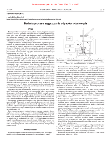 Prosimy cytować jako: Inż. Ap. Chem. 2011, 50, 1, 29-30 INŻYNIERIA I APARATURA CHEMICZNA Nr 1/2011 str. 29 Sławomir OBIDZIŃSKI e-mail: [email protected] Zakład Techniki Rolno-Spożywczej, Wydział Mechaniczny, Politechnika Białostocka, Białystok Badania procesu zagęszczania odpadów tytoniowych Wstęp Przemysł rolno-spożywczy i inne gałęzie przemysłu przetwarzające materiały roślinne, generują olbrzymie ilości odpadów poprodukcyjnych: łuska gryki powstająca przy produkcji kaszy, wytłoki rzepakowe powstające przy produkcji oleju rzepakowego, wycierka ziemniaczana pozostająca po produkcji skrobi, miąższ owoców powstający przy produkcji soków owocowych, i wiele innych. Jednym z odpadów przemysłowych pochodzenia organicznego zaliczanych do grupy odpadów uciążliwych należą m.in. odpady tytoniowe, powstałe w różnych procesach cyklu produkcyjnego tytoniu i papierosów. Odpady te mają różną konsystencję – zależnie od miejsc ich powstawania [1]. Najczęściej w ich skład wchodzą resztki liści tytoniu jako skrawki rośliny, wiórki, czy pył o zróżnicowanej ziarnistości (od kilkunastu μm do 1 mm) [2]. W Polsce istnieje kilka fabryk papierosów (m.in. British-American Tobacco w Augustowie) i we wszystkich z nich istnieje problem zagospodarowania pyłów tytoniowych. Do niedawna odpady tytoniowe w postaci pyłu oraz łodyg, uważane były za całkowicie bezużyteczne i wyrzucane były w dużych ilościach, wynoszących kilkanaście i więcej ton na dobę, przez co zajmowały duże obszary wokół zakładów tytoniowych. Odpady te częściowo niszczono na hałdach, przeważnie przez ich spalenie, w celu zapobieżenia rozprzestrzeniania pyłu przez wiatr oraz w celu zmniejszenia stale narastających ilości tych odpadów [1]. Odpady tytoniowe charakteryzują się dużą przydatnością do użytkowania przyrodniczego i mogą być zagospodarowywane w różny sposób [3–5]. Najtańszym sposobem zagospodarowania odpadów tytoniowych jest stosowanie ich jako nawozu, gdyż przyrodnicze wykorzystanie opadów organicznych jest w pełni uzasadnione ekonomicznie i niesie za sobą wiele pozytywnych zmian w środowisku [2], zwiększa plony zbóż [4], wpływa pozytywnie na właściwości gleby na których uprawiane są warzywa [6]. Innym sposobem zagospodarowania odpadów tytoniowych jest ich wykorzystanie jako komponentu do produkcji lekkich betonów konstrukcyjnych [7]. Charakterystyczną cechą odpadów tytoniowych jest ich niska wilgotność. Właściwość ta powoduje, że do ich przeróbki celowe jest stosowanie procesów biologicznych lub termicznych [2]. Ze względu na mały ciężar objętościowy tych odpadów przy równoczesnym ich rozdrobnieniu nie nadają się one do bezpośredniego spalania przemysłowego, nawet z dodatkiem paliwa stałego, na przykład w paleniskach kotłowych. Pył tytoniowy, jak każdy pył organiczny, jest również niebezpieczny dla zdrowia ludzi. Wdychanie go może prowadzić do powstawania chorób alergicznych i schorzeń immunotoksycznych [2]. Dlatego też zakłady tytoniowe wprowadziły proces zagęszczania (brykietowania, granulowania) pyłów tytoniowych zmniejszając w ten sposób objętość powstających odpadów [8]. Poza tym, energetyka zawodowa jest zobowiązana, zgodnie z Rozporządzeniem Ministra Gospodarki z 14 sierpnia 2008 [9] przy produkcji tzw. energii zielonej wykorzystywać coraz większe ilości biomasy, która nie może pochodzić z produkcji leśnej i przemysłu przetwarzającego jej odpady (aż do poziomu 100% w 2015 r.). W związku z powyższym odpady poprodukcyjne mogą stanowić bogate źródło tzw. biomasy nieleśnej i należy przypuszczać, że w najbliższych latach będą cieszyły się coraz większym popytem jako surowiec do produkcji ekologicznego paliwa stałego. Metodyka badań Badania przeprowadzono na stanowisku badawczym SS-3 (Rys. 1), częściowo zmodernizowanym na potrzeby prowadzonych badań. Rys. 1. Stanowisko SS-3: a) schemat stanowiska: 1 – praska, 2 – podstawa, 3 – komora zagęszczania, 4 – element termostatujący, 4a – opaska grzejna, 5 – dno komory, 6 – tłok zagęszczający, 7 – króćce , 8 – czujnik przemieszczenia, 9 – rejestrator wielokanałowy, 10 – regulator temperatury, 11 – komputer W skład stanowiska wchodzi praska ręczna – 1, na której podstawie – 2 zamocowano otwartą komorę zagęszczania – 3 (posiadającą otwór o średnicy 9 mm), do którego zasypywano badany materiał. Komora zagęszczania – 3 jest ogrzewana, dzięki czemu możliwa jest regulacja temperatury procesu. Ogrzewanie komory – 3 może być realizowane za pomocą opaski grzejnej – 4a nałożonej od góry na specjalny elementem termostatującym – 4, lub tylko z wykorzystaniem elementu termostatującego – 4, do którego doprowadzono wodę króćcami – 7, z ultratermostatu. Zadana temperatura jest uzyskiwana dzięki regulatorowi temperatury – 10 sprzężonemu z opaską grzejną – 4a. Zagęszczanie materiału odbywało się za pomocą tłoka – 6, z czujnikiem tensometrycznym pozwalające na rejestrację sił działających na tłok. Sygnały z układu tensometrów naklejonych na tłoku zagęszczającym – 6, tłoczków bocznych oraz z czujnika przemieszczenia – 8 doprowadzano do rejestratora wielokanałowego – 9 typu Spider – 8 sprzężonego z komputerem – 11 i zapisywano w postaci plików binarnych, które poddano dalszej obróbce. Badanie procesu zagęszczania składało się z trzech etapów: – przygotowanie surowca przed procesem zagęszczania (oczyszczenie odpadów filtrów i bibuły, dowilżanie w celu uzyskania przyjętych wilgotności, przygotowanie próbek o określonej masie, wygrzewanie matrycy i próbek do zadanej temperatury), – zagęszczanie (granulowanie) przygotowanych próbek materiału (po 20 próbek dla każdego punktu przyjętego planu eksperymentu) w komorze otwartej (o średnicy 9 mm) i rejestracja wyników, – ozna