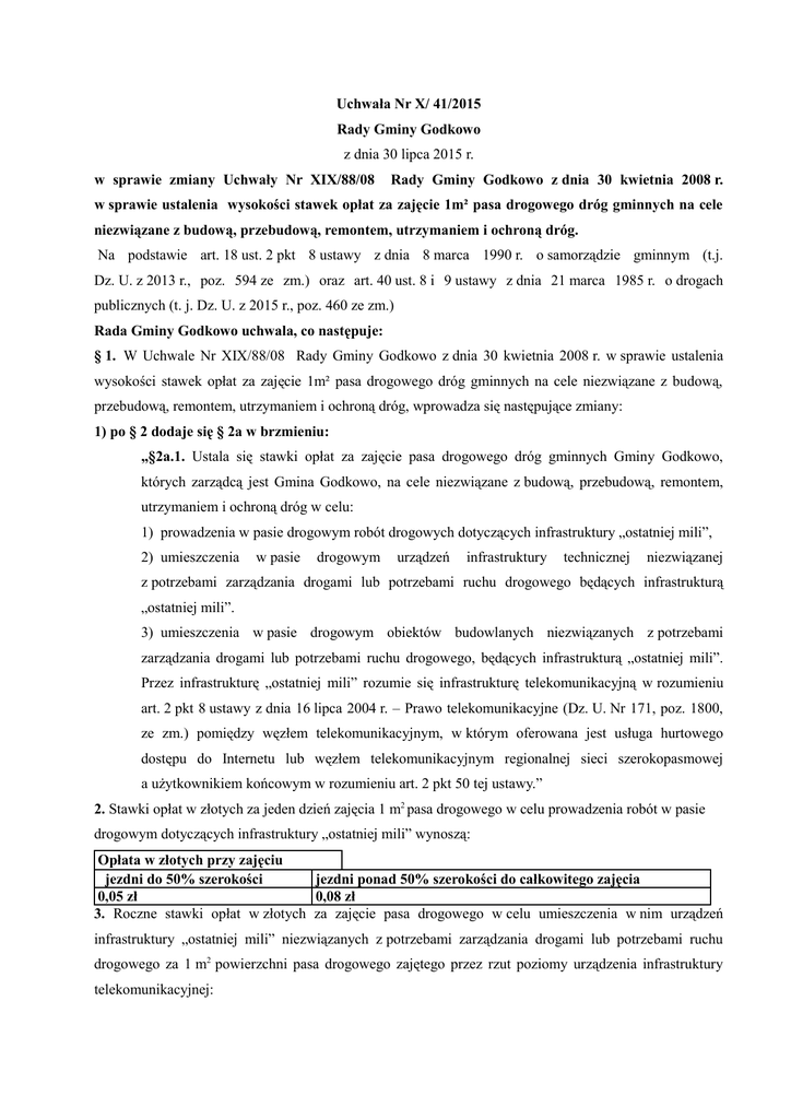 Uchwała Nr X/ 41/2015 Rady Gminy Godkowo z dnia 30 lipca 2015 r. w sprawie zmiany Uchwały Nr XIX/88/08 Rady Gminy Godkowo z dnia 30 kwietnia 2008 r. w sprawie ustalenia wysokości stawek opłat za zajęcie 1m² pasa drogowego dróg gminnych na cele niezwiązane z budową, przebudową, remontem, utrzymaniem i ochroną dróg. Na podstawie art. 18 ust. 2 pkt 8 ustawy z dnia 8 marca 1990 r. o samorządzie gminnym (t.j. Dz. U. z 2013 r., poz. 594 ze zm.) oraz art. 40 ust. 8 i 9 ustawy z dnia 21 marca 1985 r. o drogach publicznych (t. j. Dz. U. z 2015 r., poz. 460 ze zm.) Rada Gminy Godkowo uchwala, co następuje: § 1. W Uchwale Nr XIX/88/08 Rady Gminy Godkowo z dnia 30 kwietnia 2008 r. w sprawie ustalenia wysokości stawek opłat za zajęcie 1m² pasa drogowego dróg gminnych na cele niezwiązane z budową, przebudową, remontem, utrzymaniem i ochroną dróg, wprowadza się następujące zmiany: 1) po § 2 dodaje się § 2a w brzmieniu: „§2a.1. Ustala się stawki opłat za zajęcie pasa drogowego dróg gminnych Gminy Godkowo, których zarządcą jest Gmina Godkowo, na cele niezwiązane z budową, przebudową, remontem, utrzymaniem i ochroną dróg w celu: 1) prowadzenia w pasie drogowym robót drogowych dotyczących infrastruktury „ostatniej mili”, 2) umieszczenia w pasie drogowym urządzeń infrastruktury technicznej niezwiązanej z potrzebami zarządzania drogami lub potrzebami ruchu drogowego będących infrastrukturą „ostatniej mili”. 3) umieszczenia w pasie drogowym obiektów budowlanych niezwiązanych z potrzebami zarządzania drogami lub potrzebami ruchu drogowego, będących infrastrukturą „ostatniej mili”. Przez infrastrukturę „ostatniej mili” rozumie się infrastrukturę telekomunikacyjną w rozumieniu art. 2 pkt 8 ustawy z dnia 16 lipca 2004 r. – Prawo telekomunikacyjne (Dz. U. Nr 171, poz. 1800, ze zm.) pomiędzy węzłem telekomunikacyjnym, w którym oferowana jest usługa hurtowego dostępu do Internetu lub węzłem telekomunikacyjnym regionalnej sieci szerokopasmowej a uŜytkownikiem końcowym w rozumieniu art. 2 pkt 50 tej ustawy.” 2. Stawki opłat w złotych za jeden dzień zajęcia 1 m2 pasa drogowego w celu prowadzenia robót w pasie drogowym dotyczących infrastruktury „ostatniej mili” wynoszą: Opłata w złotych przy zajęciu jezdni do 50% szerokości jezdni ponad 50% szerokości do całkowitego zajęcia 0,05 zł 0,08 zł 3. Roczne stawki opłat w złotych za zajęcie pasa drogowego w celu umieszczenia w nim urządzeń infrastruktury „ostatniej mili” niezwiązanych z potrzebami zarządzania drogami lub potrzebami ruchu drogowego za 1 m2 powierzchni pasa drogowego zajętego przez rzut poziomy urządzenia infrastruktury telekomunikacyjnej: Lokalizacja urządzenia w pasie drogowym wzdłuŜ drogi w jezdni w poprzek drogi 5 zł 1,5 zł 4. Stawki opłat za zajęcie pasa drogowego w celu umieszczenia w nim obiektów budowlanych niezwiązanych z potrzebami zarządzania drogami lub potrzebami ruchu drogowego, będących infrastrukturą „ostatniej mili” za 1 m2 powierzchni pasa drogowego zajętego przez rzut poziomy obiektu budowlanego za jeden dzień zajęcia wynoszą: Opłata w złotych przy zajęciu jezdni do 50% szerokości jezdni ponad 50% szerokości do całkowitego zajęcia 0,05 zł 0,08 zł 5. Za umieszczenie na drogowym obiekcie inŜynierskim urządzenia infrastruktury „ostatniej mili” ustala się, roczną stawkę opłat za 1 m2 pasa drogowego zajętego przez rzut poziomy umieszczanego urządzenia w wysokości 5 zł.” § 2. Do postępowań w sprawie ustalenia opłaty za zajęcie pasa drogowego w celach, o których mowa w § 2a ust. 1-5 , uchwały zmienionej w § 1 w brzmieniu określonym niniejszą uchwałą, wszczętych i niezakończonych przed dniem wejścia w Ŝycie niniejszej uchwały, stosuje się stawki opłat w wysokości ustalonej niniejszą uchwałą.” § 3. Wykonanie uchwały powierza się Wójtowi Gminy Godkowo. § 4. Uchwała wchodzi w Ŝycie po upływie 14 dni od dnia ogłoszenia w Dzienniku Urzędowym Województwa Warmińsko-Mazurskiego. Przewodniczący Rady Gminy Mariusz Dziki UZASADNIENIE do Uchwały Nr X/ 41/2015 Rady Gminy Godkowo z dnia 30 lipca 2015 r. Ustalenie odrębnych stawek opłat za zajęcie pasa drogowego obejmuje infrastrukturę „ostatniej mili”. Pojęcie to występuje juŜ w przepisach prawa powszechnie obowiązującego, choć nie zostało w nich wprost zdefiniowane. W §1 ust. 3 rozporządzenia Ministra Spraw Wewnętrznych i Administracji w sprawie udzielenia przez Władzę WdraŜającą Programy Europejskie pomocy finansowej na dostarczenie usługi szerokopasmowego dostępu do Internetu na odcinku „ostatniej mili” w ramach POIG, 2007 – 2013 (Dz. U. z 2010 r., Nr 170, poz. 1147) zdefiniowano dostarczenie usługi szerokopasmowego dostępu do Internetu na odcinku ”ostatniej mili” i tam określono, Ŝe dostarczenie tej usługi realizowane jest poprzez infrastrukturę „ostatniej mili” łączącej (lokal) uŜytkownika końcowego z punktem dystrybucji równieŜ zdefiniowanym w rozporządzeniu. Na podstawie tych przepisów moŜna było zdefiniować w projekcie uchwały infrastrukturę „ostatniej mili”. Celem uchwały jest wsparcie celów związanych z zapewnieniem uŜytkownikom końcowym dostępu do Internetu, dlatego teŜ uchwała dotyczy infrastruktury „ostatniej mili” dołączanej do węzłów dystrybucji, w których oferowana jest usługa hurtowego dostępu do Internetu lub do węzłów sieci SSPW (niezaleŜnie czy oferowana w nich będzie usługa hurtowego dostępu do Internetu). Ustalenie stawek opłat ma charakter przedmiotowy, nie jest ograniczone do przedsiębiorców (mogą z niego korzystać np. jednostki sektora publicznego), ani teŜ nie jest ograniczone do określonego sektora (infrastruktura „ostatniej mili” moŜe być budowana np. przez podmioty z sektora energetycznego, wodno – kanalizacyjnego, bo nie jest wymagane, by inwestor i właściciel tej infras