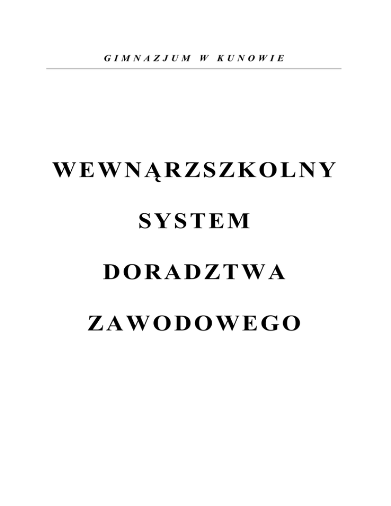 GIMNAZJUM W KUNOWIE W EW NĄ RZ S ZK O LN Y S YS T EM DO R AD ZT W A ZAW O DO W EG O SPIS TREŚCI: WSTĘP 1. CHARAKTERYSTYKA PROGRAMU (czas, miejsce realizacji programu). 2. CELE PROGRAMU. 3. ZADANIA PRZY REALIZACJI PROGRAMU. 4. FORMY REALIZACJI. 5. METODY PRACY. 6. EFEKTY. 7. PLAN DZIAŁAŃ. 8. ZATWIERDZENIE PROGRAMU. WSTĘP Uczniowie kończący gimnazjum stają przed wyborem szkoły oraz kierunku dalszego kształcenia. Podjęcie decyzji o wyborze zawodu jest trudnym etapem w Ŝyciu. WaŜne jest wyposaŜenie młodzieŜy w umiejętności przydatne w podejmowaniu decyzji dotyczących wyboru zawodu, które rzutować będą na dalszy przebieg kariery zawodowej młodego człowieka. Uczeń powinien poznać siebie i własne predyspozycje zawodowe, by mógł dokonać prawidłowego wyboru. Bazując na zainteresowaniach oraz słabych i mocnych stronach kaŜdego ucznia naleŜy ukierunkować go na wybór dalszego kształcenia i przygotować do podjęcia decyzji o wyborze zawodu. Proponowane w programie działania pozwalają uczniowi na lepsze przyjrzenie się sobie, analizę swoich mocnych i słabych stron, zainteresowań oraz cech osobowościowych – waŜnych przy podejmowaniu decyzji. Zajęcia mają dostarczyć młodzieŜy oraz ich rodzicom wiedzy pozwalającej na świadomy wybór dalszego kształcenia oraz podjęcia decyzji dotyczących wyboru zawodu. 1. CHARAKTERYSTYKA PROGRAMU (czas i miejsce realizacji). Wewnątrzszkolny System Doradztwa Zawodowego realizowany jest w Gimnazjum w Kunowie. Został opracowany przez pedagoga szkolnego. Program realizowany jest wśród uczniów klas trzecich gimnazjum. Działania prowadzone w ramach orientacji zawodowej zaplanowane są na dwa półrocza. W pierwszym półroczu w klasach trzecich prowadzone są warsztaty zawodoznawcze, na których uczniowie poznają: • siebie, swoje mocne i słabe strony, zainteresowania, zdolności, predyspozycje, czynniki, jakie naleŜy brać pod uwagę przy wyborze przyszłego zawodu i szkoły • młodzieŜ zapoznaje się z zawodami istniejącymi na rynku pracy – uczeń poznaje jakie czynności wykonuje osoba reprezentująca dany zawód, jakie są wymagania • omawiane są przeciwwskazania zdrowotne przy wyborze zawodu. W drugim półroczu: • organizowane są wyjazdy na dni otwarte do szkół ponadgimnazjalnych • nauczyciele szkół średnich przyjeŜdŜają na spotkania z młodzieŜą (przedstawiają oferty szkół, kierunki kształcenia, zasady naboru, wyposaŜają w foldery, ulotki, broszury, prezentują pokazy multimedialne) • współpraca z poradnią psychologiczno – pedagogiczną w organizowaniu działań zawodoznawczych (warsztaty prowadzone przez pracowników poradni) • kierowanie niezdecydowanych uczniów co do wyboru przyszłego zawodu lub szkoły na badania preferencji zawodowych do poradni • ankiety – test skłonności zawodowych, test zainteresowań • warsztaty z młodzieŜą prowadzone przez pedagoga (zapoznanie z zasadami rekrutacji do szkół, kierunkami, terminem składania kwestionariuszy, rozdanie kart z terminami, omówienie punktacji za poszczególne przedmioty, poinformowanie o dokumentach, jakie są potrzebne do przyjęcia do szkoły) • zapoznanie uczniów z elektronicznym naborem, podanie uczniom stron internetowych z informacjami o szkołach i zasadach rekrutacji. Działania zawarte w Wewnątrzszkolnym Systemie Doradztwa Zawodowego realizowane są przez pedagoga szkolnego oraz nauczycieli Gimnazjum w Kunowie w ramach: lekcji wychowawczych, lekcji przedmiotowych oraz wycieczek. RównieŜ działania zawodoznawcze realizowane są na dodatkowych spotkaniach prowadzonych przez specjalistów: pedagoga ds. zawodoznawczych poradni psychologicznopedagogicznej, doradcy zawodowego, itp. Program obejmuje następujące obszary działań: - praca z klasą (zajęcia grupowe) - spotkania z rodzicami - praca z nauczycielami Wewnątrzszkolny System Doradztwa Zawodowego realizowany jest w 3 blokach tematycznych: Zadaniem modułu I jest stworzenie uczniom warunków do lepszego poznania swojej osobowości i odpowiedzi na pytania: a) Jakie są moje mocne i słabe strony? b) Co lubię w sobie najbardziej? c) Co mnie naprawdę pasjonuje? d) Mój system wartości, zainteresowania i zdolności. W module II uczniowie odpowiadają sobie na pytania: a) W jakich dziedzinach Ŝycia gospodarczego i społecznego widzę siebie w przyszłości? b) Jaki zawód uwaŜam za najbardziej interesujący? c) Co według mnie znaczy „dobra praca”?. Jakie warunki musi spełniać taka praca? W module III uczniowie powinni znaleźć odpowiedzi na pytania: a) Jaką wybrać szkołę? b) Czym kierować się przy wyborze szkoły? c) Gdzie mogę uzyskać pomoc w wyborze kierunku dalszego kształcenia? 2. CELE PROGRAMU. • wdraŜanie uczniów do samopoznania • planowanie własnego rozwoju • wdraŜanie uczniów do umiejętności analizy swoich mocnych i słabych stron • przygotowanie młodzieŜy do trafnego wyboru zawodu i drogi dalszego kształcenia • kształtowanie świadomych decyzji w wyborze zawodu i szkoły • przygotowanie uczniów do radzenia sobie w sytuacjach trudnych, tj. bezrobocie, stres, problemy zdrowotne • włączanie placówek, instytucji i zakładów pracy w proces orientacji i doradztwa zawodowego w szkole • prowadzenie indywidualnego i grupowego doradztwa zawodowego na terenie szkoły • aktywizowanie uczniów do poznawania róŜnych grup zawodowych • przygotowanie rodziców do efektywnego wspierania dzieci w podejmowaniu decyzji edukacyjnych i zawodowych 3. ZADANIA PRZY REALIZACJI PROGRAMU. • Gromadzenie, aktualizacja i udostępnianie informacji edukacyjnych i zawodowych przez pedagoga szkolnego. • Wskazywanie osobom zainteresowanym (młodzieŜy, rodzicom, nauczycielom) źródeł dodatkowej, rzetelnej informacji na temat ofert szkół). • Udzielanie indywidualnych porad edukacyjnych i zawodowych uczniom i ich rodzicom. • Prowadzenie grupowych zajęć aktywizujących, wspierających ucz