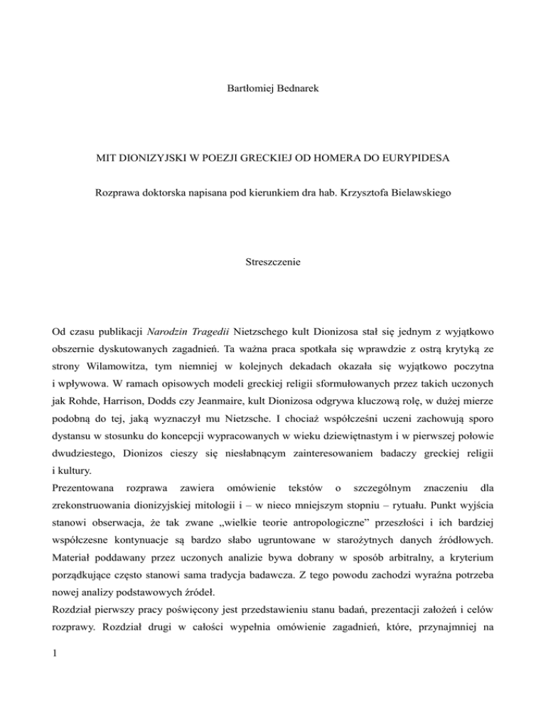 Bartłomiej Bednarek MIT DIONIZYJSKI W POEZJI GRECKIEJ OD HOMERA DO EURYPIDESA Rozprawa doktorska napisana pod kierunkiem dra hab. Krzysztofa Bielawskiego Streszczenie Od czasu publikacji Narodzin Tragedii Nietzschego kult Dionizosa stał się jednym z wyjątkowo obszernie dyskutowanych zagadnień. Ta ważna praca spotkała się wprawdzie z ostrą krytyką ze strony Wilamowitza, tym niemniej w kolejnych dekadach okazała się wyjątkowo poczytna i wpływowa. W ramach opisowych modeli greckiej religii sformułowanych przez takich uczonych jak Rohde, Harrison, Dodds czy Jeanmaire, kult Dionizosa odgrywa kluczową rolę, w dużej mierze podobną do tej, jaką wyznaczył mu Nietzsche. I chociaż współcześni uczeni zachowują sporo dystansu w stosunku do koncepcji wypracowanych w wieku dziewiętnastym i w pierwszej połowie dwudziestego, Dionizos cieszy się niesłabnącym zainteresowaniem badaczy greckiej religii i kultury. Prezentowana rozprawa zawiera omówienie tekstów o szczególnym znaczeniu dla zrekonstruowania dionizyjskiej mitologii i – w nieco mniejszym stopniu – rytuału. Punkt wyjścia stanowi obserwacja, że tak zwane „wielkie teorie antropologiczne” przeszłości i ich bardziej współczesne kontynuacje są bardzo słabo ugruntowane w starożytnych danych źródłowych. Materiał poddawany przez uczonych analizie bywa dobrany w sposób arbitralny, a kryterium porządkujące często stanowi sama tradycja badawcza. Z tego powodu zachodzi wyraźna potrzeba nowej analizy podstawowych źródeł. Rozdział pierwszy pracy poświęcony jest przedstawieniu stanu badań, prezentacji założeń i celów rozprawy. Rozdział drugi w całości wypełnia omówienie zagadnień, które, przynajmniej na 1 pierwszy rzut oka, bardzo luźno wiążą się z mitologią. Zasadniczym celem jest przedstawienie kontekstu kultu Dionizosa, ze szczególnym uwzględnieniem tych jego aspektów, którym uczeni zainteresowani religią grecką często niesłusznie przypisują marginalne znaczenie. Znajdujące się na pograniczu pomiędzy rytuałem świeckim i religijnym obyczaje związane z piciem wina stały się w ostatnich latach przedmiotem intensywnych badań tym niemniej poświęcone im prace wywierają umiarkowany wpływ na uczonych zainteresowanych kultem i mitologią Dionizosa. Być może jest tak dlatego, że od czasów Nietzschego nauka skupia się na innych aspektach tego boga, jego związki z winem albo negując, albo traktując jako mało istotne. Omawianie mitologii dionizyjskiej wydaje się jednak niemożliwe bez zwrócenia uwagi na centralną rolę, jaką spożywanie trunku i zabawa odgrywały w życiu starożytnych Greków. Stąd potrzeba poświęcenia całego rozdziału omówieniu karnawałowych form kultu boga – w pierwszej kolejności komedii starej, a następnie analizowanemu w analogicznych terminach sympozjonowi. W dwóch kolejnych, obszerniejszych rozdziałach rozprawy omówiono teksty poetyckie zawierające narracje mitologiczne o Dionizosie mieszczące się w ramach chronologicznych wyznaczonych przez jego pierwsze pojawienie się w tradycji literackiej w Iliadzie i powstanie najważniejszego poświęconego bogu utworu w literaturze okresu klasycznego, Bakchantek Eurypidesa. Tragedia ta, ze względu na swoje rozmiary, wartość literacką i niepokojącą niejednoznaczność doczekała się ogromnej ilości interesujących, a przy tym sprzecznych interpretacji. Tym niemniej każde z odczytań dramatu zmierzających do uchwycenia jego religijnej zawartości można określić jako pozytywistyczne. Zasadnicza różnica pomiędzy bardziej tradycyjnymi i nowocześniejszymi opracowaniami sprowadza się do faktu, że te pierwsze traktują utwór literacki jako rodzaj zniekształconego zapisu historycznych wydarzeń, które doprowadziły do ustanowienia kultu Dionizosa, podczas gdy te ostatnie skupiają się raczej na rytuale, który ma leżeć u podstaw narracji. Oba modele podejścia ignorują fakt, że tragedia jest przede wszystkim dziełem sztuki. Wprawdzie opowiada ona mityczną historię, na której kształt mogły wpłynąć formy rzeczywistego kultu, tym niemniej jej funkcja w prymarnym kontekście społecznym swego powstania z całą pewnością nie ograniczała się do przekładu performance rytualnego na teatralne. Z tego powodu analiza tragedii powinna za punkt wyjścia przyjąć próbę rekonstrukcji jej znaczenia w chwili jej wystawienia z uwzględnieniem sensów percypowanych przez pierwotną publiczność. Procedura taka zaczyna się od ustalenia, co w fabule Eurypidesa przynależy do starszej tradycji, a co stanowi efekt jego własnej inwencji. Wprawdzie niewiele wiemy na temat wcześniejszych wersji mitu Penteusza, tym niemniej nieco informacji można zaczerpnąć z dawniejszych, fragmentarycznie zachowanych tekstów i, co ważniejsze, z ikonografii. Ten sam typ źródeł pozwala na rekonstrukcję figury menady, jej tradycyjnej charakterystyki i funkcji w obrębie imaginarium 2 kolektywnego. Warto w tym miejscu zaznaczyć, że w świetle zebranych danych ujęcie Eurypidesa jawi się jako wysoce innowacyjne. Prawdopodobnie bowiem był to pierwszy poeta, który przedstawił menady jako – w specyficznym znaczeniu i do pewnego stopnia – trzeźwe, opanowane i cnotliwe. W ramach bardziej tradycyjnego ujęcia, te owładnięte przez bóstwo kobiety oddawały się wszelkim występnym rozkoszom, którym uleganie męska fantazja przypisywała kobietom. Na ten fakt nie zwraca uwagi zdecydowana większość uczonych, którzy przyjmują, że kilka wersów Bakchantek Eurypidesa, w których posłaniec stwierdza, że menady nie były pijane, stanowi wierne odbicie rzeczywistości rytualnej. Analiza danych ikonograficznych pozwala uchwycić męskie stereotypy na temat płci przeciwnej i prześledzić rozwój tych idei a przestrzeni V w. p.n.e. Na tym tle figura menady, której obraz przekazuje poezja i sztuka, rysuje się jako produkt czystej fantazji mężczyzn na temat kobie