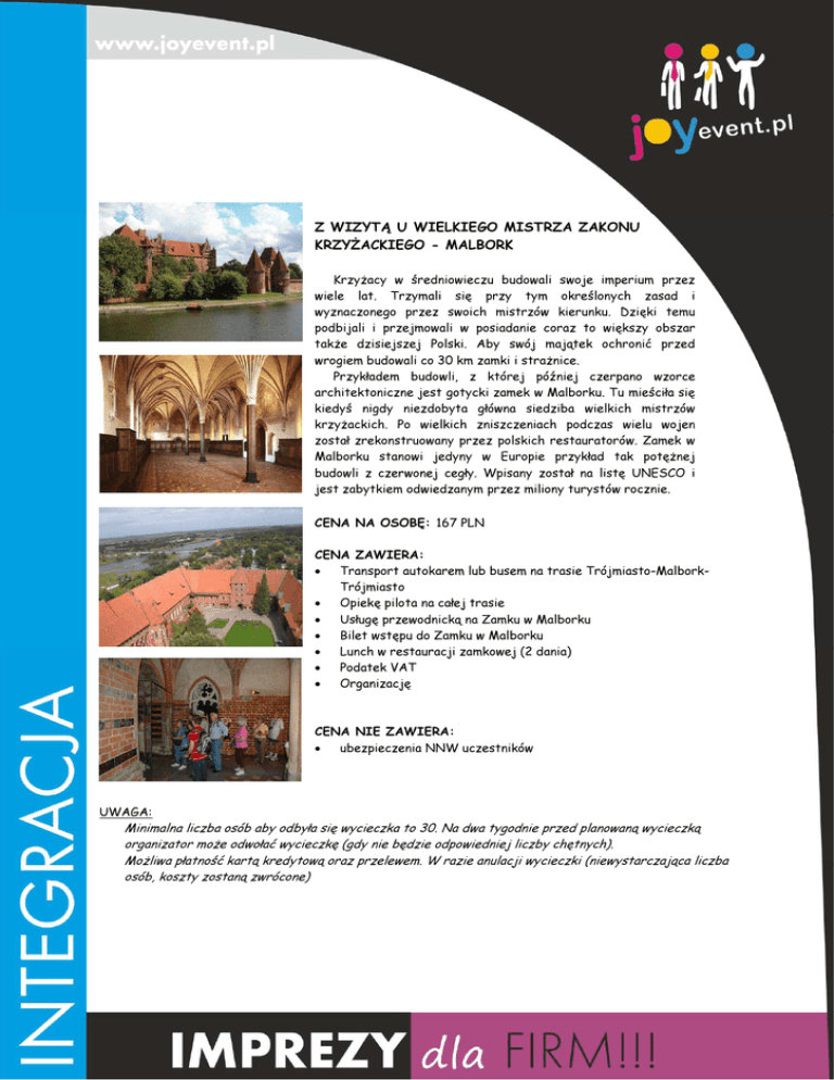 Z WIZYTĄ U WIELKIEGO MISTRZA ZAKONU KRZYŻACKIEGO - MALBORK Krzyżacy w średniowieczu budowali swoje imperium przez wiele lat. Trzymali się przy tym określonych zasad i wyznaczonego przez swoich mistrzów kierunku. Dzięki temu podbijali i przejmowali w posiadanie coraz to większy obszar także dzisiejszej Polski. Aby swój majątek ochronić przed wrogiem budowali co 30 km zamki i strażnice. Przykładem budowli, z której później czerpano wzorce architektoniczne jest gotycki zamek w Malborku. Tu mieściła się kiedyś nigdy niezdobyta główna siedziba wielkich mistrzów krzyżackich. Po wielkich zniszczeniach podczas wielu wojen został zrekonstruowany przez polskich restauratorów. Zamek w Malborku stanowi jedyny w Europie przykład tak potężnej budowli z czerwonej cegły. Wpisany został na listę UNESCO i jest zabytkiem odwiedzanym przez miliony turystów rocznie. CENA NA OSOBĘ: 167 PLN CENA ZAWIERA: • Transport autokarem lub busem na trasie Trójmiasto-MalborkTrójmiasto • Opiekę pilota na całej trasie • Usługę przewodnicką na Zamku w Malborku • Bilet wstępu do Zamku w Malborku • Lunch w restauracji zamkowej (2 dania) • Podatek VAT • Organizację CENA NIE ZAWIERA: • ubezpieczenia NNW uczestników UWAGA: Minimalna liczba osób aby odbyła się wycieczka to 30. Na dwa tygodnie przed planowaną wycieczką organizator może odwołać wycieczkę (gdy nie będzie odpowiedniej liczby chętnych). Możliwa płatność kartą kredytową oraz przelewem. W razie anulacji wycieczki (niewystarczająca liczba osób, koszty zostaną zwrócone)