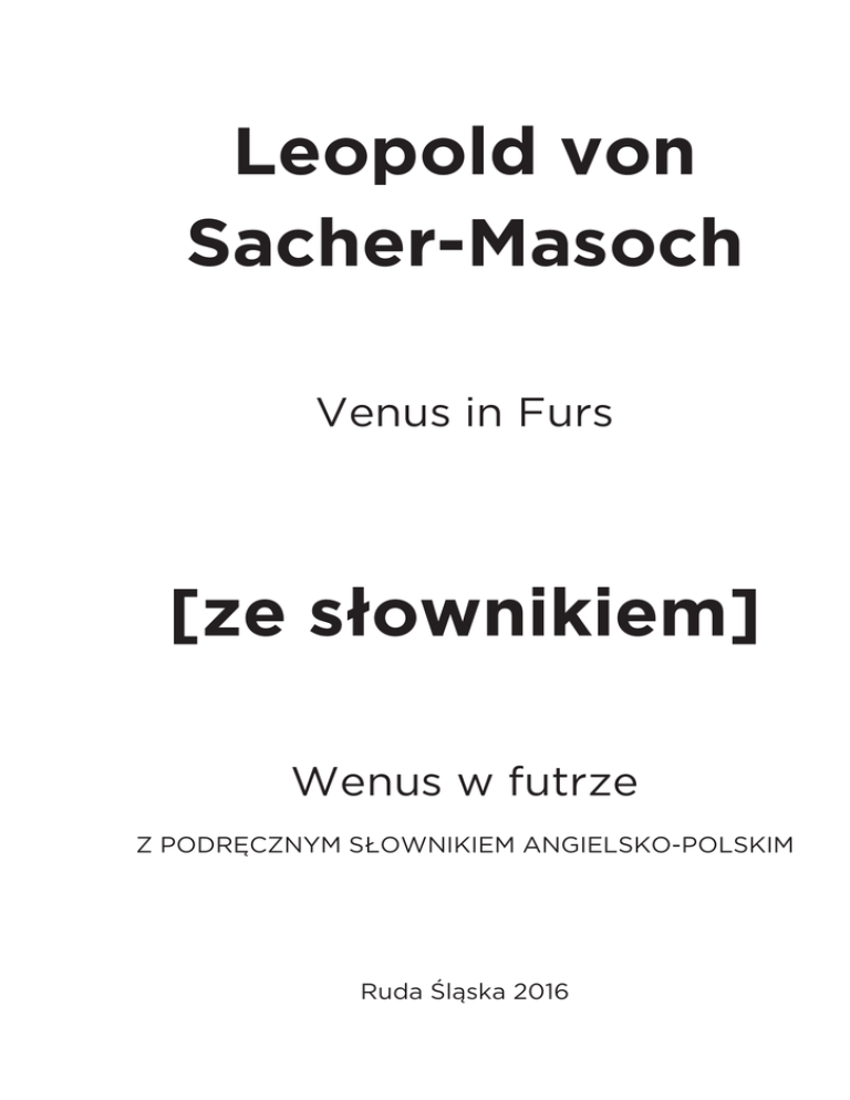 Leopold von Sacher-Masoch Venus in Furs [ze słownikiem] Wenus w futrze Z PODRĘCZNYM SŁOWNIKIEM ANGIELSKO-POLSKIM Ruda Śląska 2016 CONTENTS Vocabulary of Most Common Words...................................................................................... 7 Introduction ........................................................................................................................................ 29 Venus in Furs ..................................................................................................................................... 35 Vocabulary.......................................................................................................................................... 217 VENUS IN FURS "But the Almighty Lord hath struck him, and hath delivered him into the hands of a woman." —The Vulgate, Judith, xvi. 7. My company was charming. Opposite me by the massive Renaissance fireplace sat Venus; she was not a casual woman of the half-world, who under this pseudonym wages war against the enemy sex, like Mademoiselle Cleopatra, but the real, true goddess of love. She sat in an armchair and had kindled a crackling fire, whose reflection ran in red flames over her pale face with its white eyes, and from time to time over her feet when she sought to warm them. Her head was wonderful in spite of the dead stony eyes; it was all I could see of her. She had wrapped her marble-like body in a huge fur, and rolled herself up trembling like a cat. "I don't understand it," I exclaimed, "It isn't really cold any longer. For two weeks past we have had perfect spring weather. You must be nervous." "Much obliged for your spring," she replied with a low stony voice, and immediately afterwards sneezed divinely, twice in succession. "I really can't stand it here much longer, and I am beginning to understand—" "What, dear lady?" almighty - ZV]HFKPRJĊF\ SRWęůQ\ armchair - fotel casual - VZRERGQ\SRXIDâ\ QLHGEDâ\FRG]LQQ\SU]\MHPQ\ charming - FKDUP]DXURF]\ý RF]DURZDýXURF]\ crackling - FUDFNOH]DV]HOHœFLý WU]HV]F]HýV]HOHVWWU]DVN skwierczenie, trzaskanie delivered - (deliverGRVWDUF]\ý GRUęF]\ý divinely - od lub przez Boga, bosko don - (don't) do not exclaimed - (exclaim) Z\NU]\NQĊý fireplace - kominek flames - IODPHSâRPLHľ fur - futro, futerko; futrzany; z goddess - bogini hath - KDYHPLHýPDGDZQD forma) kindled - NLQGOH]DSDOLý UR]SDOLý Mademoiselle - (franc.) panienka marble - PDUPXUU]HŭED] marmuru obliged - REOLJH]RERZLĊ]Dý ]RERZLĊ]\ZDý]RERZLĊ]DQ\ reflection - odbicie, zaduma, zastanowienie renaissance - renesans, the Renaissance Odrodzenie, Renesans rolled - UROOVNUęFDý]ZLMDý VSâ\ZDýUROOHGRYHU- SU]HZUDFDý VLę]ERNXQDERN sneezed - VQHH]HNLFKQĊý stony - kamienisty, kamienny succession - dziedziczenie, VXNFHVMDFLĊJV]HUHJVHULD trembling - WUHPEOHGUůHý WU]ĊœýVLęGUůHQLH Vulgate - Wulgata wrapped - ZUDS]DZLQĊý RZLQĊýRZLQLęW\ abundant - REILW\OLF]Q\EXMQ\ awfully - strasznie, bardzo costume - kostium curls - FXUO]DNUęFLý]ZLQĊý NUęFLýVLęRZLMDýZ\G\PDý ZDUJLXVWDORNNâĊE divinity - EyVWZRERVNRœý teologia docile - SRWXOQ\XOHJâ\ faithfulness - ZLHUQRœý flaring - IODUHEâ\VNEODVN zaczerwienienie skóry German - Niemiec; niemiecki Germanic - JHUPDľVNL grace - SRSDœýZQLHâDVNę R]GRELý]GRELýJUDFMDZG]LęN OHNNRœýâDVND haven - SU]\VWDľSRUWKDYHQ't skrót od "have not"- QLHPLHý inimitable - niezrównany madame - pani outline - zarys, szkic pallor - EODGRœý recognized - (recognise) UR]SR]QDýUR]SR]QDZDýX]QDQ\ autoryzowany serene - EâRJLSRJRGQ\ EH]FKPXUQ\VSRNRMQ\ shrugged - (shrug) wzruszenie UDPLRQZ]UXV]\ý squirrel - wiewiórka taught - WHDFKQDXF]DýVHOItaught - samouk unbelievable - niewiarygodny understandable - ]UR]XPLDâ\ ungrateful - QLHZG]LęF]Q\ velvet - aksamit; aksamitny violet - ILRâHNILROHWILRâNRZ\ virtue - cnota, zaleta worship - ZLHOELýF]FLýNXOW "I am beginning to believe the unbelievable and to understand the un-understandable. All of a sudden I understand the Germanic virtue of woman, and German philosophy, and I am no longer surprised that you of the North do not know how to love, haven't even an idea of what love is." "But, madame," I replied flaring up, "I surely haven't given you any reason." "Oh, you—" The divinity sneezed for the third time, and shrugged her shoulders with inimitable grace. "That's why I have always been nice to you, and even come to see you now and then, although I catch a cold every time, in spite of all my furs. Do you remember the first time we met?" "How could I forget it," I said. "You wore your abundant hair in brown curls, and you had brown eyes and a red mouth, but I recognized you immediately by the outline of your face and its marble-like pallor—you always wore a violet-blue velvet MDFNet edged with squirrel-skin." "You were really in love with the costume, and awfully docile." "You have taught me what love is. Your serene form of worship let me forget two thousand years." "And my faithfulness to you was without equal!" "Well, as far as faithfulness goes—" "Ungrateful!" "I will not reproach you with anything. You are a divine woman, but nevertheless a woman, and like every woman cruel in love." "What you call cruel," the goddess of love replied eagerly, "is simply the element of passion and of natural love, which is woman's nature and makes her give herself where she loves, and makes her love everything, that pleases her." "Can there be any greater cruelty for a lover than the unfaithfulness of the woman he loves?" "Indeed!" she replied. "We are faithful as long as we love, but you demand faithfulness of a woman without love, and the giving of herself without enjoyment. Who is cruel there— woman or man? You of the North in general take love too soberly and seriously. You talk of duties where there should be only a question of pleasure." "That is why our emotions are honorable and virtuous, and our relations permanent." "And yet a restless, always unsatisfied craving f