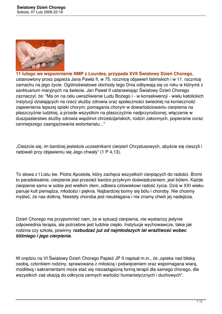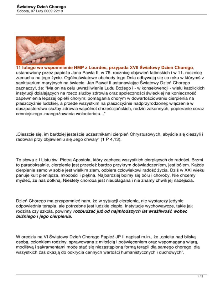 Światowy Dzień Chorego Sobota, 07 Luty 2009 22:19 11 lutego we wspomnienie NMP z Lourdes, przypada XVII Światowy Dzień Chorego, ustanowiony przez papieża Jana Pawła II, w 75. rocznicę objawień fatimskich i w 11. rocznicę zamachu na jego życie. Ogólnoświatowe obchody tego Dnia odbywają się co roku w którymś z sanktuarium maryjnych na świecie. Jan Paweł II ustanawiając Światowy Dzień Chorego zaznaczył, że: "Ma on na celu uwrażliwienie Ludu Bożego i - w konsekwencji - wielu katolickich instytucji działających na rzecz służby zdrowia oraz społeczności świeckiej na konieczność zapewnienia lepszej opieki chorym; pomagania chorym w dowartościowaniu cierpienia na płaszczyźnie ludzkiej, a przede wszystkim na płaszczyźnie nadprzyrodzonej; włączenie w duszpasterstwo służby zdrowia wspólnot chrześcijańskich, rodzin zakonnych, popieranie coraz cenniejszego zaangażowania wolontariatu..." „Cieszcie się, im bardziej jesteście uczestnikami cierpień Chrystusowych, abyście się cieszyli i radowali przy objawieniu się Jego chwały” (1 P 4,13). To słowa z I Listu św. Piotra Apostoła, który zachęca wszystkich cierpiących do radości. Brzmi to paradoksalnie, cierpienie jest przecież bardzo przykrym doświadczeniem, jest bólem. Każde cierpienie samo w sobie jest wielkim złem, odbiera człowiekowi radość życia. Dziś w XXI wieku panuje kult pieniądza, młodości i piękna. Najbardziej boimy się bólu i choroby. Nie chcemy myśleć, że nas dotkną. Niestety choroba jest nieubłagana i nie znamy chwili jej nadejścia. Dzień Chorego ma przypomnieć nam, że w sytuacji cierpienia, nie wystarczy jedynie odpowiednia terapia, ale potrzebne jest ludzkie ciepło. Instytucje wychowawcze, takie jak rodzina czy szkoła, powinny rozbudzać już od najmłodszych lat wrażliwość wobec bliźniego i jego cierpienia. W orędziu na VI Światowy Dzień Chorego Papież JP II napisał m.in., że „opieka nad bliską osobą, członkiem rodziny, sprawowana z miłością i poświęceniem oraz wspomagana wiarą, modlitwą i sakramentami może stać się niezastąpioną formą terapii dla samego chorego, dla wszystkich zaś okazją do odkrycia cennych wartości humanistycznych i duchowych”. 1/2 Światowy Dzień Chorego Sobota, 07 Luty 2009 22:19 Ten Dzień napomina nas, abyśmy z miłością pochylali się nad tymi, którzy cierpią. Dzień Chorego jest także okazją do wyrażenia uznania i wdzięczności tym osobom, które z wielkim oddaniem i troską zajmują się pacjentami, którzy bezinteresownie stają codziennie przy łóżku chorego, aby służyć mu swoim czasem i umiejętnościami. Ogromna większość tych ludzi nie bacząc na zły i trudny stan naszej rodzimej służby zdrowia jest obecna przy cierpiących codziennie i robi wszystko, aby ludzi leczyć zgodnie z przysięgą Hipokratesa. Mówiąc o Światowym Dniu Chorych można zacytować słowa jednego z największych sportowców XX wieku - kolarza Lance’a Armstronga. Człowiek ten doskonale wie, czym jest ból, cierpienie i straszliwa choroba oraz to, co najbardziej liczy się w życiu. W swojej pierwszej książce pt. „Lance Armstrong: mój powrót do życia - nie tylko o kolarstwie” napisał: „Nie miałem pojęcia, gdzie przebiega granica między wiarą, religią i nauką. Wiedziałem tylko jedno: trzeba w coś wierzyć, chociażby dla zasady i dla dobrego samopoczucia. Trzeba wierzyć nawet wówczas, gdy znajdziesz się w beznadziejnej sytuacji, w której wszystko jest przeciwko tobie, a katastrofa wydaje się nieunikniona. Bo co nam pozostaje? Uświadomiłem sobie, że należy tę wiarę umacniać codziennie. Jesteśmy silniejsi, niż nam się wydaje, a wiara to jedna z najcenniejszych, najwartościowszych i najżywotniejszych cech człowieka. Wiara - w sytuacji, kiedy wiemy, że nic nie jest w stanie przedłużyć naszego krótkiego życia i nie ma lekarstwa na naszą śmiertelność – to akt odwagi.” Luiza, film: "Lourdes, miejsce nadziei" 2/2