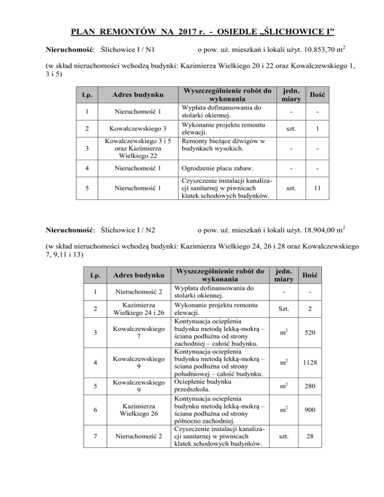 PLAN REMONTÓW NA 2017 r. - OSIEDLE „ŚLICHOWICE I” Nieruchomość: Ślichowice I / N1 o pow. uż. mieszkań i lokali użyt. 10.853,70 m2 (w skład nieruchomości wchodzą budynki: Kazimierza Wielkiego 20 i 22 oraz Kowalczewskiego 1, 3 i 5) Wyszczególnienie robót do wykonania Lp. Adres budynku 1 Nieruchomość 1 2 Kowalczewskiego 3 3 Kowalczewskiego 3 i 5 oraz Kazimierza Wielkiego 22 4 Nieruchomość 1 Ogrodzenie placu zabaw. 5 Nieruchomość 1 Czyszczenie instalacji kanalizacji sanitarnej w piwnicach klatek schodowych budynków. Nieruchomość: Ślichowice I / N2 jedn. miary Ilość - - szt. 1 - - - - szt. 11 Wypłata dofinansowania do stolarki okiennej. Wykonanie projektu remontu elewacji. Remonty bieżące dźwigów w budynkach wysokich. o pow. uż. mieszkań i lokali użyt. 18.904,00 m2 (w skład nieruchomości wchodzą budynki: Kazimierza Wielkiego 24, 26 i 28 oraz Kowalczewskiego 7, 9,11 i 13) Lp. Adres budynku 1 Nieruchomość 2 2 Kazimierza Wielkiego 24 i 26 3 Kowalczewskiego 7 4 Kowalczewskiego 9 5 Kowalczewskiego 9 6 Kazimierza Wielkiego 26 7 Nieruchomość 2 Wyszczególnienie robót do wykonania Wypłata dofinansowania do stolarki okiennej. Wykonanie projektu remontu elewacji. Kontynuacja ocieplenia budynku metodą lekką-mokrą – ściana podłużna od strony zachodniej – całość budynku. Kontynuacja ocieplenia budynku metodą lekką-mokrą – ściana podłużna od strony południowej – całość budynku. Ocieplenie budynku przedszkola. Kontynuacja ocieplenia budynku metodą lekką-mokrą – ściana podłużna od strony północno zachodniej. Czyszczenie instalacji kanalizacji sanitarnej w piwnicach klatek schodowych budynków. jedn. miary Ilość - - Szt. 2 m2 520 m2 1128 m2 280 m2 900 szt. 28 Nieruchomość: Ślichowice I / N3 o pow. uż. mieszkań i lokali użyt. 22.331,90 m2 (w skład nieruchomości wchodzą budynki: Kowalczewskiego 2, 4, 6, 8 i 10 oraz Puscha 3 i 23) Lp. 1 2 3 4 5 6 7 8 Adres budynku Wyszczególnienie robót do wykonania Wypłata dofinansowania do stolarki okiennej. Kowalczewskiego 10 i Wykonanie projektu remontu Puscha 23 elewacji. Kontynuacja ocieplenia metodą lekką-mokrą – ściany podłużne północno zachodnia i północno Kowalczewskiego 8 wschodnia oraz od strony południowo zachodniej – całość budynku. Montaż w wymiennikowni W-3 urządzenia zapobiegającego Nieruchomość 3 odkładaniu się kamienia kotło-wego na sieci centralnej ciepłej wody. Przeliczenie kryzowania sieci centralnej ciepłej wody w budyNieruchomość 3 nkach zasilanych z wymiennikowni W-3 – sporządzenie dokumentacji. Usunięcie kamienia kotłowego z sieci centralnej ciepłej wody w Nieruchomość 3 budynkach zasilanych z wymiennikowni W-3. Nieruchomość 3 Nieruchomość 3 Doposażenie placu zabaw. Nieruchomość 3 Czyszczenie instalacji kanaliza-cji sanitarnej w piwnicach klatek schodowych budynków. jedn. miary Ilość - - szt. 2 m2 2115 Szt. 1 Szt. 1 Szt. 1 - - szt. 31 o pow. uż. mieszkań i lokali użyt. 13.447,30 m2 Nieruchomość: Ślichowice I / N4 (w skład nieruchomości wchodzą budynki: Puscha 7, 13, 15, 17, 19 i 21) Lp. Adres budynku 1 Nieruchomość 4 2 Puscha 7 3 Puscha 21 4 Puscha 7 5 Nieruchomość 4 Nieruchomość: Ślichowice I / N5 Wyszczególnienie robót do wykonania jedn. miary Ilość - - szt. 1 m2 2102 szt. 1 szt. 19 Wypłata dofinansowania do stolarki okiennej. Wykonanie projektu remontu elewacji. Kontynuacja ocieplenia metodą lekką-mokrą – ściany podłużne od strony północno wschodniej i południowo zachodniej – całość budynku. Remont altany śmietnikowej – przebudowa. Czyszczenie instalacji kanalizacji sanitarnej w piwnicach klatek schodowych budynków. o pow. uż. mieszkań i lokali użyt. 10.912,30 m2 (w skład nieruchomości wchodzą budynki: Kazimierza Wielkiego 27 i 29 oraz Massalskiego 4, 6 i 8) Lp. Adres budynku Wyszczególnienie robót do wykonania jedn. miary Ilość 1 Nieruchomość 5 Wypłata dofinansowania do stolarki okiennej. - - 2 Massalskiego 6 i 8 Wykonanie projektu remontu elewacji. szt. 2 m2 1440 m2 280 15 Kontynuacja ocieplenia metodą lekkąmokrą − ściany podłużne od strony wschodniej i południowej – całość budynku. Ocieplenie budynku Klubu Domatorek. 3 Massalskiego 4 4 Massalskiego 4 5 Nieruchomość 5 Czyszczenie instalacji kanalizacji sanitarnej w piwnicach klatek schodowych budynków. szt. 6 Nieruchomość 5 Doposażenie placu zabaw. - o pow. uż. mieszkań i lokali użyt. 26.801,65 m2 o pow. garaży 142,10 m2 (w skład nieruchomości wchodzą budynki: Massalskiego 10, 12, 14, 16, 18 i 20 oraz Dewońska 1, 3, 5, 7 i 9) Wyszczególnienie robót do jedn. Lp. Adres budynku Ilość wykonania miary Nieruchomość: Ślichowice I / N6 1 Nieruchomość 6 2 Dewońska 7 i 9 3 Massalskiego 16 4 Massalskiego 20 5 Massalskiego 18 Wypłata dofinansowania do stolarki okiennej. Wykonanie projektu remontu elewacji. Kontynuacja ocieplenia metodą lekką-mokrą – ściana podłużna od strony południowo wschodniej – całość budynku. Kontynuacja ocieplenia metodą lekką-mokrą − ściany podłużne od strony północno i południowo zachodniej oraz południowo i północno wschodniej – całość budynku. Docieplenie budynku lokalu użytkowego. 6 Nieruchomość 6 Doposażenie placu zabaw. 7 Nieruchomość 6 Czyszczenie instalacji kanalizacji sanitarnej w piwnicach klatek schodowych budynków. Nieruchomość: Ślichowice I / N7 - - szt. 2 m2 463 m2 3147 m2 205 - - szt. 38 o pow. uż. mieszkań i lokali użyt. 18.629,30 m2 (w skład nieruchomości wchodzą budynki: Dewońska 11, 13, 15, 17, 19 oraz Massalskiego 24, 26, 28) Lp. Adres budynku 1 Nieruchomość 7 2 Dewońska 15 3 Dewońska 17 4 Nieruchomość 7 5 Nieruchomość 7 Wyszczególnienie robót do wykonania Wypłata dofinansowania do stolarki okiennej. Kontynuacja ocieplenia metodą lekką-mokrą − ściany podłużne od strony północno zachodniej, północno wschodniej i południowo wschodniej. Kontynuacja ocieplenia meto