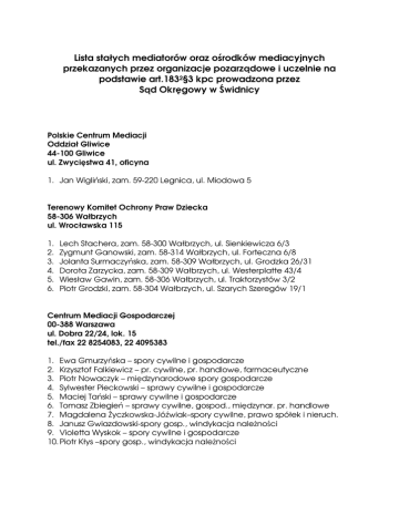 Lista stałych mediatorów oraz ośrodków mediacyjnych przekazanych przez organizacje pozarządowe i uczelnie na podstawie art.1832§3 kpc prowadzona przez Sąd Okręgowy w Świdnicy Polskie Centrum Mediacji Oddział Gliwice 44-100 Gliwice ul. Zwycięstwa 41, oficyna 1. Jan Wigliński, zam. 59-220 Legnica, ul. Miodowa 5 Terenowy Komitet Ochrony Praw Dziecka 58-306 Wałbrzych ul. Wrocławska 115 1. 2. 3. 4. 5. 6. Lech Stachera, zam. 58-300 Wałbrzych, ul. Sienkiewicza 6/3 Zygmunt Ganowski, zam. 58-314 Wałbrzych, ul. Forteczna 6/8 Jolanta Surmaczyńska, zam. 58-309 Wałbrzych, ul. Grodzka 26/31 Dorota Zarzycka, zam. 58-309 Wałbrzych, ul. Westerplatte 43/4 Wiesław Gawin, zam. 58-306 Wałbrzych, ul. Traktorzystów 3/2 Piotr Grodzki, zam. 58-304 Wałbrzych, ul. Szarych Szeregów 19/1 Centrum Mediacji Gospodarczej 00-388 Warszawa ul. Dobra 22/24, lok. 15 tel./fax 22 8254083, 22 4095383 1. Ewa Gmurzyńska – spory cywilne i gospodarcze 2. Krzysztof Falkiewicz – pr. cywilne, pr. handlowe, farmaceutyczne 3. Piotr Nowaczyk – międzynarodowe spory gospodarcze 4. Sylwester Pieckowski – sprawy cywilne i gospodarcze 5. Maciej Tański – sprawy cywilne i gospodarcze 6. Tomasz Zbiegień – sprawy cywilne, gospod., międzynar. pr. handlowe 7. Magdalena śyczkowska-Jóźwiak–spory cywilne, prawo spółek i nieruch. 8. Janusz Gwiazdowski-spory gosp., windykacja naleŜności 9. Violetta Wyskok – spory cywilne i gospodarcze 10. Piotr Kłys –spory gosp., windykacja naleŜności Polskie Stowarzyszenie Mediacji Gospodarczej 65-950 Zielona Góra Pl. Słowiański 15 tel. 68 329 79 79 1. Magdalena Cetera, zam. 50-521 Wrocław, ul. Wesoła 39/15 2. Edward Wąsiewicz, zam. 52-203 Wrocław, ul. S. Starzyńskiego 43 Międzynarodowy Instytut Koncyliacji i ArbitraŜu 54-613 Wrocław ul. Krzemieniecka 60 A tel. 71 795 46 00 1. Zygmunt Brodziak 2. Ewa CiąŜkowska 3. Jacek Fischer 4. Kamila Gondek 5. Andrzej Jasiński 6. Teresa Kalisz 7. Alicja Kral 8. Irena Legan 9. Jerzy Legan 10. Małgorzata Lenart 11. Magdalena Łabaj 12. Waldemar Łysakowski 13. GraŜyna Marek 14. Zbigniew Michałowski 15. Jerzy Pałys 16. Stanisław Pikulski 17. Edward Pulit 18. Anna Maria Pulit 19. Wojciech Rojek 20. ElŜbieta Sałasznik 21. Kazimierz Sawicki 22. Jadwiga Toth Okręgowa Izba Radców Prawnych 58-300 Wałbrzych ul. Dmowskiego 20 tel. 074/842 68 76 1. Irena Brzozowska, zam. 57-300 Kłodzko, ul. Ogrodowa 4 tel. 604 499 783 2. Lidia Dziuba, zam. 57-402 Nowa Ruda, ul. Wojska Polskiego 18/II/3 tel. 604 612 427 3. Bogdan JeŜ, zam. 57-300 Kłodzko, ul. Okrzei 26 A/1/14 tel. 74 849 44 17 4. Małgorzata Matusz, zam. 57-402 Nowa Ruda, ul. Broniewskiego 33 tel. 74 872 03 46 5. Ewa Szwengler-Steckiewicz, zam. 58-302 Wałbrzych, ul. Reymonta 2/3 tel. 513 186 360 6. Małgorzata Walaszczyk-Borek, zam. 58-200 DzierŜoniów, ul. Daszyńskiego 16 tel.0604 471 653 Krajowy Sąd ArbitraŜowy 03-893 Warszawa ul. Bukowiecka 92 tel. 22-6793616 www.arbiter.org.pl [email protected] 1. 2. 3. 4. 5. Przemysław Adamus - prawo cywilne, gospodarcze, rodzinne (502262562) Tomasz Błotnicki – prawo cywilne,gospodarcze, rodzinne, pracy(667625655) Cyranowska Lidia-prawo cywilne, gospodarcze, rodzinne (694852388) Aleksiej Czepik – prawo cywilne, gospodarcze, rodzinne (608044733) Edyta Dorenbos- Holandia – prawo cywilne, gospodarcze, finansowe (0031641139961) 6. Tomasz Gałęzowski – prawo cywilne, gospodarcze, rodzinne (519198417) 7. Joanna Główka – prawo cywilne, gospodarcze, rodzinne, pracy (530856182) 8. Szymon Hatłas – prawo cywilne, gospodarcze (608159867) 9. Paweł Jagodziński – prawo cywilne, gospodarcze, rodzinne (601444283) 10. Piotr Janicki – USA – prawo cywilne, gospodarcze, rodzinne (0016462864948) 11. Marta Jastrzębska – prawo cywilne, gospodarcze (602254882) 12. Aleksandra Kaliszczak-Stępień – prawo cywilne, rodzinne (517900462) 13. Joanna Kamieńska – prawo cywilne, gospodarcze, rodzinne (606885885) 14. Jarosław Kamiński – prawo cywilne, gospodarcze, rodzinne, pracy (609652649) 15. Wioletta Kaźmierczak – prawo cywilne, gospodarcze, rodzinne, nieruchomości (601699317) 16. Michał Kluska – prawo cywilne, gospodarcze, rodzinne, pracy (662190844) 17. Anna Kowalska – prawo cywilne, gospodarcze, pracy (607224937) 18. Małgorzata Kucharska-Szydelska – prawo cywilne, gospodarcze, rodzinne (603794218) 19. Michał Lenarczyk – prawo cywilne, gospodarcze, rodzinne (508164678) 20. Tomasz Lenart – prawo cywilne, gospodarcze, pracy (604062174) 21. Małgorzata Magdziarczyk – prawo cywilne, gospodarcze, rodzinne (605730408) 22. Walentyna Nowak – prawo cywilne, gospodarcze, rodzinne (601302222) 23. Wojciech Ostrowski – prawo cywilne, gospodarcze, rodzinne (22-4389403) 24. Mariusz Paradowski- prawo cywilne, gospodarcze, rodzinne, pracy (530850118) 25. Natalia Petryszyn – prawo cywilne, gospodarcze, rodzinne (503167459) 26. Roman Pietrowski – prawo cywilne, gospodarcze (606320500) 27. Franciszka Pniewska – prawo cywilne, gospodarcze, rodzinne (502340344) 28. Stanisław Rachelski – prawo cywilne, gospodarcze (22-4389403) 29. Magdalena Radzik – prawo cywilne, gospodarcze, rodzinne (505455802) 30. Piotr Rola – prawo cywilne, gospodarcze, rodzinne (515797259) 31. Dobrosława Rozpędowska – prawo cywilne, gospodarcze, rodzinne (603379694) 32. Maja Sujkowska – prawo cywilne, gospodarcze (601262527) 33. Jan Szczepański – prawo cywilne, gospodarcze (500231503) 34. Tomasz Urbański – prawo cywilne, gospodarcze (691369143) 35. Maciej Wojcieski – prawo cywilne, gospodarcze, rodzinne (62-5031070) 36. BoŜena Wojtukiewicz –prawo cywilne, gospodarcze, rodzinne (506984234) 37. Agnieszka Zasikowska – prawo cywilne, gospodarcze, rodzinne (605674987) 38. Krystian Ziemski – prawo cywilne, gospodarcze, rodzinne (61-8662628) 39. Katarzyna Zych – prawo cywilne, gospodarcze, rodzinne (788674778) Ośrodek Negocjacji i Mediacji przy Fundacji Magnus 53-227 Wrocław ul. InŜynierska 72 A tel. 506 0