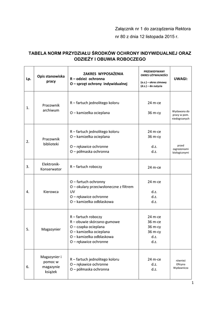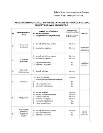 Załącznik nr 1 do zarządzenia Rektora nr 80 z dnia 12 listopada 2015 r. TABELA NORM PRZYDZIAŁU ŚRODKÓW OCHRONY INDYWIDUALNEJ ORAZ ODZIEŻY I OBUWIA ROBOCZEGO Lp. Opis stanowiska pracy 1. Pracownik archiwum 2. 3. 4. 5. 6. Pracownik biblioteki ElektronikKonserwator ZAKRES WYPOSAŻENIA R – odzież ochronna O – sprzęt ochrony indywidualnej PRZEWIDYWANY OKRES UŻYWALNOŚCI (o.z.) – okres zimowy (d.z.) – do zużycia R – fartuch jednolitego koloru 24 m-ce O – kamizelka ocieplana 36 m-cy R – fartuch jednolitego koloru O – kamizelka ocieplana 24 m-ce 36 m-cy O – rękawice ochronne O – półmaska ochronna d.z. d.z. R – fartuch roboczy 24 m-ce O – fartuch ochronny O – okulary przeciwsłoneczne z filtrem UV O – rękawice ochronne O – kamizelka odblaskowa 24 m-ce Magazynier R – fartuch roboczy R – obuwie skórzano-gumowe O – czapka ocieplana O – kamizelka ocieplana O – kamizelka odblaskowa O – rękawice ochronne 24 m-ce 36 m-ce 36 m-cy 36 m-cy d.z. d.z. Magazynier i pomoc w magazynie książek R – fartuch jednolitego koloru O – rękawice ochronne O – półmaska ochronna 24 m-ce d.z. d.z. Kierowca UWAGI: Wydawana do pracy w pom. niedogrzanych przed zagrożeniami biologicznymi d.z. d.z. d.z. również Oficyna Wydawnicza 1 7. 8. 9. 10. Pracownik inwentaryzacji R – fartuch roboczy O – kamizelka ocieplana R – kurtka ocieplana R – spodnie O – kurtka przeciwdeszczowa Inspektor nadzoru O – obuwie ochronne budowlanego O – kamizelka odblaskowa O – rękawice robocze O – kask ochronny (wg potrzeb) Obsługa pracowni kserograficznej Pracownik gospodarczy (i terenowy) 24 m-ce 48 m-cy 4 o.z. 36 m-cy 36 m-cy 24 m-ce d.z. d.z. wg ważności certyfikatu R – fartuch roboczy O – rękawice robocze 24 m-ce d.z. R – fartuch lub ubranie robocze 12 m-cy R – obuwie skórzano-gumowe R – obuwie gumowo-filcowe O – kurtka ocieplana O – kurtka przeciwdeszczowa O – czapka ocieplana O – okulary ochronne O – rękawice ochronne O – ochronniki słuchu 12 m-cy 3 o.z. 3 o.z. 4 o.z. d.z. d.z. d.z. d.z. O – kamizelka ocieplana 36 m-cy 11. Recepcjonistka 12. Teletechnik R – fartuch roboczy O – kurtka lub kamizelka ocieplana 24 m-ce 36 m-cy 13. Pracownik zaopatrzenia R – fartuch roboczy R – obuwie skórzano-gumowe O – kurtka ocieplana O – rękawice ochronne 24 m-ce 24 m-ce 36 m-cy d.z. 14. Woźna R – fartuch roboczy 12 m-cy Technik R – ubranie robocze lub kombinezon roboczy 12 m-cy 15. Dział Inwentaryzacji i Kontroli Majątku W czasie przebywania na budowie Na wniosek kierownika Przy koszeniu trawy Dział Zakupów 2 ogólnobudowlany O – nakrycie głowy (czapka z daszkiem) O – koszula flanelowa R – obuwie skórzano-gumowe z wzmocnionymi noskami O – kamizelka ocieplana O – kurtka ocieplana O – koszulka z krótkim rękawem (lato) R – rękawice robocze O – półmaska ochronna (wg potrzeb) O – ochronniki słuchu (wg potrzeb) O – okulary ochronne (wg potrzeb) O – szelki lub pas bezpieczeństwa (wg potrzeb) O – kask ochronny (wg potrzeb) O – okulary lub tarcza do spawania (wg potrzeb) O – rękawice do spawania wzmocnione (wg potrzeb) O – wkładki nakolannikowe (wg potrzeb) 16. 17. Elektryk R – ubranie robocze lub kombinezon roboczy O – nakrycie głowy(czapka z daszkiem) O – koszula flanelowa O – koszulka z krótkim rękawem(lato) R – obuwie skórzano-gumowe R – kalosze dielektryczne (wg potrzeb) O – kamizelka ocieplana O – kurtka ocieplana R – rękawice robocze O – okulary ochronne (wg potrzeb) O – rękawice dielektryczne O – półmaska ochronna (wg potrzeb) O – ochronniki słuchu (wg potrzeb) O – kask ochronny (wg potrzeb) R – ubranie robocze lub kombinezon roboczy O – nakrycie głowy(czapka z daszkiem) O – koszula flanelowa Hydraulik –Ślusarz O – koszulka z krótkim rękawem (lato) R – obuwie skórzano-gumowe R – kalosze gumowe wzmocnione O – kamizelka ocieplana O – kurtka ocieplana 24 m-ce 12 m-cy 24 m-ce 3 o.z. 3 o.z. 12 m-cy d.z. d.z. d.z. d.z. d.z. wg instrukcji wg ważności certyfikatu d.z. d.z. d.z. 24 m-ce 24 m-ce 12 m-cy 12 m-cy 24 m-ce 36 m-cy 3 o.z. 3 o.z. d.z. d.z. d.z. d.z. d.z. wg ważności certyfikatu 24 m-ce 24 m-ce 12 m-cy 12 m-cy 24 m-ce 36 m-cy 3 o.z. 3 o.z. 3 R – rękawice robocze O – rękawice gumowe wzmocnione O – okulary ochronne O – okulary lub tarcza do spawania (wg potrzeb) O – rękawice do spawania wzmocnione (wg potrzeb) O – ochronniki słuchu (wg potrzeb) 18. Stolarz R – ubranie robocze lub kombinezon roboczy O – nakrycie głowy(czapka z daszkiem) O – koszula flanelowa O – koszulka z krótkim rękawem (lato) R – obuwie skórzano-gumowe O – kamizelka ocieplana O – kurtka ocieplana R – rękawice robocze O – okulary ochronne (wg potrzeb) O – półmaska ochronna (wg potrzeb) d.z. d.z. d.z. d.z. d.z. d.z. 24 m-ce 24 m-ce 12 m-cy 12 m-cy 24 m-ce 3 o.z. 3 o.z. d.z. d.z. d.z. 4