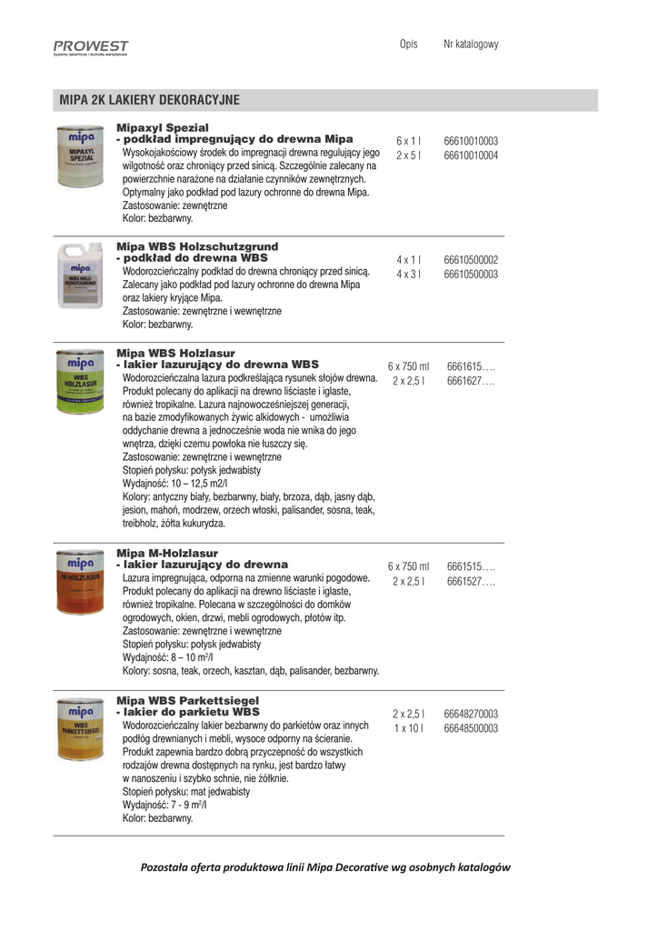 Opis Nr katalogowy 6x1l 2x5l 66610010003 66610010004 4x1l 4x3l 66610500002 66610500003 MIPA 2K LAKIERY DEKORACYJNE Mipaxyl Spezial - podkÝad impregnujÞcy do drewna Mipa WysokojakoĿciowy Ŀrodek do impregnacji drewna reguluj cy jego wilgotnoĿø oraz chroni cy przed sinic . Szczególnie zalecany na powierzchnie naraŞone na dzia¨anie czynników zewn¤trznych. Optymalny jako podk¨ad pod lazury ochronne do drewna Mipa. Zastosowanie: zewn¤trzne Kolor: bezbarwny. Mipa WBS Holzschutzgrund - podkÝad do drewna WBS WodorozcieĬczalny podk¨ad do drewna chroni cy przed sinic . Zalecany jako podk¨ad pod lazury ochronne do drewna Mipa oraz lakiery kryj ce Mipa. Zastosowanie: zewn¤trzne i wewn¤trzne Kolor: bezbarwny. Mipa WBS Holzlasur - lakier lazurujÞcy do drewna WBS 6 x 750 ml WodorozcieĬczalna lazura podkreĿlaj ca rysunek s¨ojów drewna. 2 x 2,5 l Produkt polecany do aplikacji na drewno liĿciaste i iglaste, równieŞ tropikalne. Lazura najnowoczeĿniejszej generacji, na bazie zmodyÞkowanych Şywic alkidowych - umoŞliwia oddychanie drewna a jednoczeĿnie woda nie wnika do jego wn¤trza, dzi¤ki czemu pow¨oka nie ¨uszczy si¤. Zastosowanie: zewn¤trzne i wewn¤trzne StopieĬ po¨ysku: po¨ysk jedwabisty WydajnoĿø: 10 – 12,5 m2/l Kolory: antyczny bia¨y, bezbarwny, bia¨y, brzoza, d b, jasny d b, jesion, mahoĬ, modrzew, orzech w¨oski, palisander, sosna, teak, treibholz, Şó¨ta kukurydza. Mipa M-Holzlasur - lakier lazurujÞcy do drewna 6 x 750 ml Lazura impregnuj ca, odporna na zmienne warunki pogodowe. 2 x 2,5 l Produkt polecany do aplikacji na drewno liĿciaste i iglaste, równieŞ tropikalne. Polecana w szczególnoĿci do domków ogrodowych, okien, drzwi, mebli ogrodowych, p¨otów itp. Zastosowanie: zewn¤trzne i wewn¤trzne StopieĬ po¨ysku: po¨ysk jedwabisty WydajnoĿø: 8 – 10 m2/l Kolory: sosna, teak, orzech, kasztan, d b, palisander, bezbarwny. Mipa WBS Parkettsiegel - lakier do parkietu WBS WodorozcieĬczalny lakier bezbarwny do parkietów oraz innych pod¨óg drewnianych i mebli, wysoce odporny na Ŀcieranie. Produkt zapewnia bardzo dobr przyczepnoĿø do wszystkich rodzajów drewna dost¤pnych na rynku, jest bardzo ¨atwy w nanoszeniu i szybko schnie, nie Şó¨knie. StopieĬ po¨ysku: mat jedwabisty WydajnoĿø: 7 - 9 m2/l Kolor: bezbarwny. 2 x 2,5 l 1 x 10 l 6661615…. 6661627…. 6661515…. 6661527…. 66648270003 66648500003 Pozostaųa oferta produktowa linii Mipa DecoraƟve wg osobnych katalogów