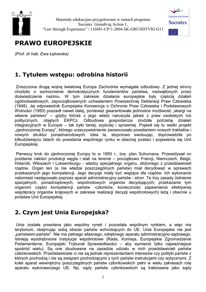 Materiały edukacyjne przygotowane w ramach programu Socrates Grundtvig Action 1, “Law through Experience” / 116881-CP-1-2004-SK-GRUNDTVIG-G11 PRAWO EUROPEJSKIE (Prof. dr hab. Ewa Łętowska) 1. Tytułem wstępu: odrobina historii Zniszczona drugą wojną światową Europa Zachodnia wymagała odbudowy. Z jednej strony chodziło o wzmocnienie demokratycznych fundamentów państwa, nadwątlonych przez doświadczenia nazimu. W tym zakresie działania europejskie były częścią działań ogólnoświatowych, zapoczątkowanych uchwaleniem Powszechnej Deklaracji Praw Człowieka (1948). Jej odpowiednik Europejska Konwencja o Ochronie Praw Człowieka i Podstawowych Wolności (1950) poszedł nawet dalej, poniewaŜ gwarantowała jednostce moŜliwość „skargi na własne państwo” – gdyby któraś z jego władz naruszyła jakieś z praw osobistych lub politycznych, objętych EKPCz. Odbudowa gospodarcza zrodziła potrzebę działań integracyjnych w Europie – tak było taniej, szybciej i sprawniej. Pojawił się tu wielki projekt „zjednoczonej Europy”, którego urzeczywistnienie zaowocowało powstaniem nowych traktatów i nowych struktur ponadnarodowych. Idea ta, stopniowo ewoluując, doprowadziła po kilkudziesięciu latach do powstania wspólnego rynku w obecnej postaci i pojawienia się Unii Europejskiej. Pierwszy krok do zjednoczonej Europy to w 1950 r., tzw. plan Schumana. Przewidywał on poddanie całości produkcji węgla i stali na terenie – początkowo Francji, Niemczech, Belgii, Holandii, Włoszech i Luksemburgu - władzy specjalnego organu, złoŜonego z przedstawicieli rządów. Organ ten (a nie władze poszczególnych państw) miał decydować w sprawach przekazanych jego kompetencji. Jego decyzje miały być wiąŜące dla rządów. Ich wykonanie natomiast następowało poprzez aparat administracyjny państw - stron. Te trzy zasady (istnienie specjalnych, ponadrządowych, wspólnotowych organów decydujących; przekazanie tym organom części kompetencji państw -członków, konieczność zapewnienia efektywnej współpracy organów krajowych w zakresie realizacji decyzji wspólnotowych) leŜą i obecnie u podstaw Unii Europejskiej. 2. Czym jest Unia Europejska? Unia została powołana jako wspólny rynek i pozostała wspólnym rynkiem, a więc ma terytorium, obejmując sobą obszar państw wchodzących do UE. Unia Europejska nie jest „państwem-państw”. Nie ma pełnego własnego, odrębnego aparatu administracyjno-sądowego. Istnieją wyodrębnione instytucje wspólnotowe (Rada, Komisja, Europejskie Zgromadzenie Parlamentarne, Europejski Trybunał Sprawiedliwości – aby wymienić tylko najwaŜniejsze spośród wielu). Są one zbudowane na zasadzie udziału w nich przedstawicieli państw członkowskich. Przedstawiciele ci nie są jednak reprezentantami interesów czy polityki państw z których pochodzą i nie są związani pochodzącymi z tych państw instrukcjami czy wytycznymi. Z kolei aparat wewnętrzny poszczególnych państw członkowskich pełni w wielu zakresach rolę aparatu wykonawczego UE. Np. sądy państw członkowskich są traktowane jako sądy 1 pierwszego szczebla dla spraw z zakresu prawa wspólnotowego, organy administracji gospodarczej są zobowiązane do realizacji prawa wspólnotowego. Tego ostatniego nie moŜna sprowadzić do umów międzynarodowych. Jest to złoŜony system obejmujący a) traktaty załoŜycielskie tworzące tzw. prawo pierwotne UE (por. niŜej) i b) prawo wytworzone przez same instytucje wspólnotowe (tzw. prawo wtórne wspólnotowe – por. niŜej ). Aby Unia Europejska mogła działać i nie padła przygnieciona swoją niemoŜnością potrzebne są trzy filary: (I) Wspólnota Europejska – a więc ponadrządowej współpracy państw członkowskich w sprawach gospodarczych. Ta najbardziej zintegrowana forma współpracy wytworzyła system instytucji i przepisów regulujących róŜne kwestie przede wszystkim gospodarcze; (II) Wspólna Polityka Zagraniczna i Bezpieczeństwa i (III) Współpraca w Dziedzinie Wymiaru Sprawiedliwości i Spraw Wewnętrznych. W zakresie II i III filaru współpraca poszczególnych państw członkowskich jest mniej zintegrowana, niŜ w zakresie I filaru. W ostatnich czasach widać, Ŝe konieczne jest zacieśnienie współpracy w zakresie III filaru, co powoduje pojawienie się nowych aktów prawnych w tym zakresie – np. Europejskiego Nakazu Aresztowania (upraszczającego procedury ekstradycyjne, co ułatwia ściganie przestępczości na terenie UE) czy rozporządzenia WE: Nr 44/2001 w sprawie jurysdykcji i uznawania orzeczeń sądowych oraz ich wykonywania w sprawach cywilnych i handlowych; rozporządzeniaNr 2201/2003 dotyczące jurysdykcji oraz uznawania i wykonania orzeczeń w sprawach małŜeńskich i odpowiedzialności rodzicielskiej. 3. Czy istniejąobywatele Uni Europejskiej? Nie ma nikogo, kto by był tylko obywatelem Unii Europejskiej bo nie ma takiego państwa ale obywatele państw członkowskich są zarazem obywatelami UE. Prawo wspólnotowe i działanie organów wspólnotowych nie mogą dyskryminować obywatela jakiegokolwiek państwa UE. O tyle, o ile prawo wspólnotowe dotyczy sytuacji jednostek – mogą one z tego prawa wyprowadzać dla siebie prawa, bezpośrednio zaskarŜalne do sądu. Obywatelstwo europejskie wiąŜe się z prawem swobodnego przemieszczania się i pobytu na terenie państw członkowskich (brak wiz), posiadaniem prawa wyborczego w wyborach do Parlamentu Europejskiego, prawem do opieki dyplomatycznej i konsularnej kaŜdego z państw członkowskich (gdy na jakimś terenie państwo macierzyste nie ma własnego przedstawicielstwa), prawo do składania petycji do Parlamentu Europejskiego i korzystania z opieki Europejskiego Rzecznika Praw Obywatelskich. W Unii wszyscy jesteśmy równi – ale po okresie przejściowym. Dlatego Polacy będą mogli pracować gdzie chcą, ale dopiero wtedy, gdy minie ten okres a Rumuni będą mogli pracować w Polsce po przystąpieni