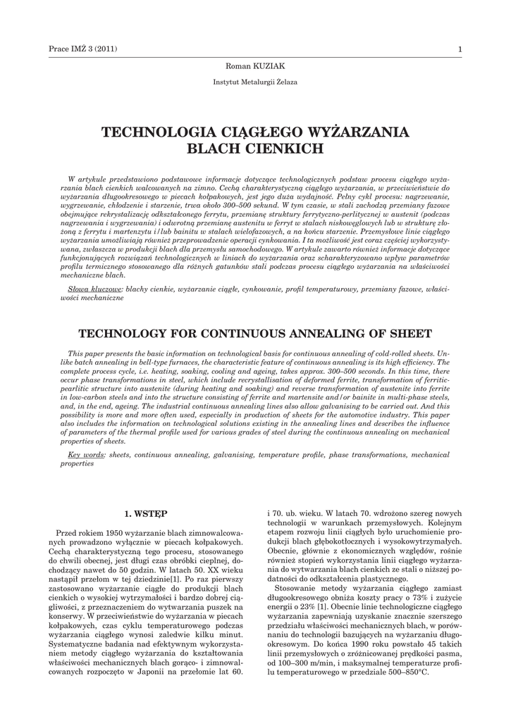 Prace IMŻ 3 (2011) 1 Roman KUZIAK Instytut Metalurgii Żelaza TECHNOLOGIA CIĄGŁEGO WYŻARZANIA BLACH CIENKICH W artykule przedstawiono podstawowe informacje dotyczące technologicznych podstaw procesu ciągłego wyżarzania blach cienkich walcowanych na zimno. Cechą charakterystyczną ciągłego wyżarzania, w przeciwieństwie do wyżarzania długookresowego w piecach kołpakowych, jest jego duża wydajność. Pełny cykl procesu: nagrzewanie, wygrzewanie, chłodzenie i starzenie, trwa około 300–500 sekund. W tym czasie, w stali zachodzą przemiany fazowe obejmujące rekrystalizację odkształconego ferrytu, przemianę struktury ferrytyczno-perlitycznej w austenit (podczas nagrzewania i wygrzewania) i odwrotną przemianę austenitu w ferryt w stalach niskowęglowych lub w strukturę złożoną z ferrytu i martenzytu i/lub bainitu w stalach wielofazowych, a na końcu starzenie. Przemysłowe linie ciągłego wyżarzania umożliwiają również przeprowadzenie operacji cynkowania. I ta możliwość jest coraz częściej wykorzystywana, zwłaszcza w produkcji blach dla przemysłu samochodowego. W artykule zawarto również informacje dotyczące funkcjonujących rozwiązań technologicznych w liniach do wyżarzania oraz scharakteryzowano wpływ parametrów profilu termicznego stosowanego dla różnych gatunków stali podczas procesu ciągłego wyżarzania na właściwości mechaniczne blach. Słowa kluczowe: blachy cienkie, wyżarzanie ciągłe, cynkowanie, profil temperaturowy, przemiany fazowe, właściwości mechaniczne TECHNOLOGY FOR CONTINUOUS ANNEALING OF SHEET This paper presents the basic information on technological basis for continuous annealing of cold-rolled sheets. Unlike batch annealing in bell-type furnaces, the characteristic feature of continuous annealing is its high efficiency. The complete process cycle, i.e. heating, soaking, cooling and ageing, takes approx. 300–500 seconds. In this time, there occur phase transformations in steel, which include recrystallisation of deformed ferrite, transformation of ferriticpearlitic structure into austenite (during heating and soaking) and reverse transformation of austenite into ferrite in low-carbon steels and into the structure consisting of ferrite and martensite and/or bainite in multi-phase steels, and, in the end, ageing. The industrial continuous annealing lines also allow galvanising to be carried out. And this possibility is more and more often used, especially in production of sheets for the automotive industry. This paper also includes the information on technological solutions existing in the annealing lines and describes the influence of parameters of the thermal profile used for various grades of steel during the continuous annealing on mechanical properties of sheets. Key words: sheets, continuous annealing, galvanising, temperature profile, phase transformations, mechanical properties 1. WSTĘP Przed rokiem 1950 wyżarzanie blach zimnowalcowanych prowadzono wyłącznie w piecach kołpakowych. Cechą charakterystyczną tego procesu, stosowanego do chwili obecnej, jest długi czas obróbki cieplnej, dochodzący nawet do 50 godzin. W latach 50. XX wieku nastąpił przełom w tej dziedzinie[1]. Po raz pierwszy zastosowano wyżarzanie ciągłe do produkcji blach cienkich o wysokiej wytrzymałości i bardzo dobrej ciągliwości, z przeznaczeniem do wytwarzania puszek na konserwy. W przeciwieństwie do wyżarzania w piecach kołpakowych, czas cyklu temperaturowego podczas wyżarzania ciągłego wynosi zaledwie kilku minut. Systematyczne badania nad efektywnym wykorzystaniem metody ciągłego wyżarzania do kształtowania właściwości mechanicznych blach gorąco- i zimnowalcowanych rozpoczęto w Japonii na przełomie lat 60. i 70. ub. wieku. W latach 70. wdrożono szereg nowych technologii w warunkach przemysłowych. Kolejnym etapem rozwoju linii ciągłych było uruchomienie produkcji blach głębokotłocznych i wysokowytrzymałych. Obecnie, głównie z ekonomicznych względów, rośnie również stopień wykorzystania linii ciągłego wyżarzania do wytwarzania blach cienkich ze stali o niższej podatności do odkształcenia plastycznego. Stosowanie metody wyżarzania ciągłego zamiast długookresowego obniża koszty pracy o 73% i zużycie energii o 23% [1]. Obecnie linie technologiczne ciągłego wyżarzania zapewniają uzyskanie znacznie szerszego przedziału właściwości mechanicznych blach, w porównaniu do technologii bazujących na wyżarzaniu długookresowym. Do końca 1990 roku powstało 45 takich linii przemysłowych o zróżnicowanej prędkości pasma, od 100–300 m/min, i maksymalnej temperaturze profilu temperaturowego w przedziale 500–850°C. 2 Roman Kuziak Prace IMŻ 3 (2011) 2. PODSTAWY METODY CIĄGŁEGO WYŻARZANIA BALCH Dla potrzeb niniejszego opracowania, zmiany temperatury blachy w funkcji czasu w trakcie procesu wyżarzania nazwano „profilem temperaturowym”. Podstawowymi parametrami profilu temperaturowego są szybkość i czas nagrzewania, temperatura piku i czas wygrzewania, szybkość chłodzenia, temperatura końca intensywnego chłodzenia, temperatura i czas starzenia, oraz szybkość końcowego chłodzenia. Ponieważ technologia ciągłego wyżarzania ma zastosowanie głównie do blach cienkich, zróżnicowanie temperatury na przekroju blach w tym procesie jest małe. Z tego powodu profil termiczny jest charakterystyczną cechą procesu; jego parametry są zróżnicowane w zależności od gatunku stali zastosowanego do produkcji blach. Skrócenie czasu wyżarzania w procesie ciągłym, w porównaniu do wyżarzania długookresowego, spowodowało wzrost wymagań odnośnie stabilności składu chemicznego stali i profilu temperaturowego. Blachy cienkie o niższej plastyczności wytwarza się w liniach ciągłych poprzez zastosowanie mniej wymagających reżimów technologicznych, na ogół obniżając temperaturę i/lub całkowity czas profilu temperaturowego. Obecnie, coraz czę
